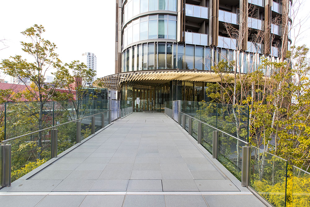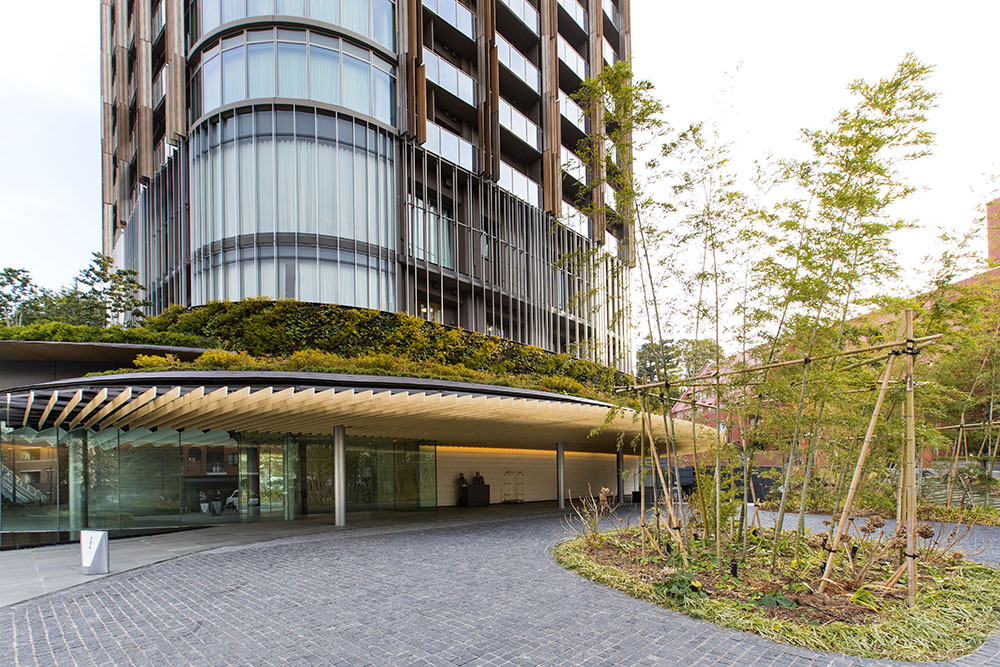 かつて武家屋敷だった土地の記憶を再現する竹林。住む方を迎えるアプローチには、都市の緊張をほどく和の趣を求めた。渡る風に揺れる緑は、建物のミラールーバーにも映り込み、自然の中へいざなうように、内部空間へと導いてゆく。
