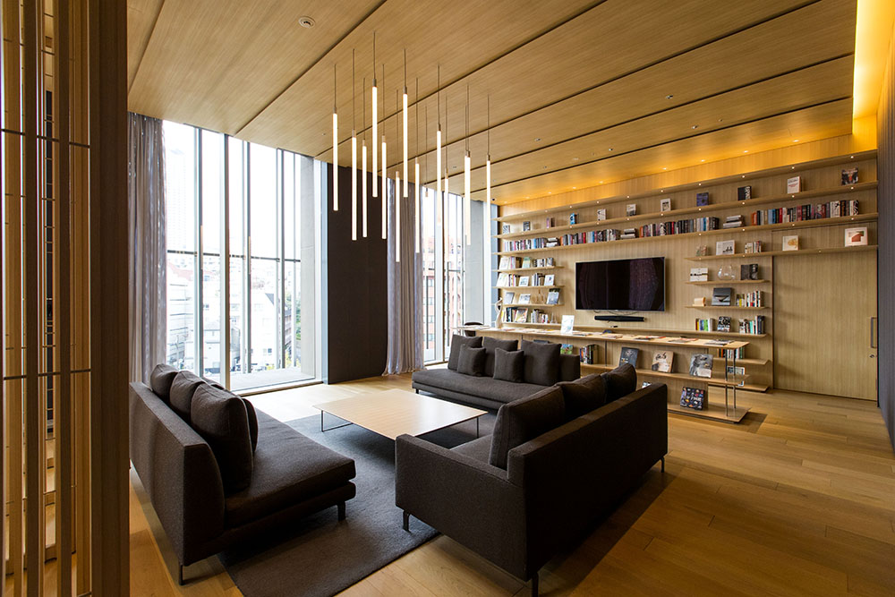 ゆったりと穏やかな時間を過ごすライブラリー。人々が集い、コミュニティを育むパーティライブラリー。ふたつの空間は、格子状の回転式パーテーションでゆるやかに仕切られており、個室やキッチンも用意されている。