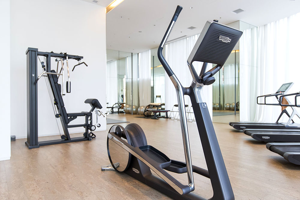 眼下に緑を見渡し、ドレープカーテンやコルク材のフローリングなどやわらかな素材をあしらったフィットネスルーム。デザインにもこだわった先進のマシンを設置し、シャワー室も完備している。