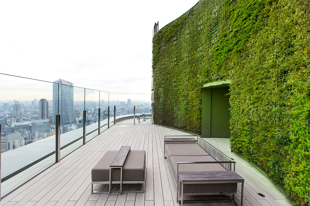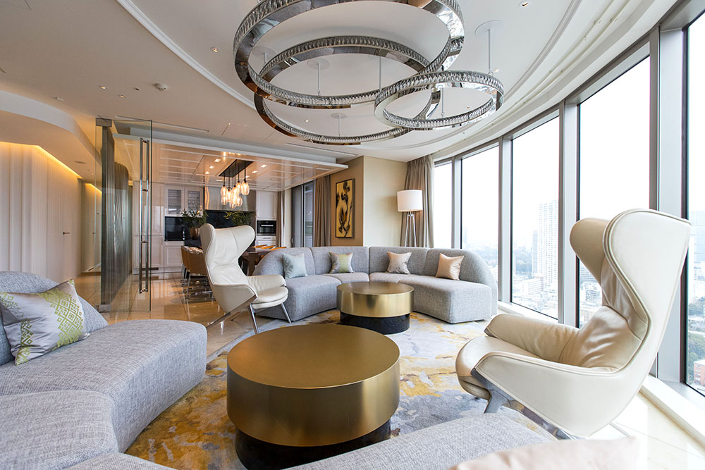 大樹の花や実に鳥が集まる姿と、家族や友人などが集まる姿を重ね合わせてしつらえたビューラウンジ。華やかな美をまとう空間のテーマは「Glamoros & Blooming」。夜が訪れると窓の景色は一変。煌びやかな東京が映し出される。