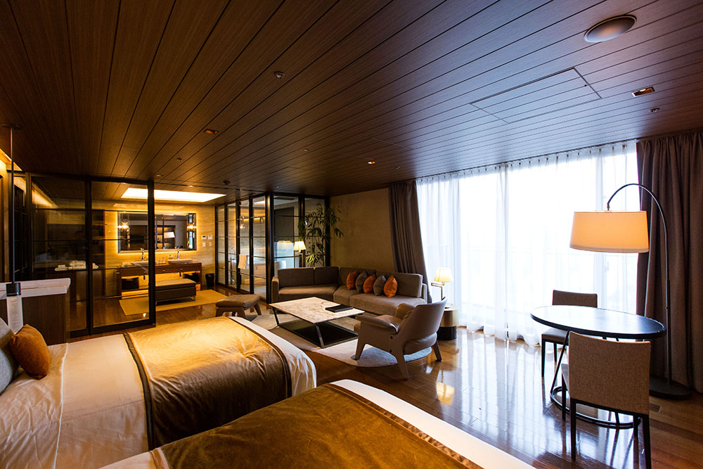 生物たちが木陰や幹にできた洞でひと時の休息をとるように、訪れたゲストが自分の居場所としてくつろげる空間と位置付けた。木の素材や落ち着いた色調を用いたシックな空間。ビューバスも設けている。