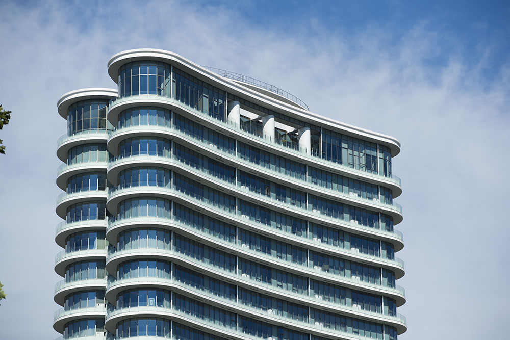 デザイン AOYAMA SYMBOL 曲面のファサードは、敷地に面した通りのゆるやかなカーブに沿った形状にデザイン。青山の街並みと調和する、ひときわ印象的なタワーフォルムで、この街の象徴となる住まいを追求している。