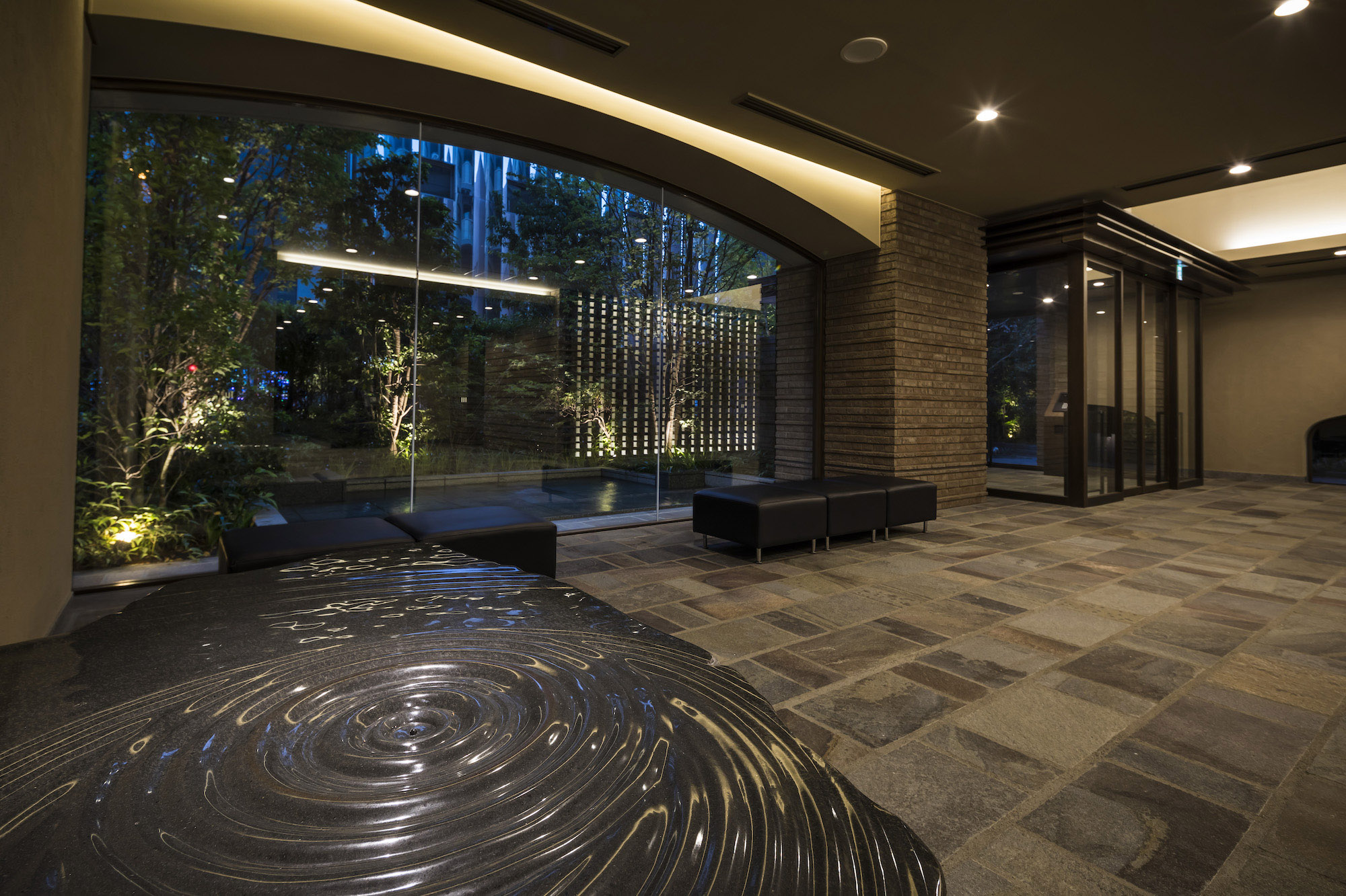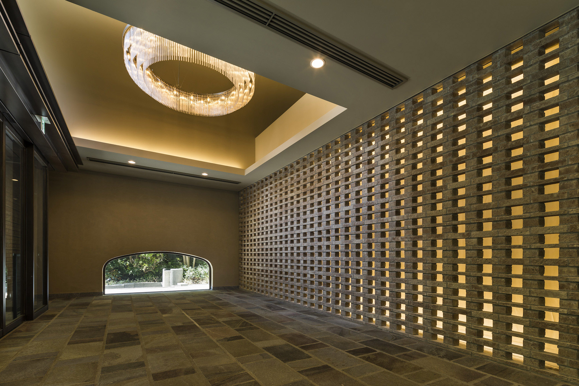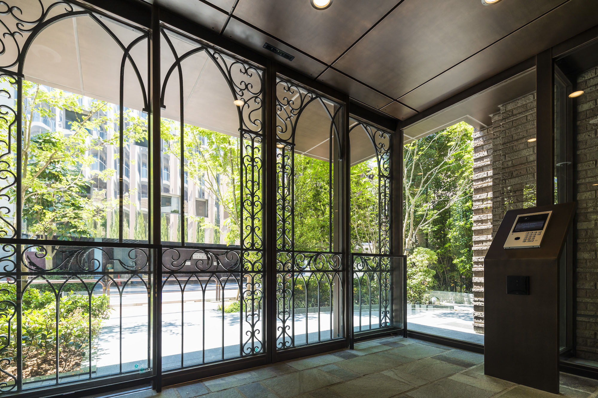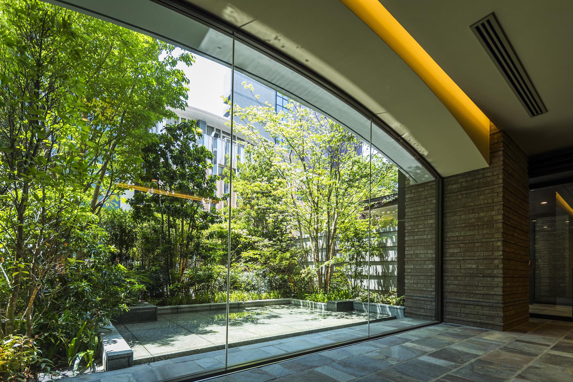 エントランスから一歩、建物のなかへ入ると空気が変わります。そこには光と水と緑にあふれ、レンガやアイアンなど、 駿河台を象徴する素材を使用した装飾が、優美な姿となり設えられています。 いるほどに心地よさが深まっていく、美しい迎賓空間です。