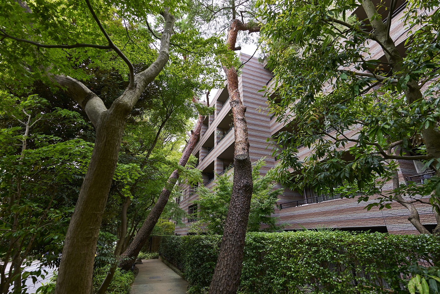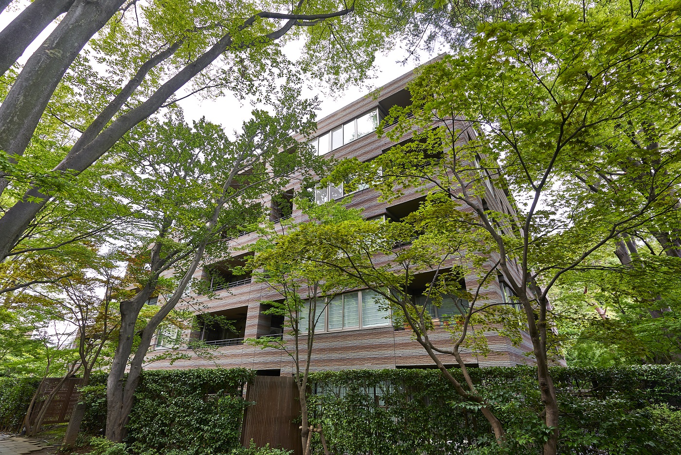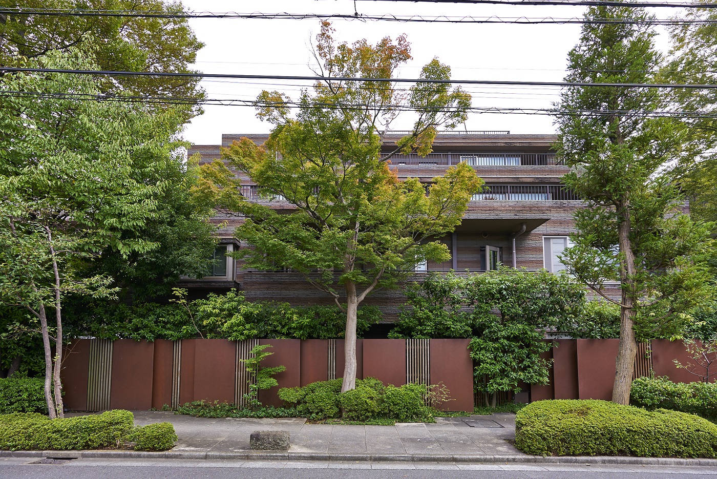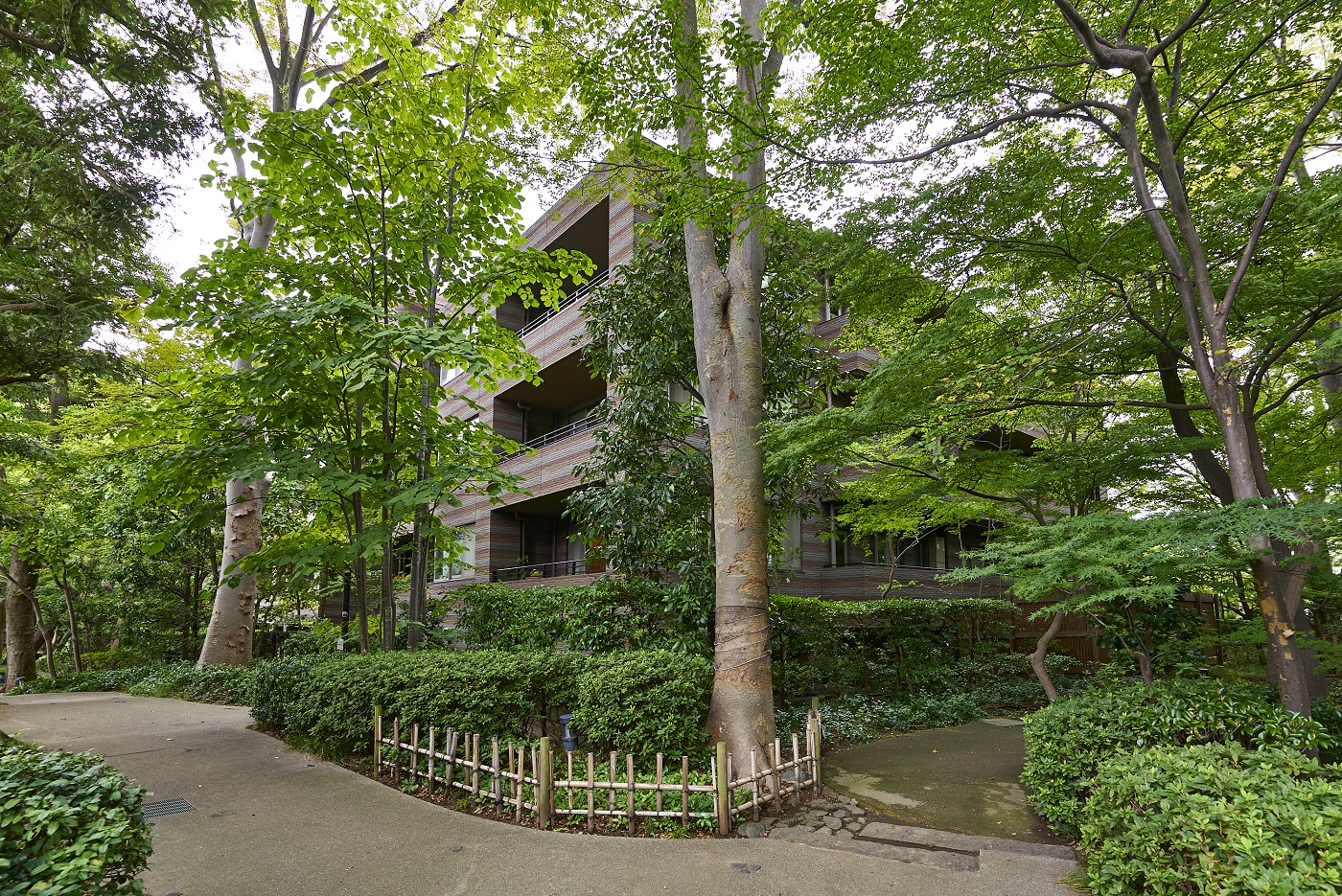 「パークコート二子玉川」は、かつてこの地にあった旧・幽篁堂庭園の、時の記憶を刻んできた樹木、庭石、石造品などの遺構を大切に受け継ぎました。高さを抑えた穏やかな結界として再構築した福島産・白河石の石塀や、地層の色合いをベースとしたオリジナル・ボーダータイルの外壁、艶やかな水盤をイメージさせる御影石を張り詰めたエントランス床など、素材の一つひとつにまで意匠を凝らしたこだわりの造形。街並みとの連続した景観を描き出しながら、樹木のゆるやかな結界を通して見え隠れするアイデンティティ豊かな建物外観は、上質な邸宅地に相応しい優美な佇まいです。