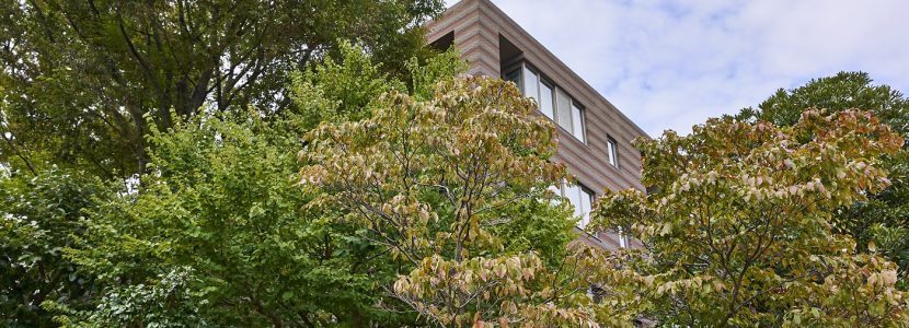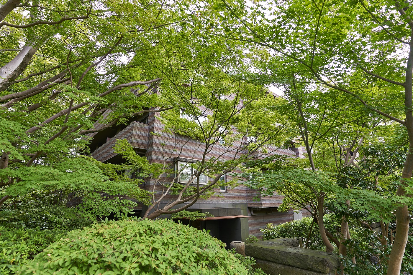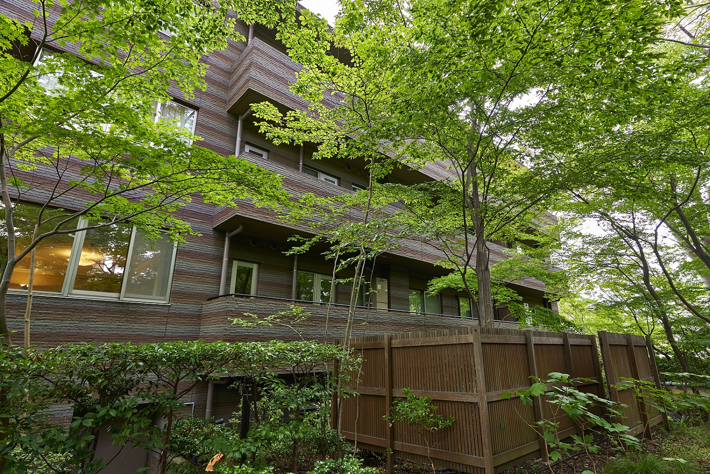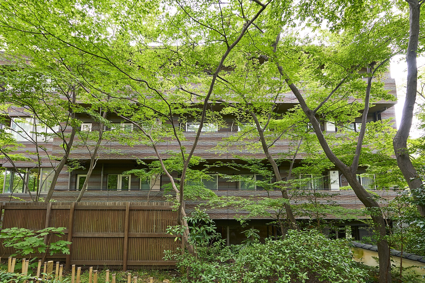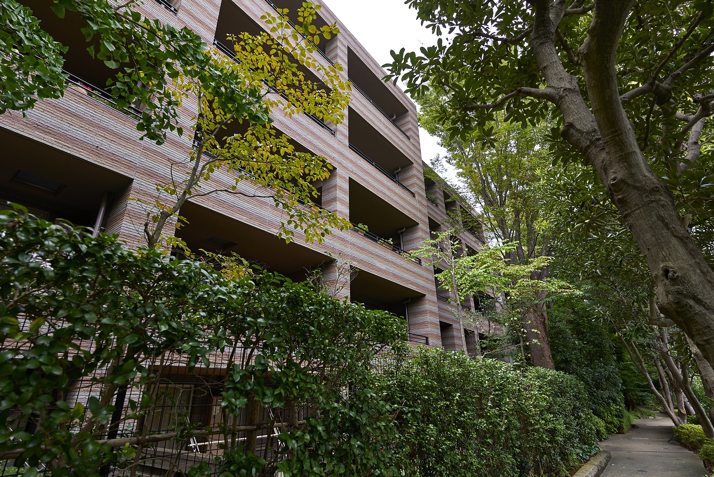 「パークコート二子玉川」は、かつてこの地にあった旧・幽篁堂庭園の、時の記憶を刻んできた樹木、庭石、石造品などの遺構を大切に受け継ぎました。高さを抑えた穏やかな結界として再構築した福島産・白河石の石塀や、地層の色合いをベースとしたオリジナル・ボーダータイルの外壁、艶やかな水盤をイメージさせる御影石を張り詰めたエントランス床など、素材の一つひとつにまで意匠を凝らしたこだわりの造形。街並みとの連続した景観を描き出しながら、樹木のゆるやかな結界を通して見え隠れするアイデンティティ豊かな建物外観は、上質な邸宅地に相応しい優美な佇まいです。