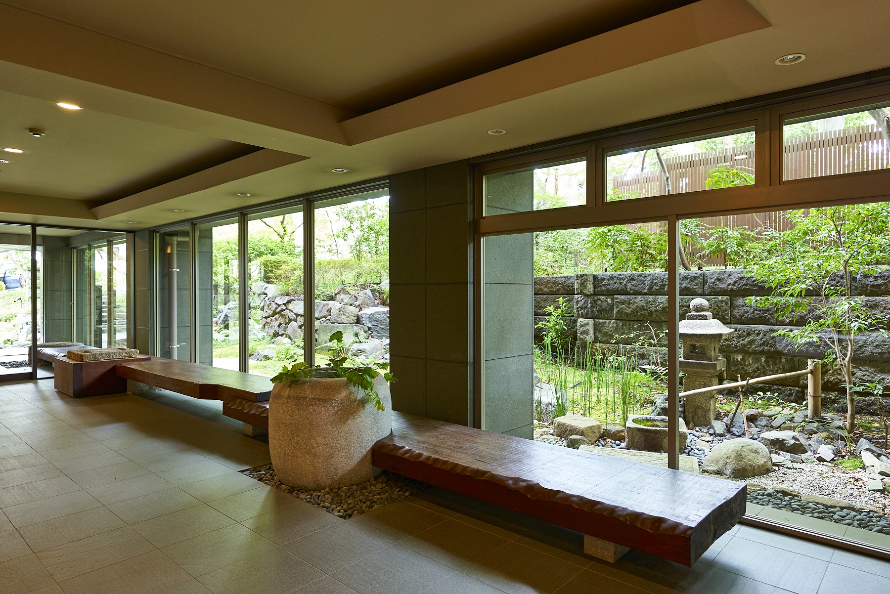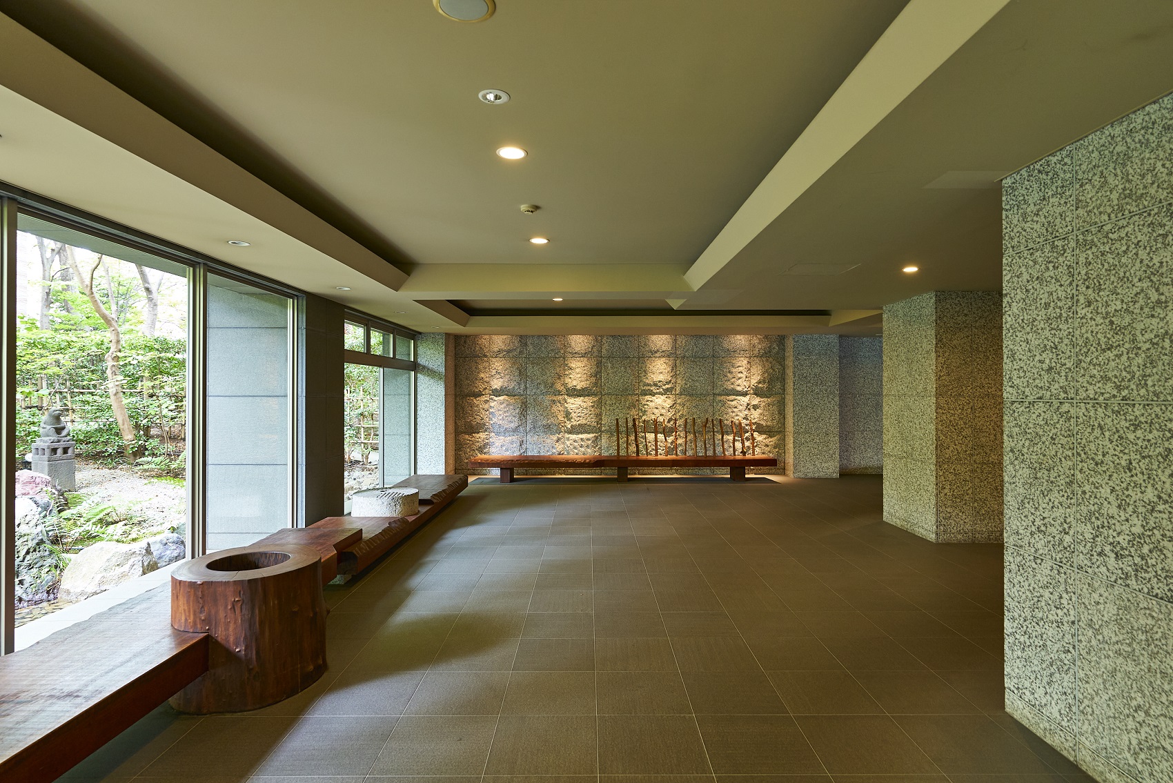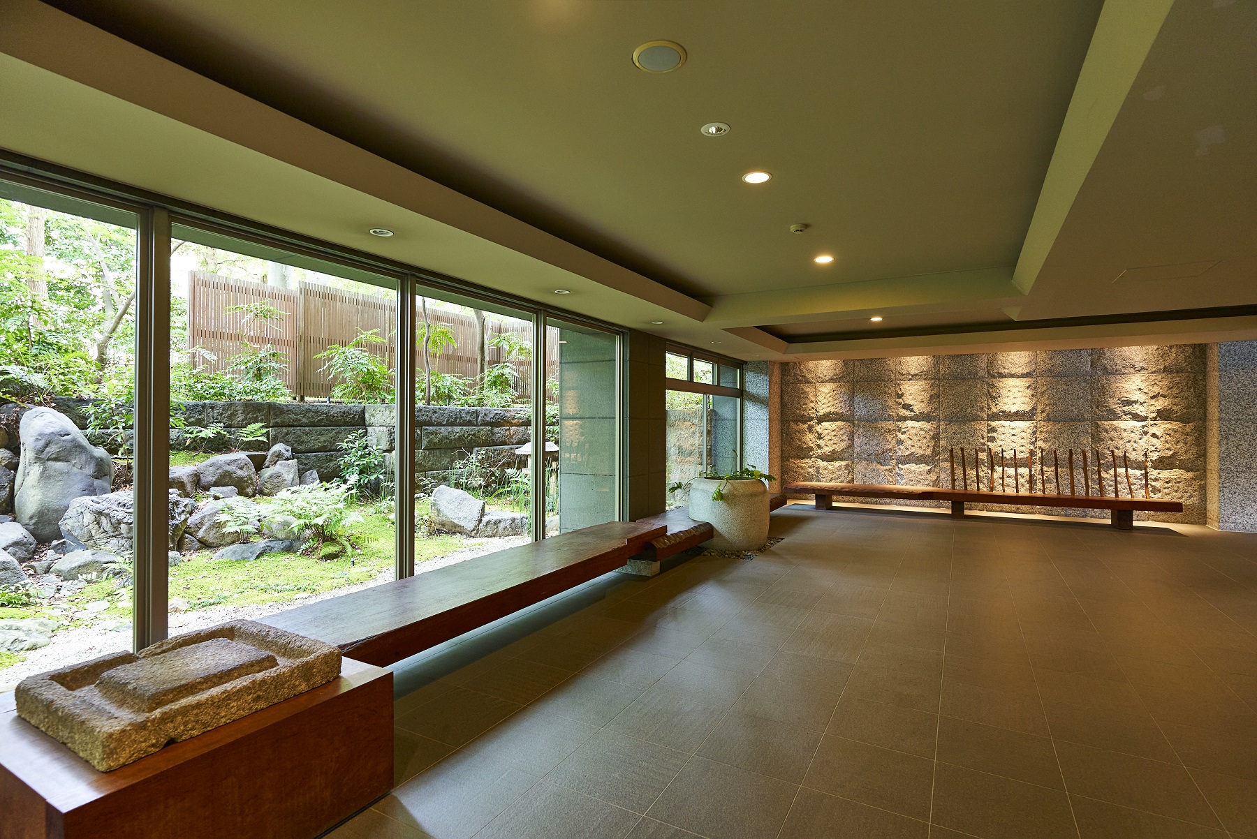 豊かな緑を映しだす水盤を渡って、邸内へと誘うエントランスアプローチ。迎賓庭園の遺構を受け継いだ情緒あふれる石造品等を、オブジェとして配したエントランスラウンジ。その大きく開かれた視界には、樹木の緑と水盤の煌めきに彩られた「枠美の庭」の景観美が、野趣あふれる石肌と苔庭が織りなす「絶佳の社」の幽玄の世界が、絵画のように広がっています。住まう人を、そして訪れる人を、邸内へとおおらかに誘う迎賓の造形美です。