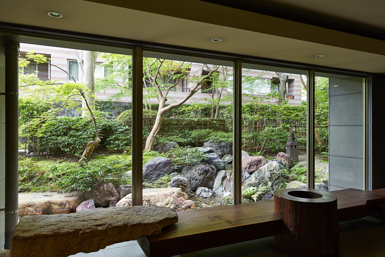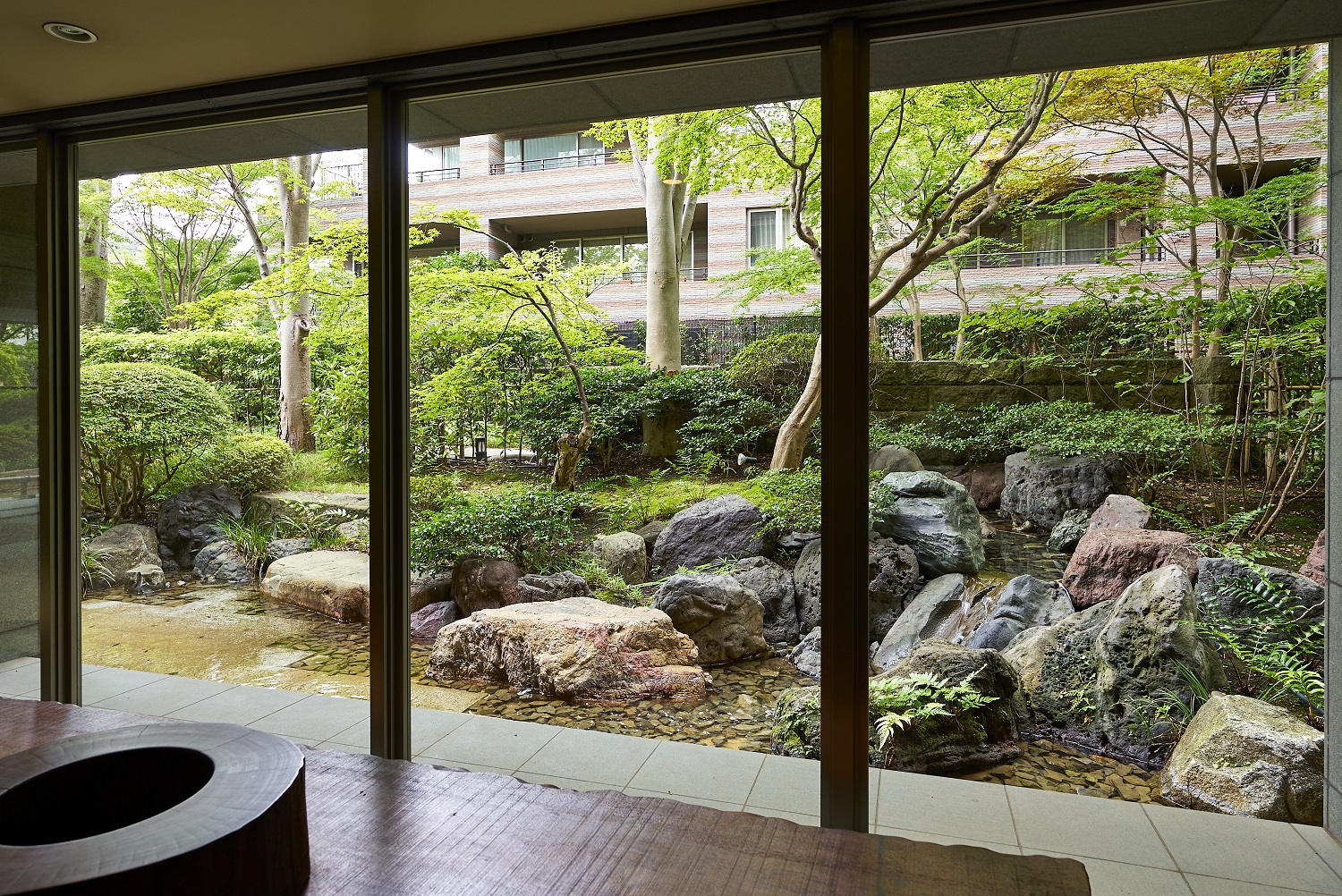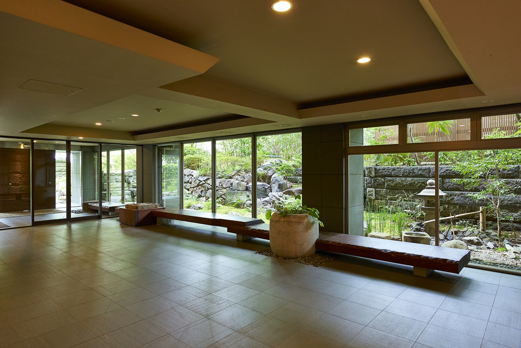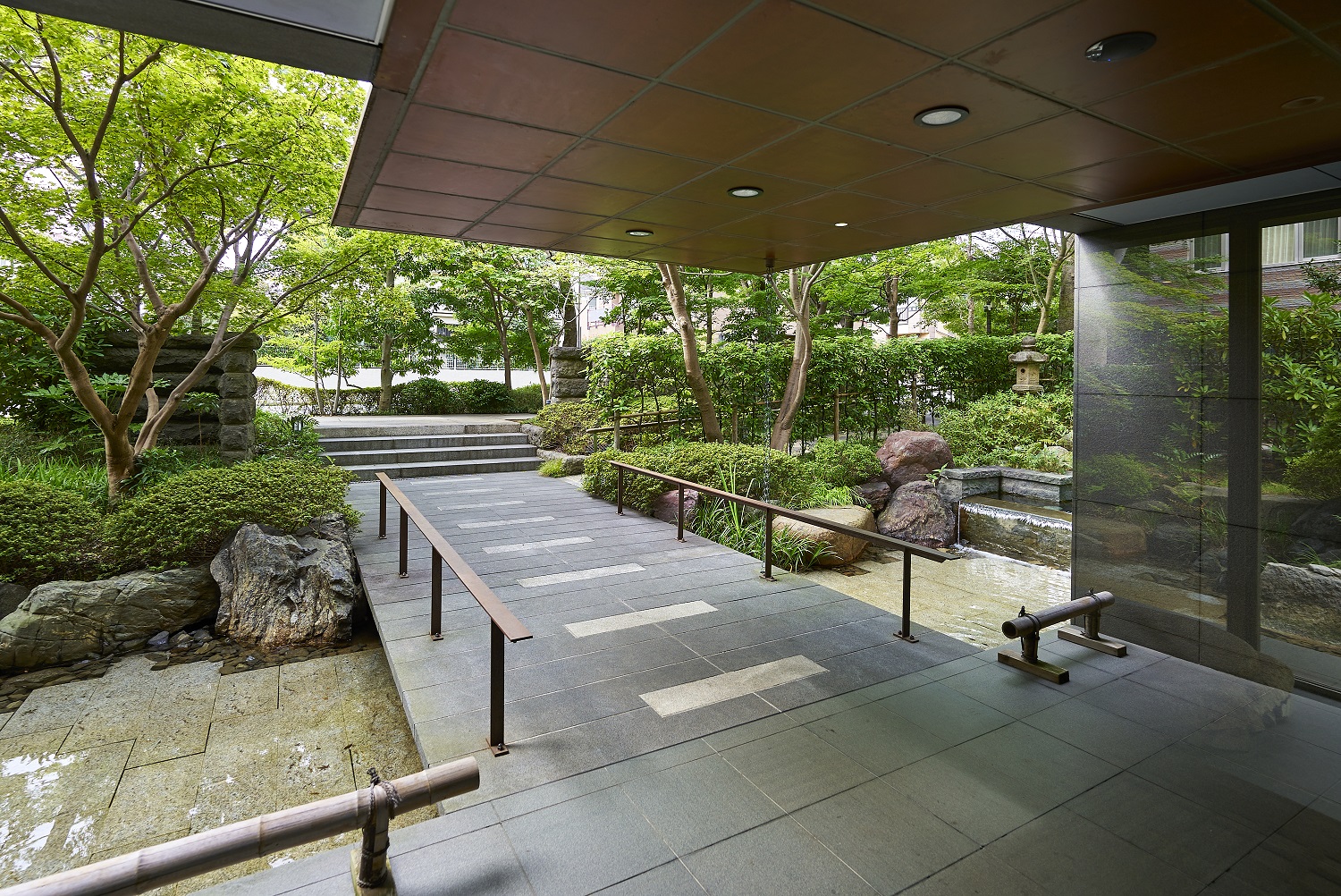 豊かな緑を映しだす水盤を渡って、邸内へと誘うエントランスアプローチ。迎賓庭園の遺構を受け継いだ情緒あふれる石造品等を、オブジェとして配したエントランスラウンジ。その大きく開かれた視界には、樹木の緑と水盤の煌めきに彩られた「枠美の庭」の景観美が、野趣あふれる石肌と苔庭が織りなす「絶佳の社」の幽玄の世界が、絵画のように広がっています。住まう人を、そして訪れる人を、邸内へとおおらかに誘う迎賓の造形美です。