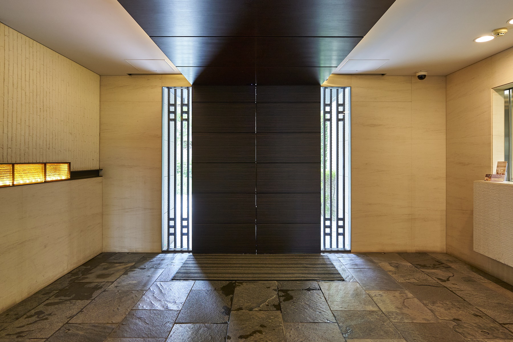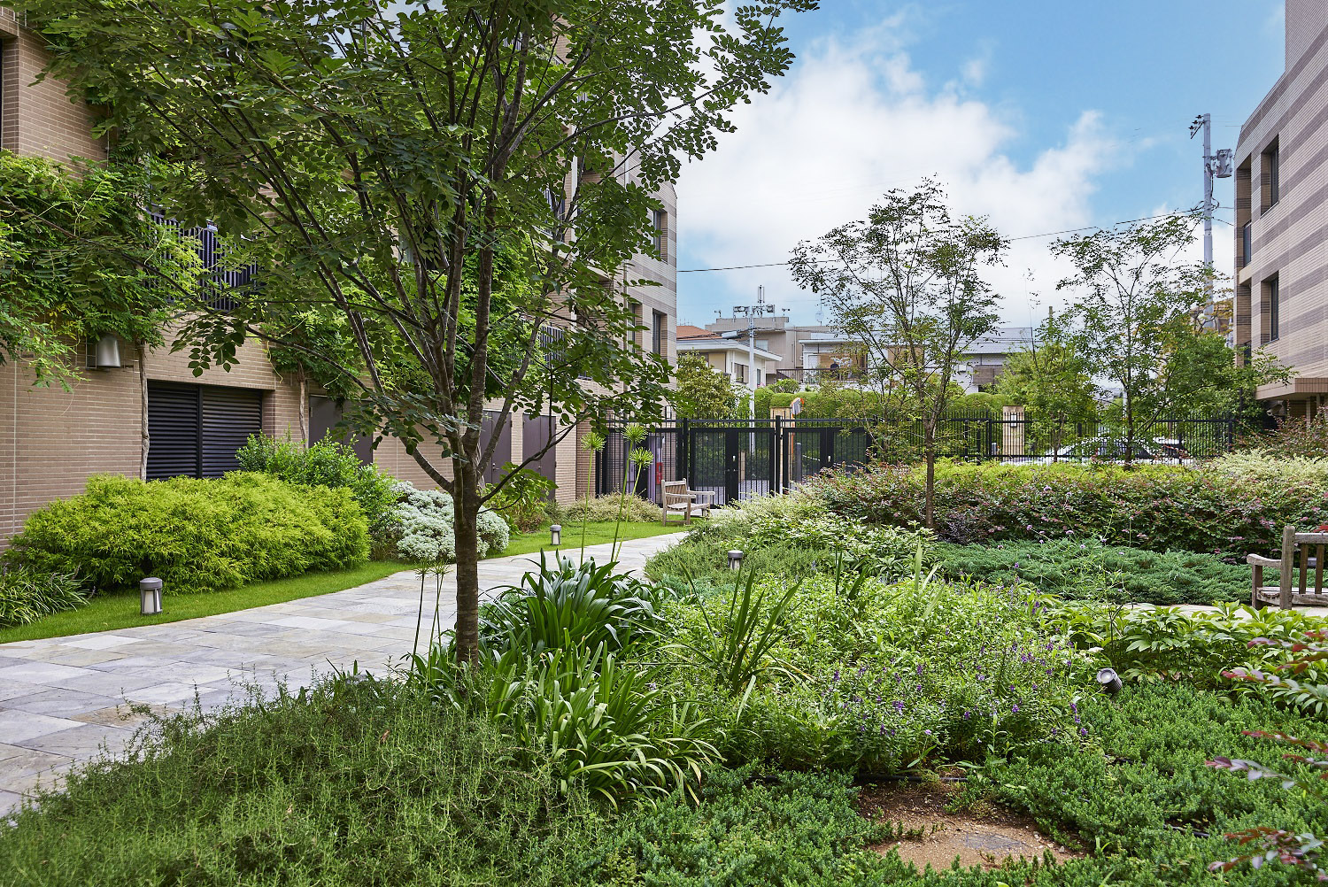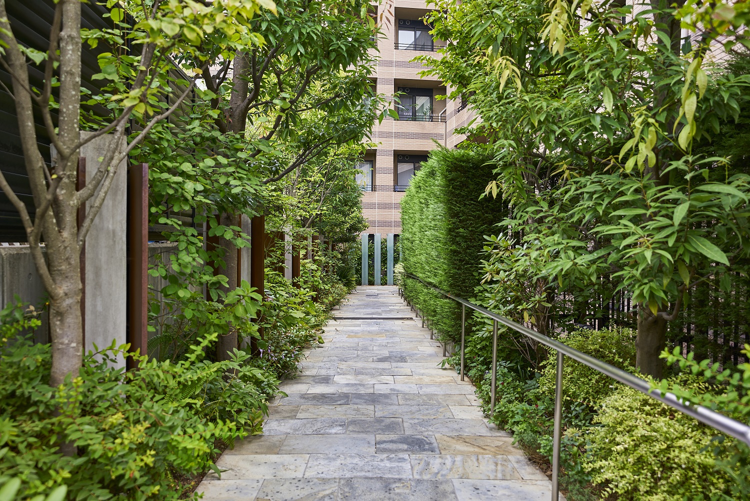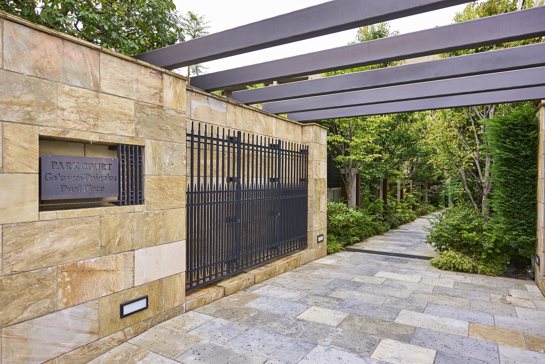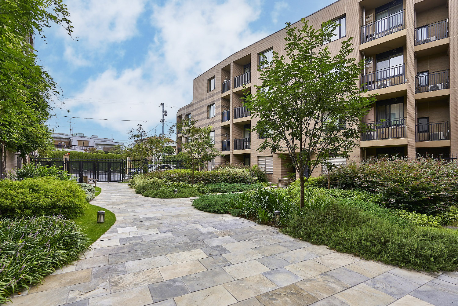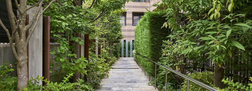 厳選した石の素材とパーゴラが織り成す気品あふれるゲート、芸術的なオブジェと鮮やかな緑が建物内部へと導くアプローチ、デザインウォールや間接照明が美しいエントランスホール、そして色とりどりの植物と石畳がドラマチックなシーンを演出する中庭「シーケンス・ガーデン」。天然石の床でつながった一連の空間は、住まう方や訪れる方をパブリックスペースからプライベートスペースへと優しく誘います。