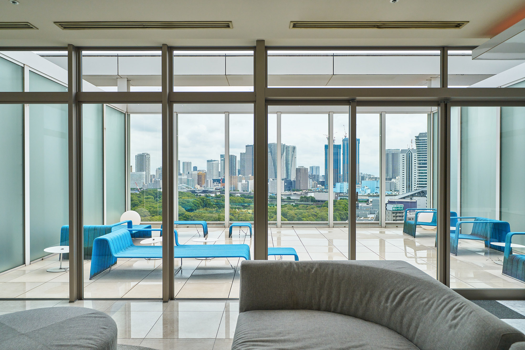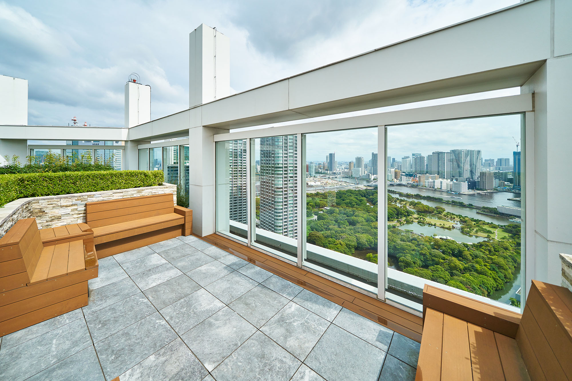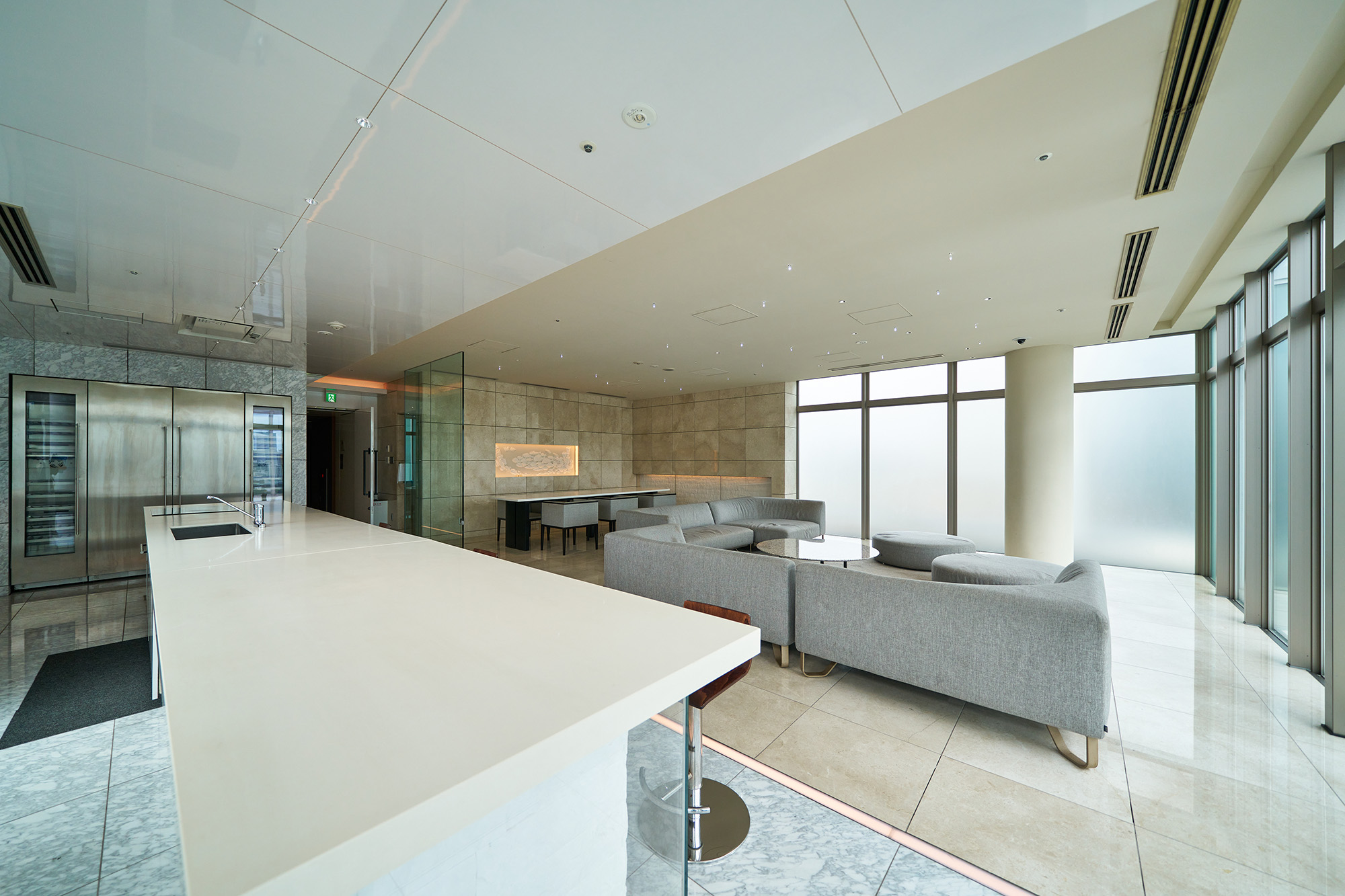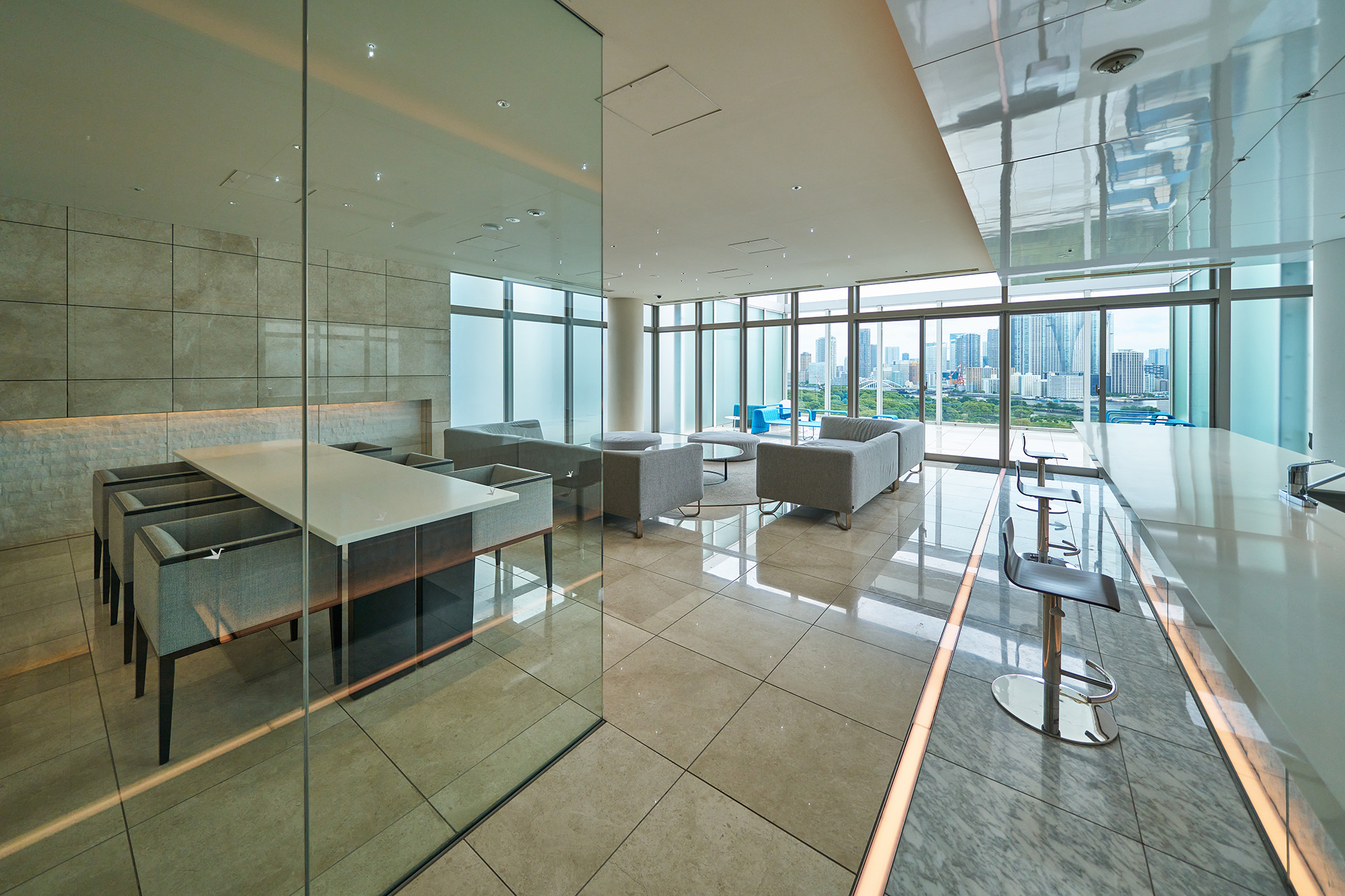日常の寛ぎの場としてはもちろん、カンファレンススペースとしても、また、ゲストをお招きしてのパーティーにもご利用いただけます。キッチンも設置。パーティーの合間には、浜離宮テラスに出て、緑の風に涼むことも。