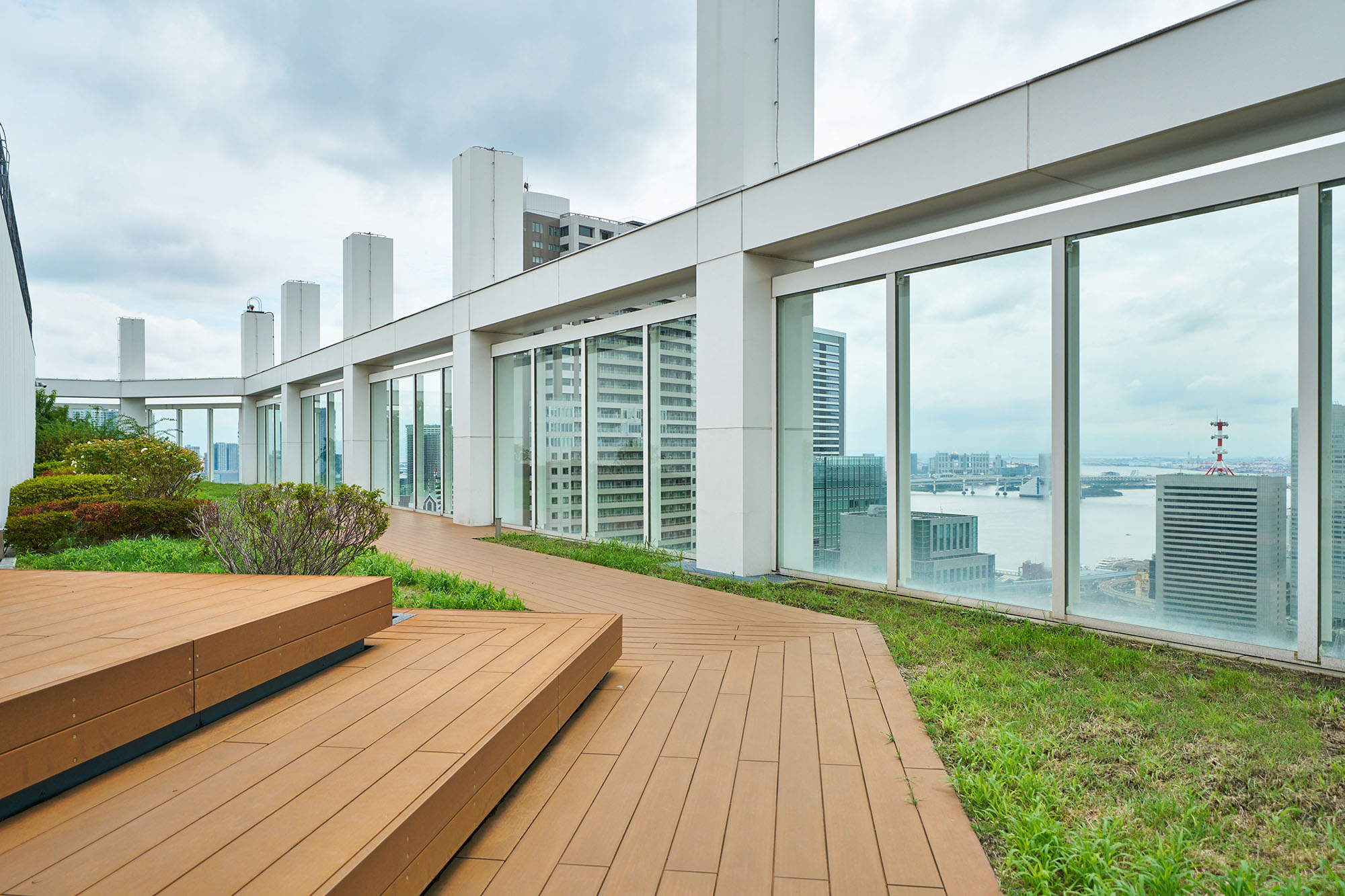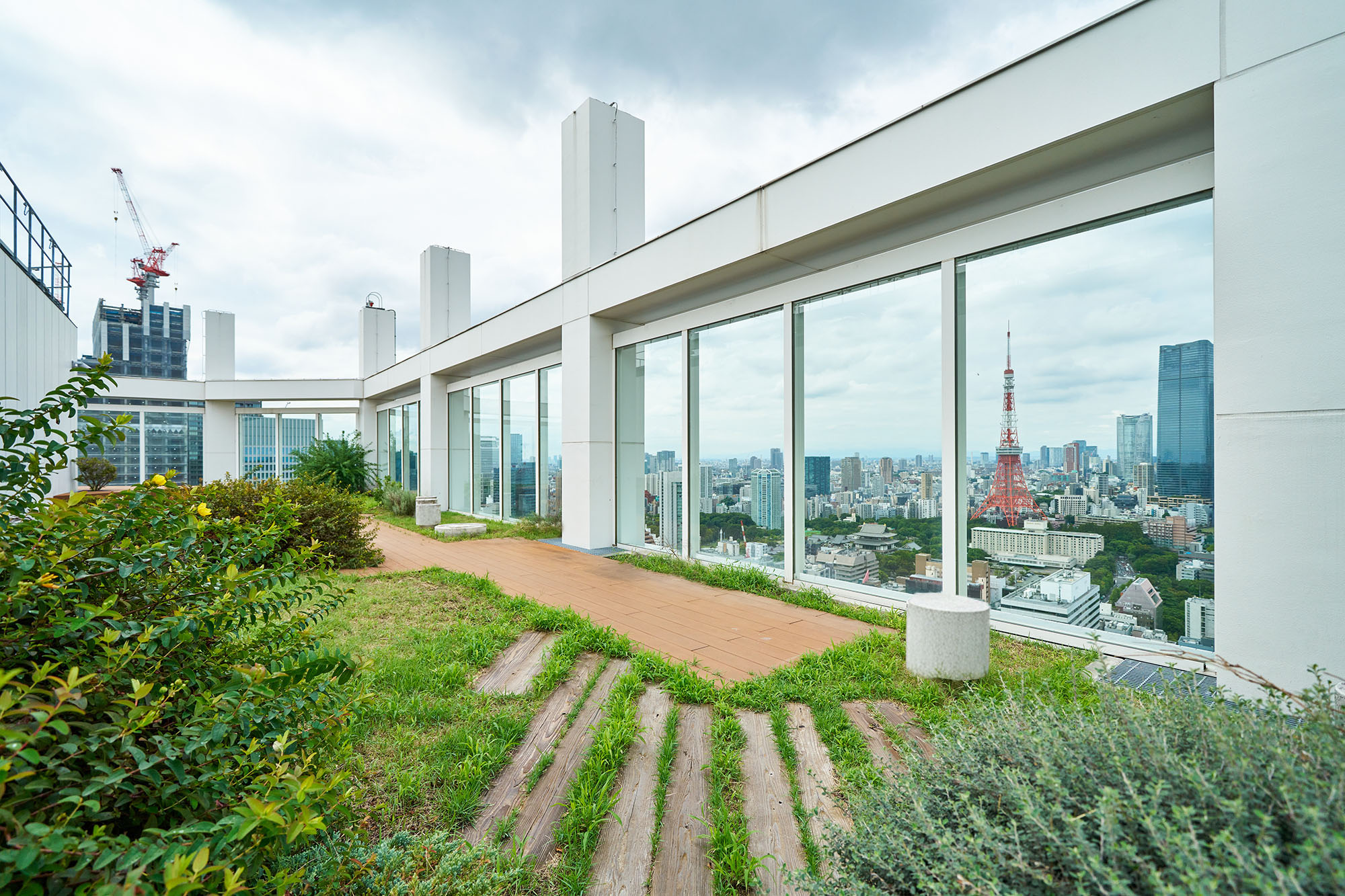 地上37階建ての屋上にある空中庭園。360°の眺望をたのしみながら回遊できます。浜離宮恩賜庭園を見下ろせる、小高い丘などもあります。夜には、フットライトの低めの照明で、美しい夜景とともに素敵な雰囲気に。