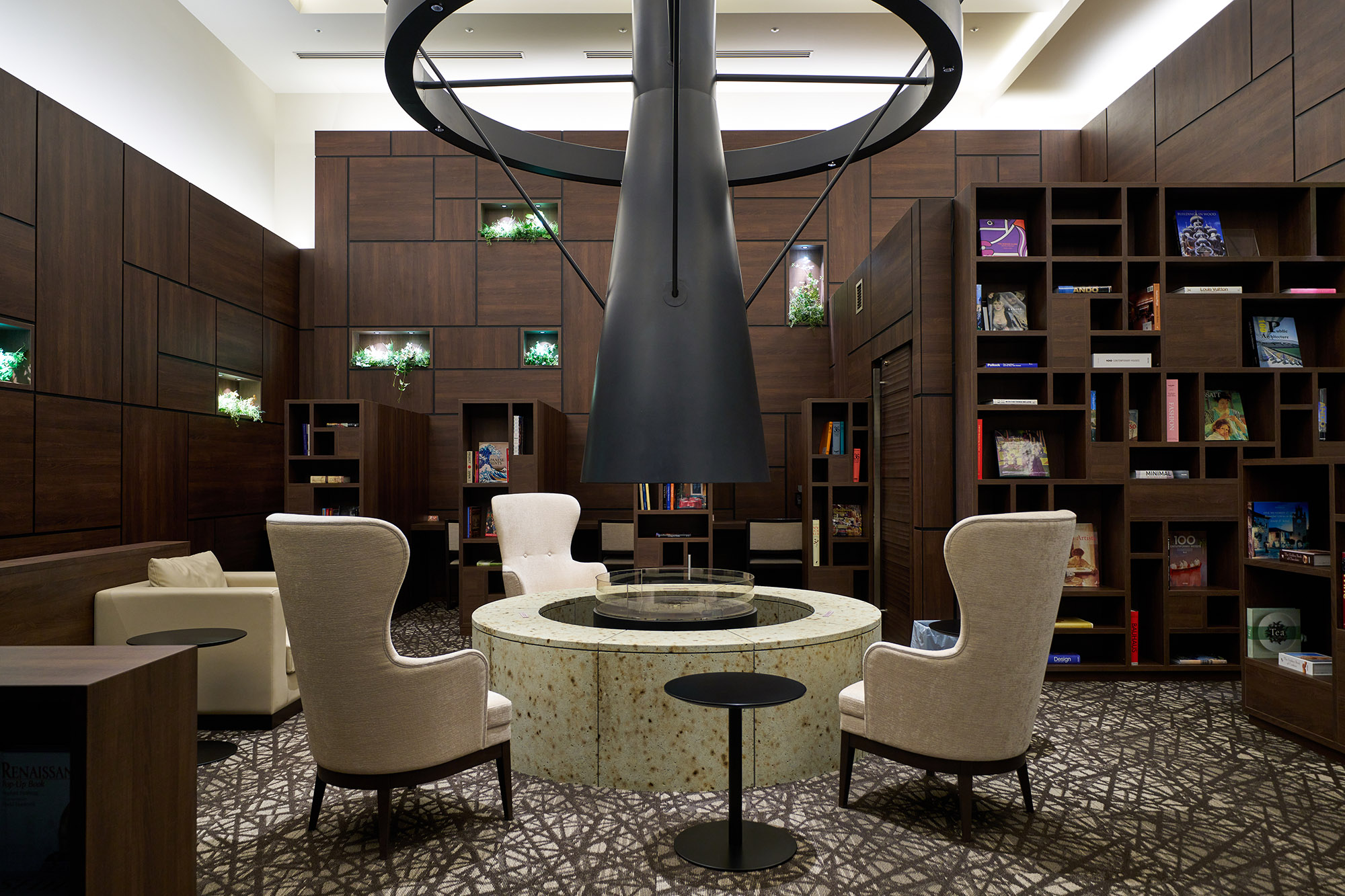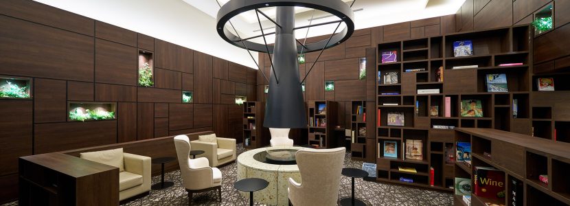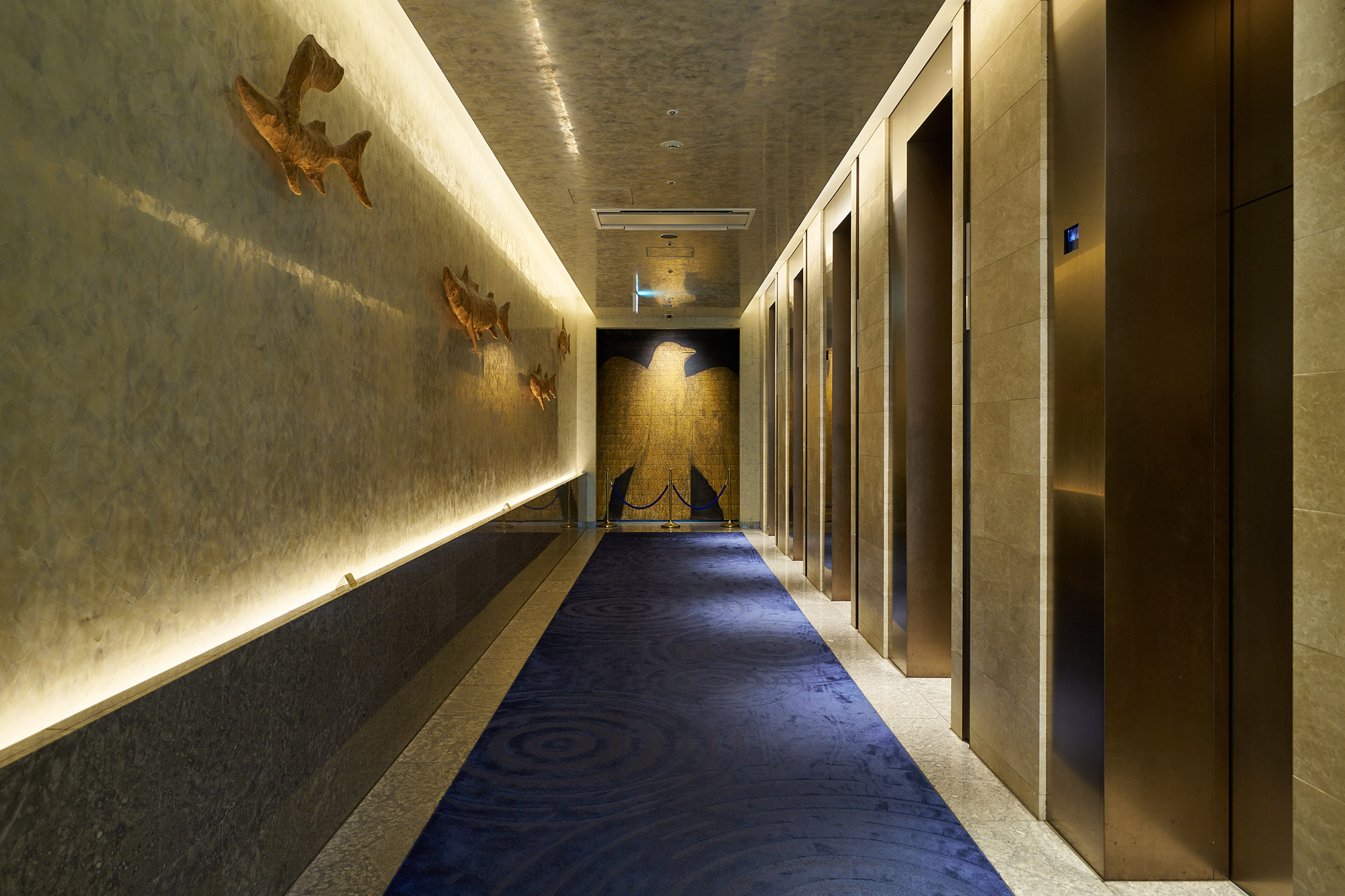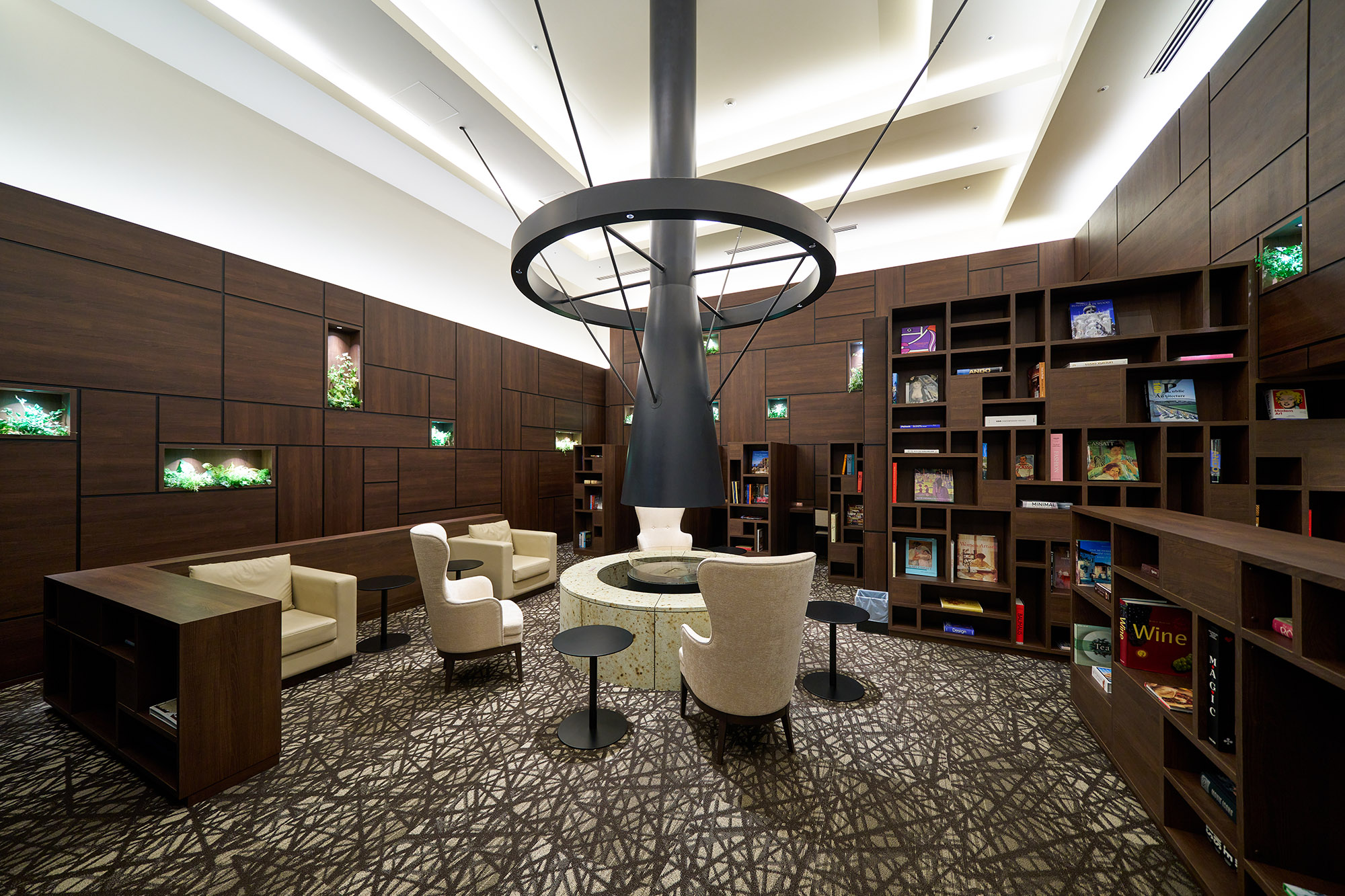 緑、水、空を享受できる浜離宮恩賜庭園のイメージをこの空間に。2層吹き抜けで広々とした爽やかなグランドラウンジは、夜は照明により落ち着きをもたらします。内に居ながらにして外の植栽に四季を感じる、日本の縁側的なくつろぎを。水盤の水波紋による光のゆらぎがラウンジの壁に穏やかに映り込みます。