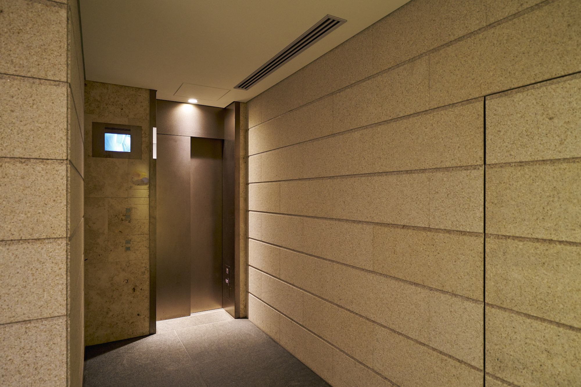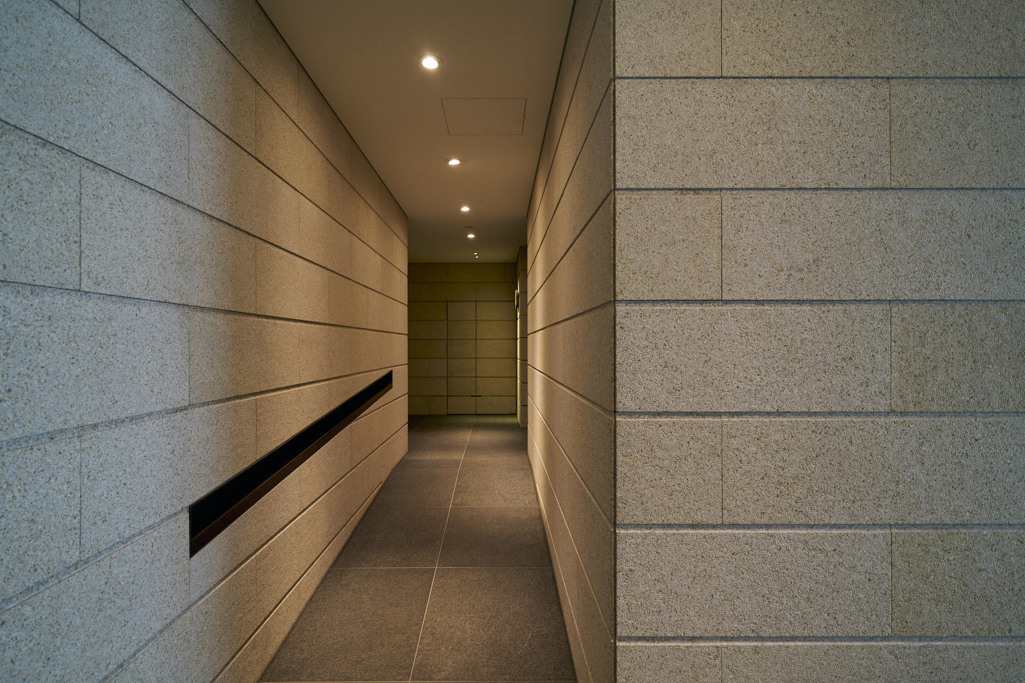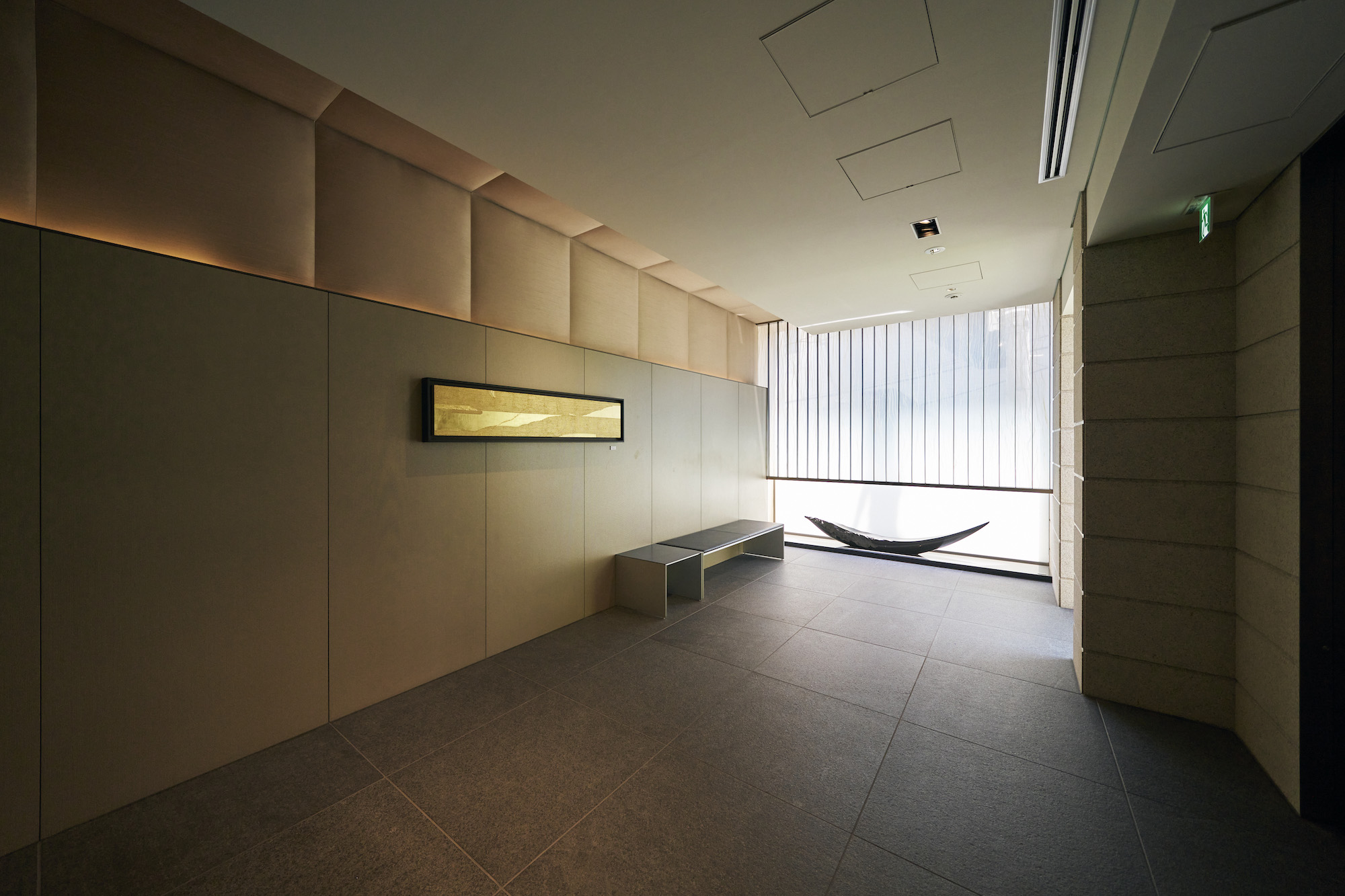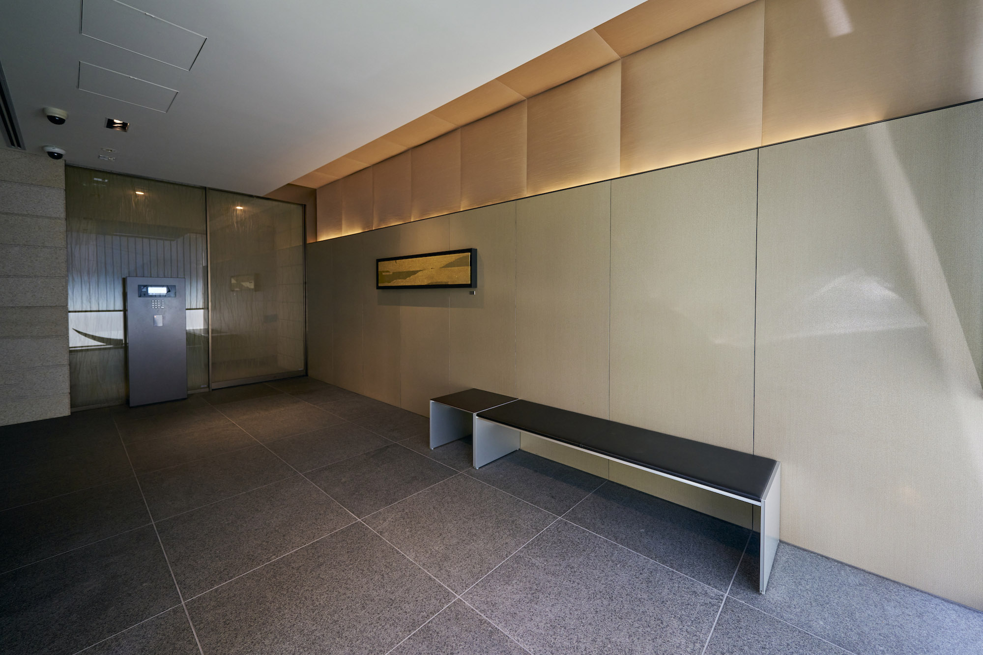 エントランスホールの正面の壁面を彩るのは、質感豊かなイタリア製超大判タイル。上部には、ゴールド系の織物を用いた緞子張りを施し、さりげない和洋折衷の美が表現されています。南側には、黒の縦格子とファブリックガラスが織りなす印象的な景色。雪見障子を模した意匠が魅せる、格子の陰影と和紙を透かしたような光の演出が見事です。エントランスホールの美意識や空気感を継承しながら、私邸へ到る優雅なシークエンスを描くエレベーターホールや内廊下は、内と外をしなやかに結ぶ特別なプライベート領域であるために、選び抜かれた素材と意匠を細部まで積み重ねた、高級感あふれる空間となっています。
