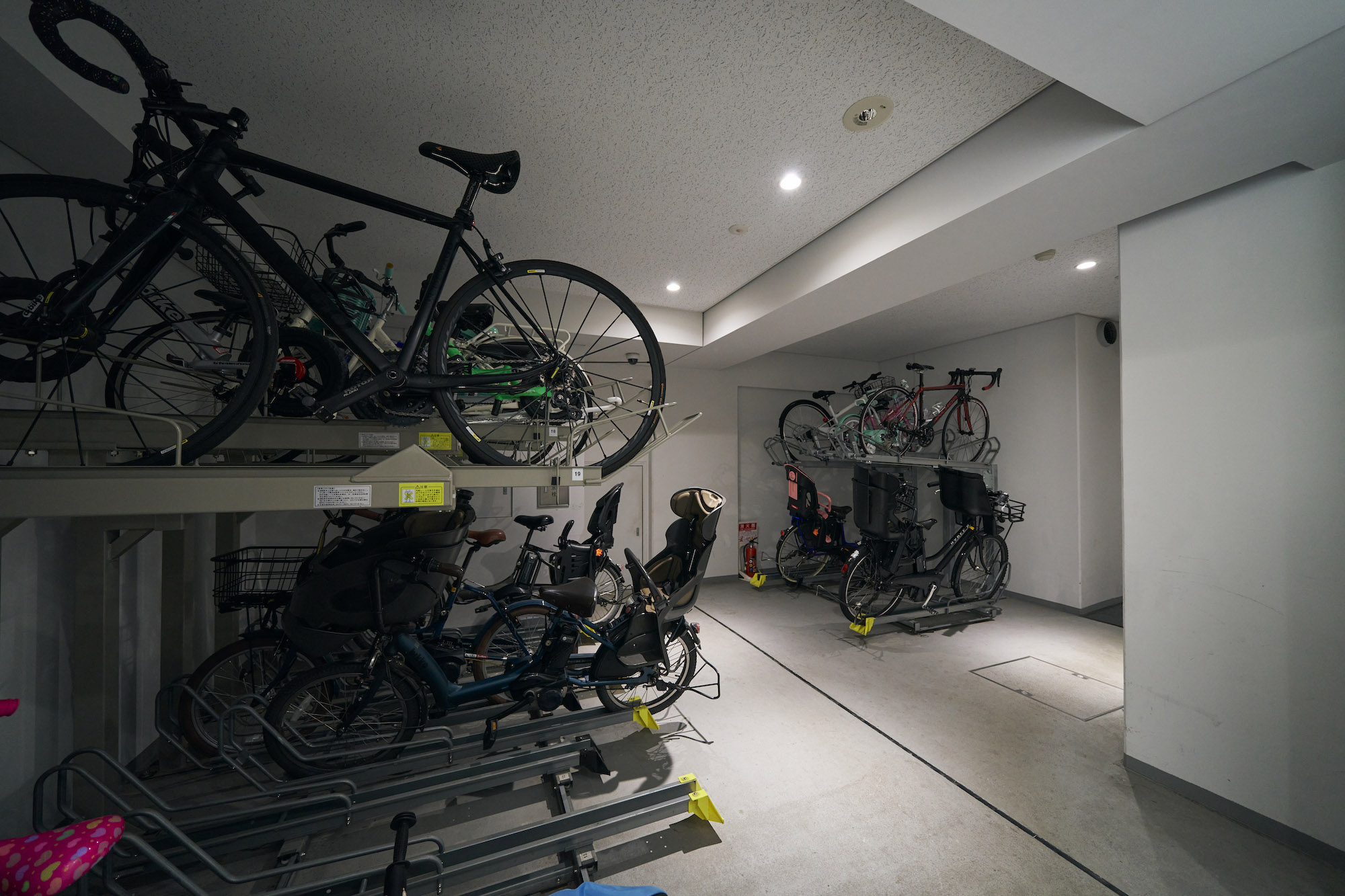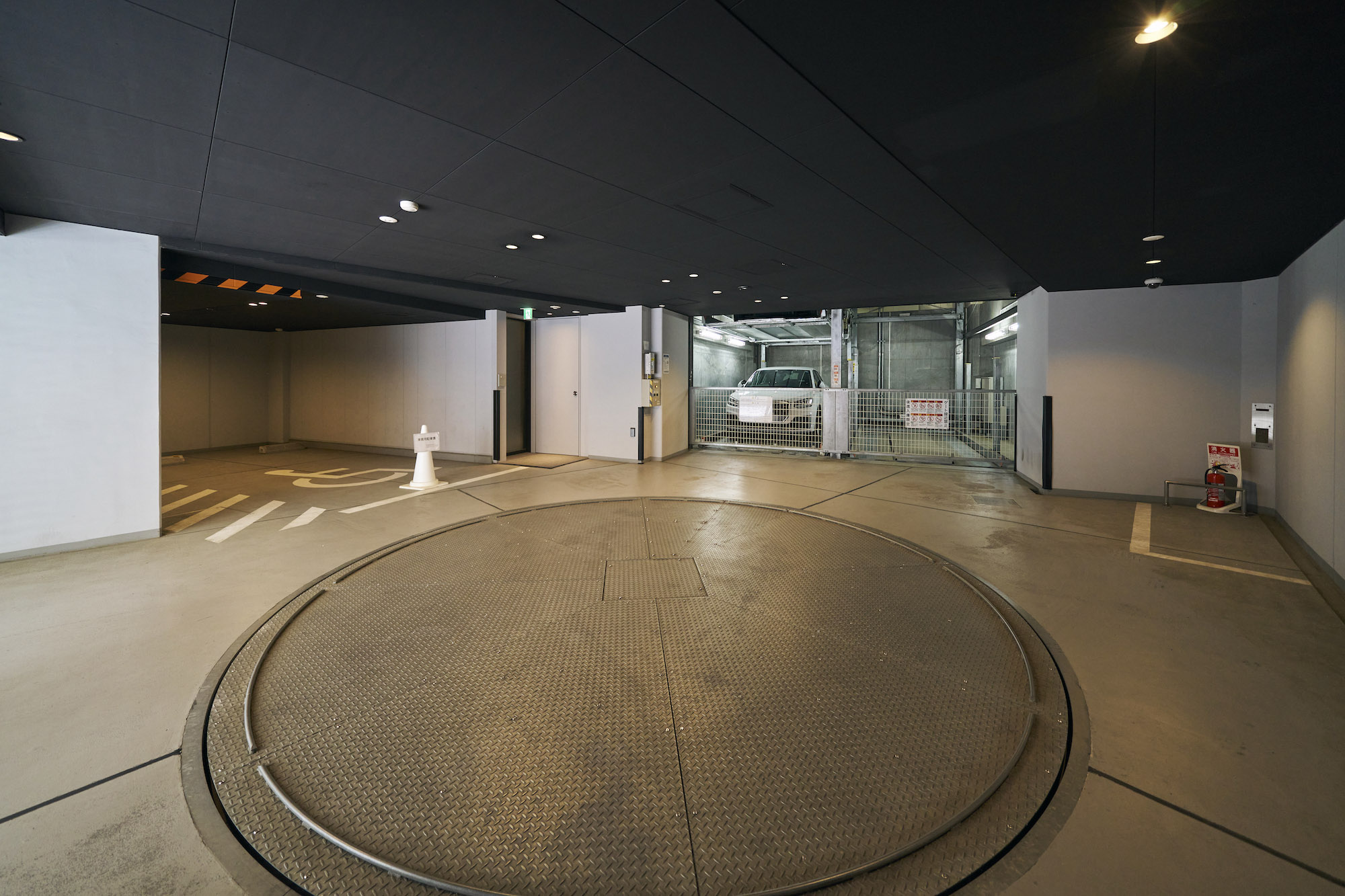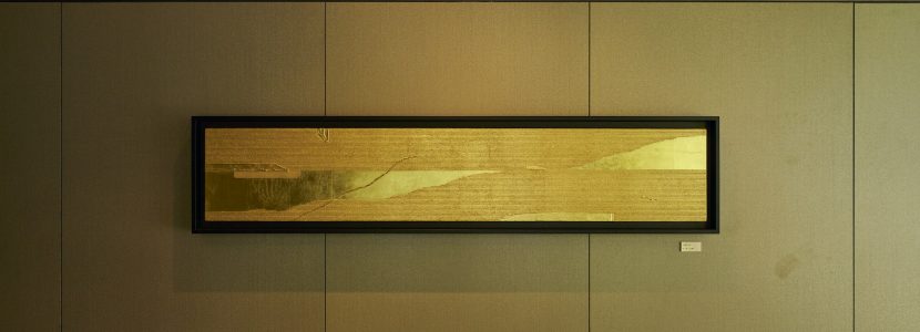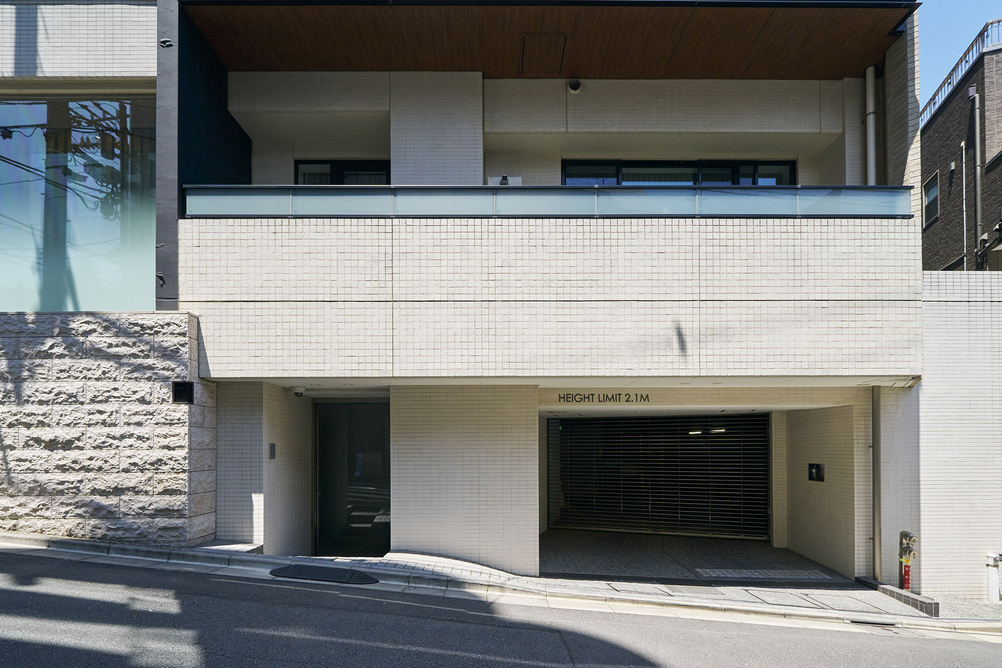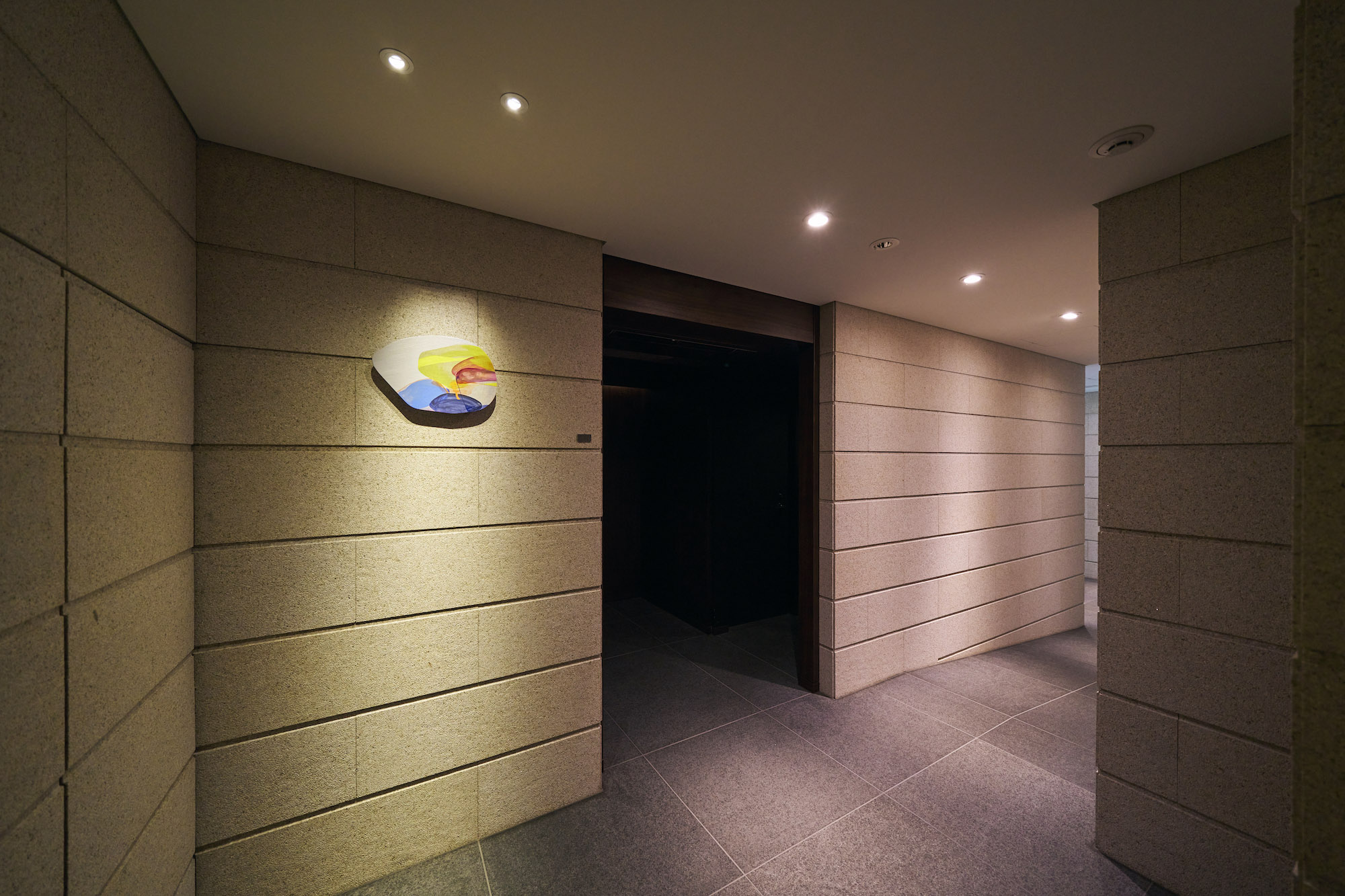 エントランスホールの正面の壁面を彩るのは、質感豊かなイタリア製超大判タイル。上部には、ゴールド系の織物を用いた緞子張りを施し、さりげない和洋折衷の美が表現されています。南側には、黒の縦格子とファブリックガラスが織りなす印象的な景色。雪見障子を模した意匠が魅せる、格子の陰影と和紙を透かしたような光の演出が見事です。エントランスホールの美意識や空気感を継承しながら、私邸へ到る優雅なシークエンスを描くエレベーターホールや内廊下は、内と外をしなやかに結ぶ特別なプライベート領域であるために、選び抜かれた素材と意匠を細部まで積み重ねた、高級感あふれる空間となっています。