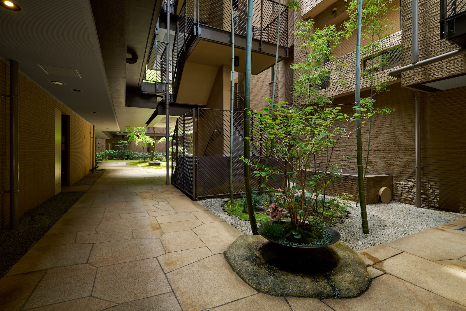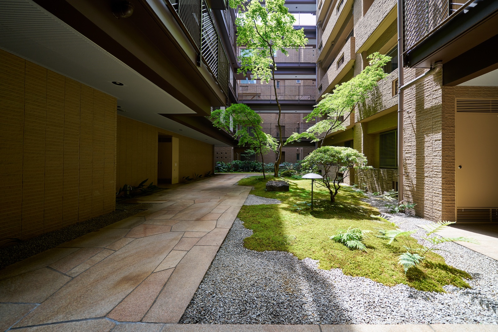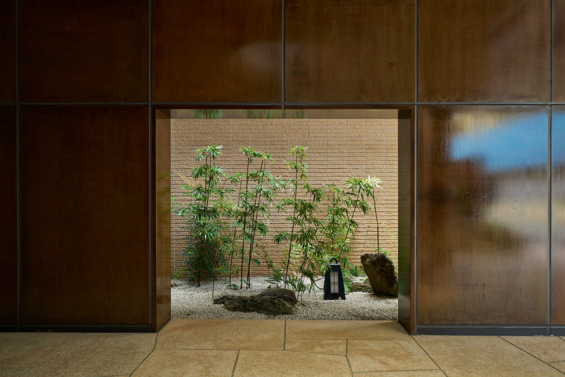 ファサードからエントランスホール、さらに回廊へと続く方形乱貼りのさび石は、通路としてではなく、心地よい時を過ごす庭として趣ある空間を創出。荘重な佇まいを披露するさび色のコールテン鋼仕上げのキャノピーが彩りを添え、天井に設けた円形のトップライトから降り注ぐ光が、ホールを柔らかく照らしだします。木目の美しいウエンジの扉から一歩足を踏み入れると、季節の華やぎを添えた清々しい「孟宗竹の庭」がお出迎え。そしてその先には、心が洗われるような美しい中庭が広がります。中心には見事なモミジ、足元には苔類を植栽、苔の良さを引きたたせるために起伏が描かれ、長い歴史を刻む灯籠の基礎石を配置。深い味わいを醸しだす庭園が、回廊を行き交うたびに、心を穏やかに包み込んでくれます。
