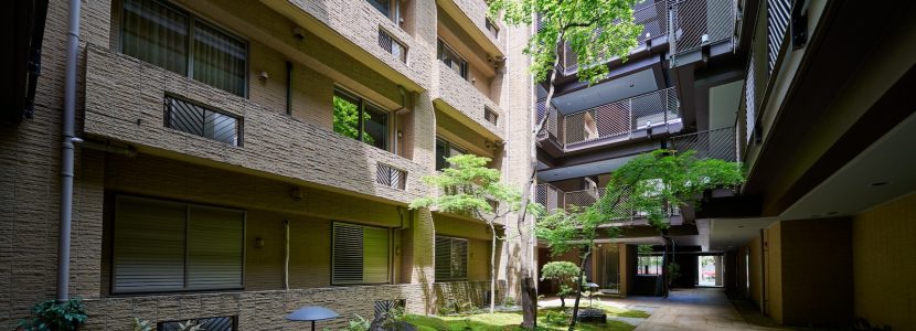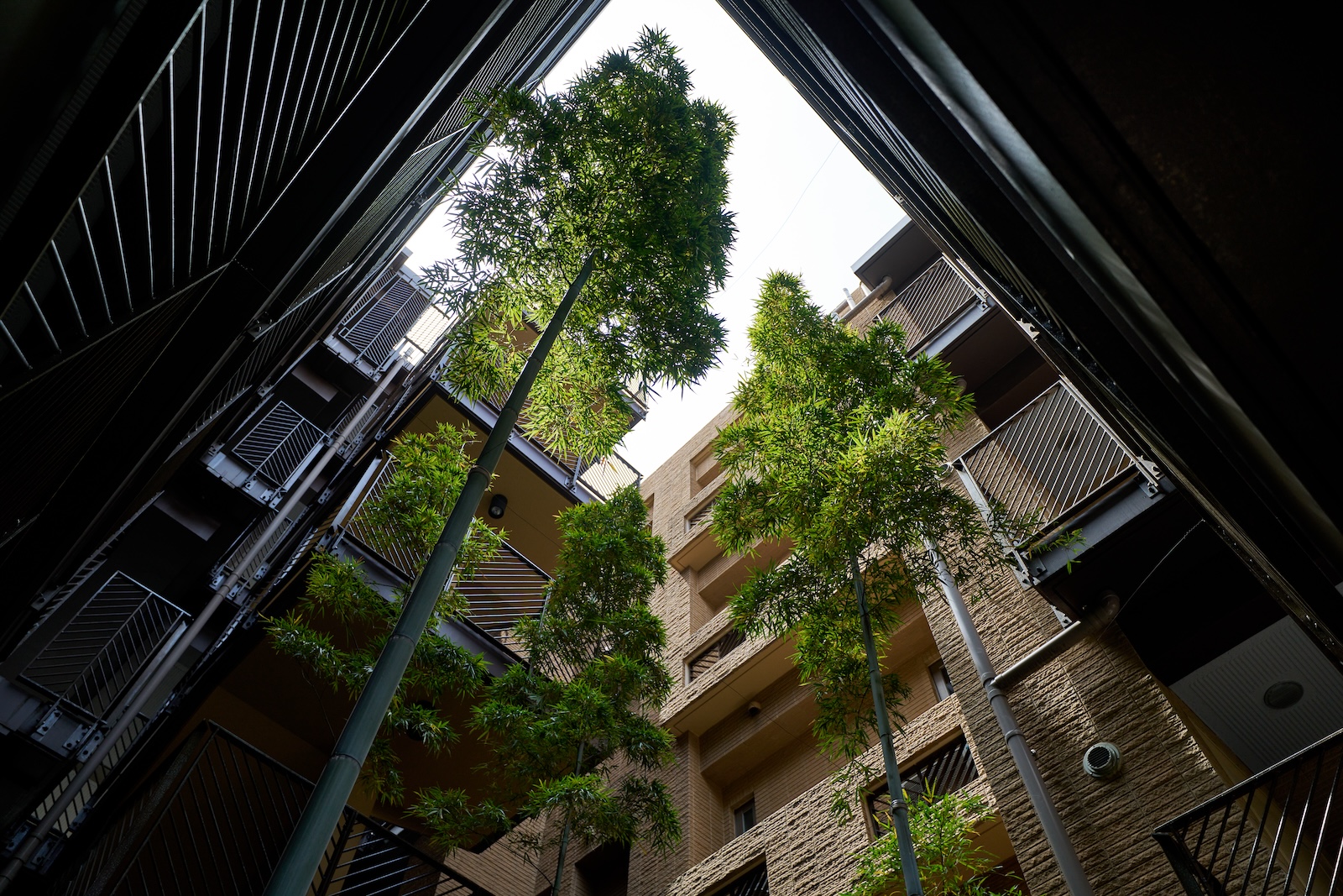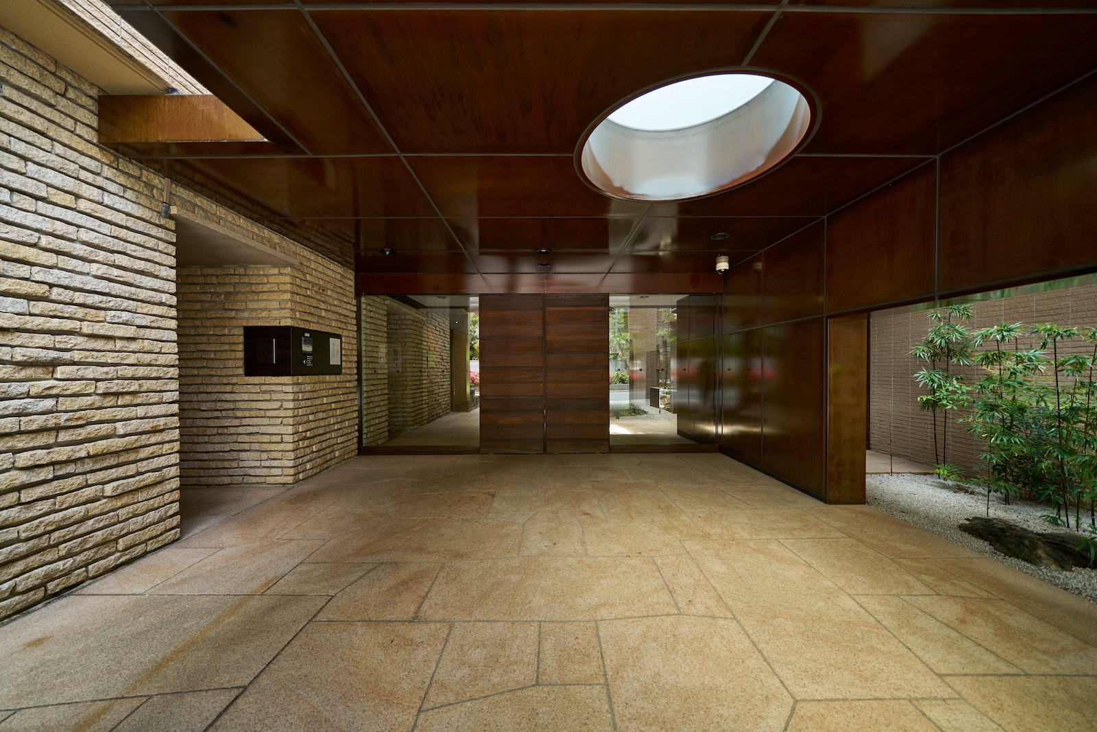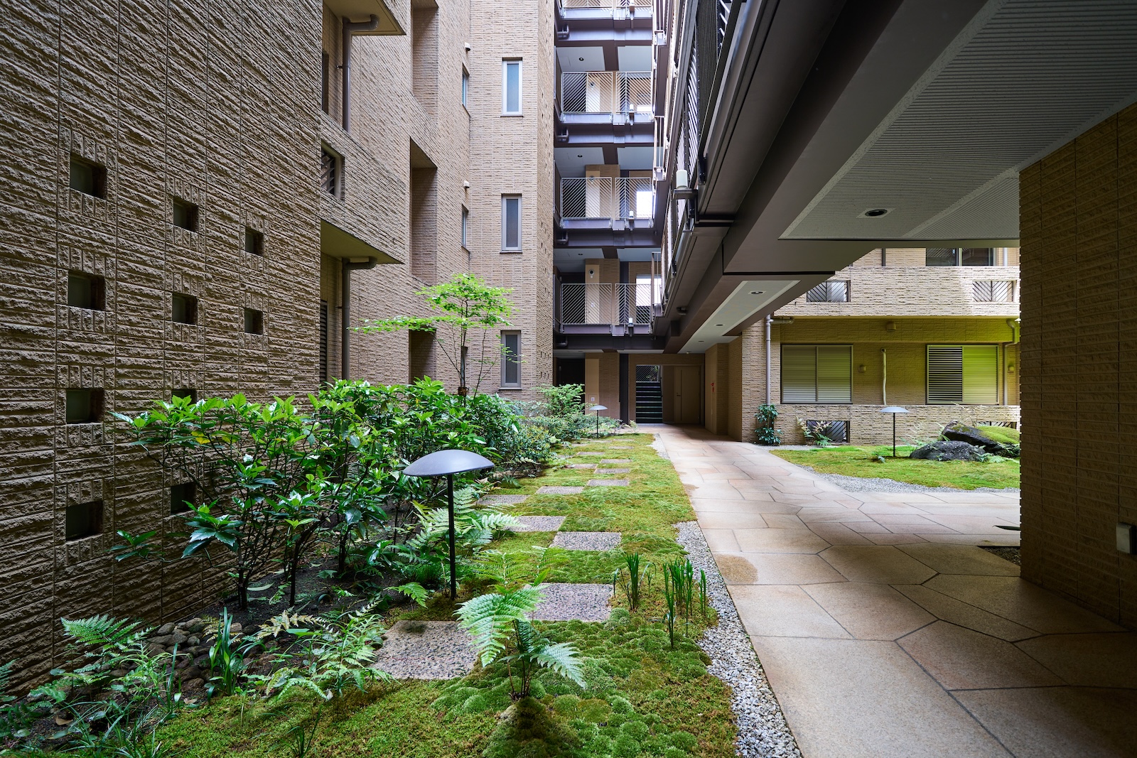 ファサードからエントランスホール、さらに回廊へと続く方形乱貼りのさび石は、通路としてではなく、心地よい時を過ごす庭として趣ある空間を創出。荘重な佇まいを披露するさび色のコールテン鋼仕上げのキャノピーが彩りを添え、天井に設けた円形のトップライトから降り注ぐ光が、ホールを柔らかく照らしだします。木目の美しいウエンジの扉から一歩足を踏み入れると、季節の華やぎを添えた清々しい「孟宗竹の庭」がお出迎え。そしてその先には、心が洗われるような美しい中庭が広がります。中心には見事なモミジ、足元には苔類を植栽、苔の良さを引きたたせるために起伏が描かれ、長い歴史を刻む灯籠の基礎石を配置。深い味わいを醸しだす庭園が、回廊を行き交うたびに、心を穏やかに包み込んでくれます。