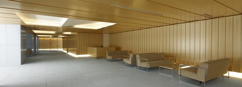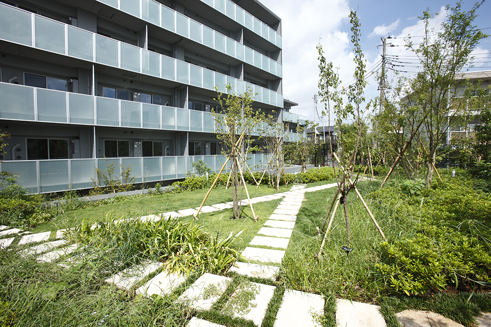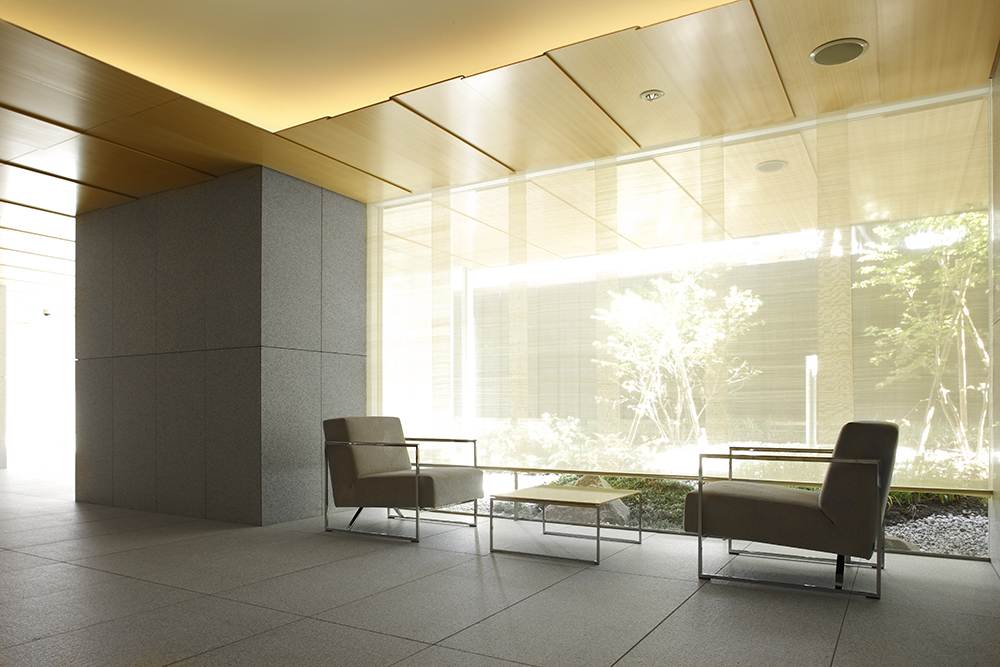 足元に配した神社の参道から続く白御影石が、緩やかに住まう方を迎え入れます。エントランスガーデンの豊潤な緑に、差し込む光が空間を優しく包み込む内廊下。吹き抜け部分には外観にも設えたモザイクタイルをあしらい、緩やかな連続性を感じる空間をつくりあげています。