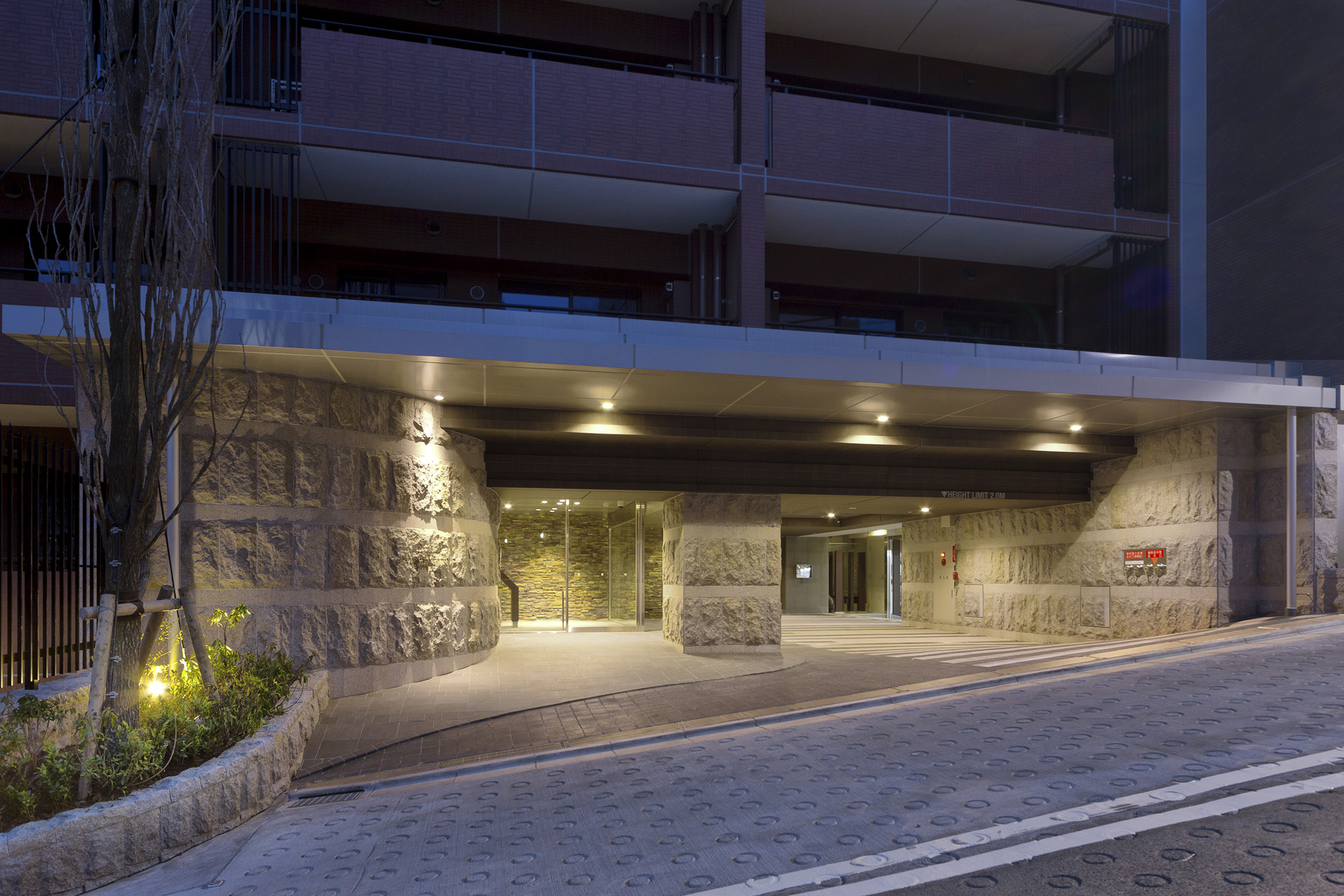 エントランスには幅約12mの壁面に天然石をダイナミックに張り巡らせ、大きな存在感をもたらしています。あたたかな素材感と、ゆるやかな曲線で仕上げ、人を迎え入れるやさしさも感じさせるデザインです。