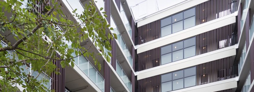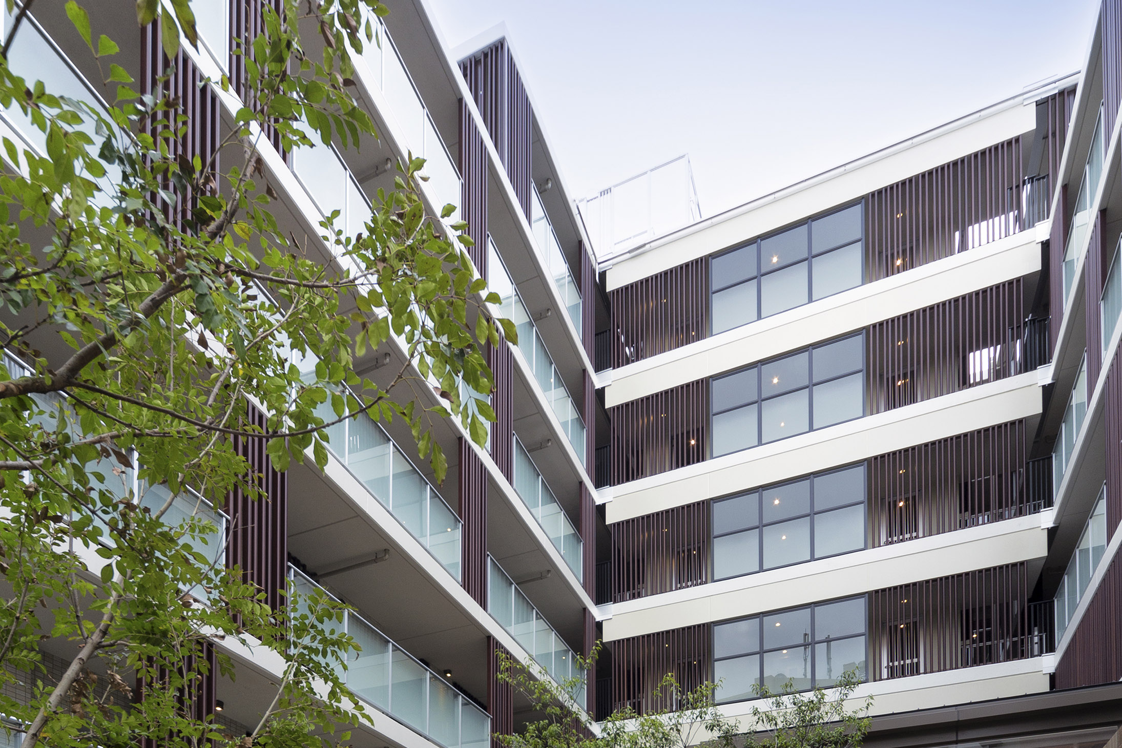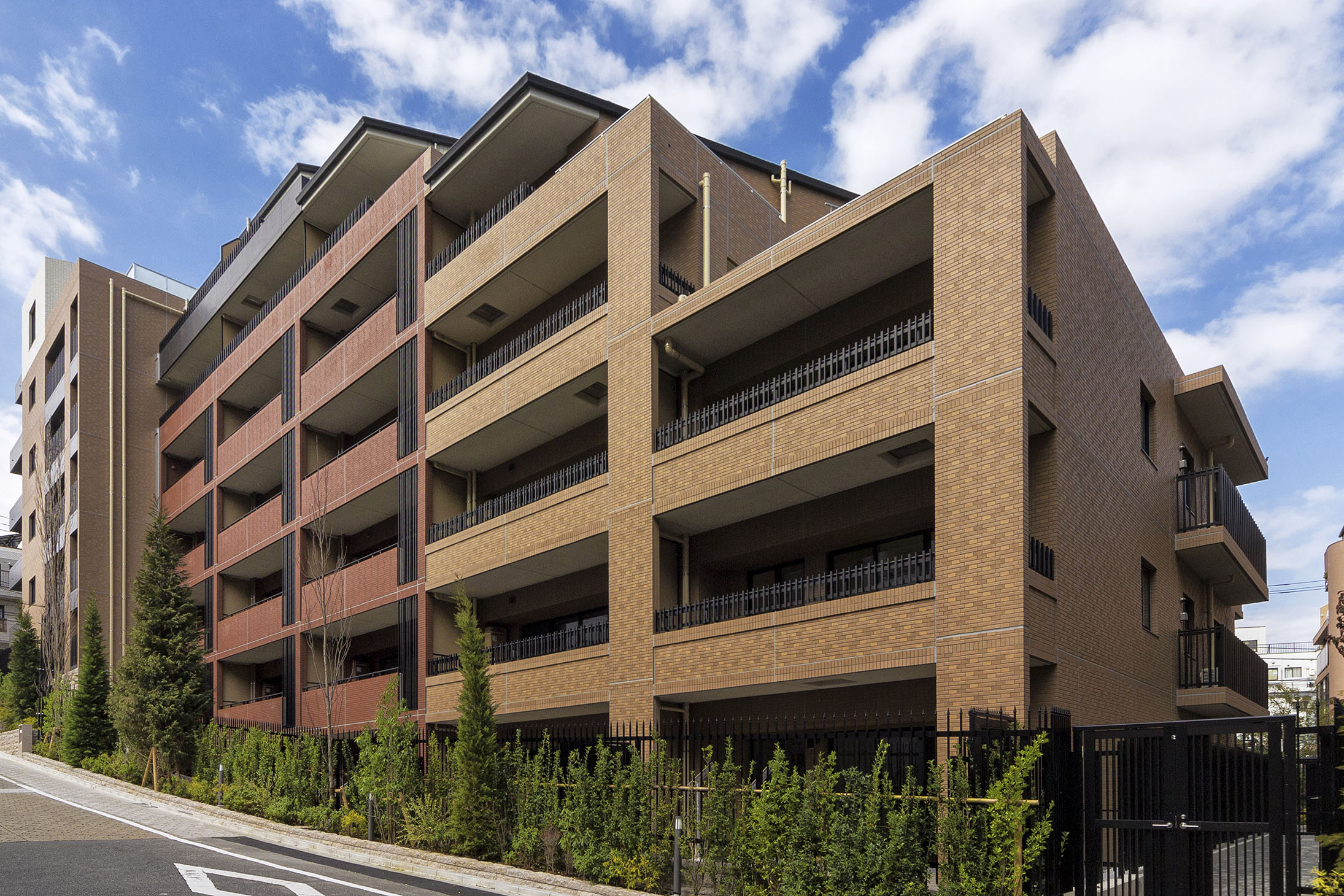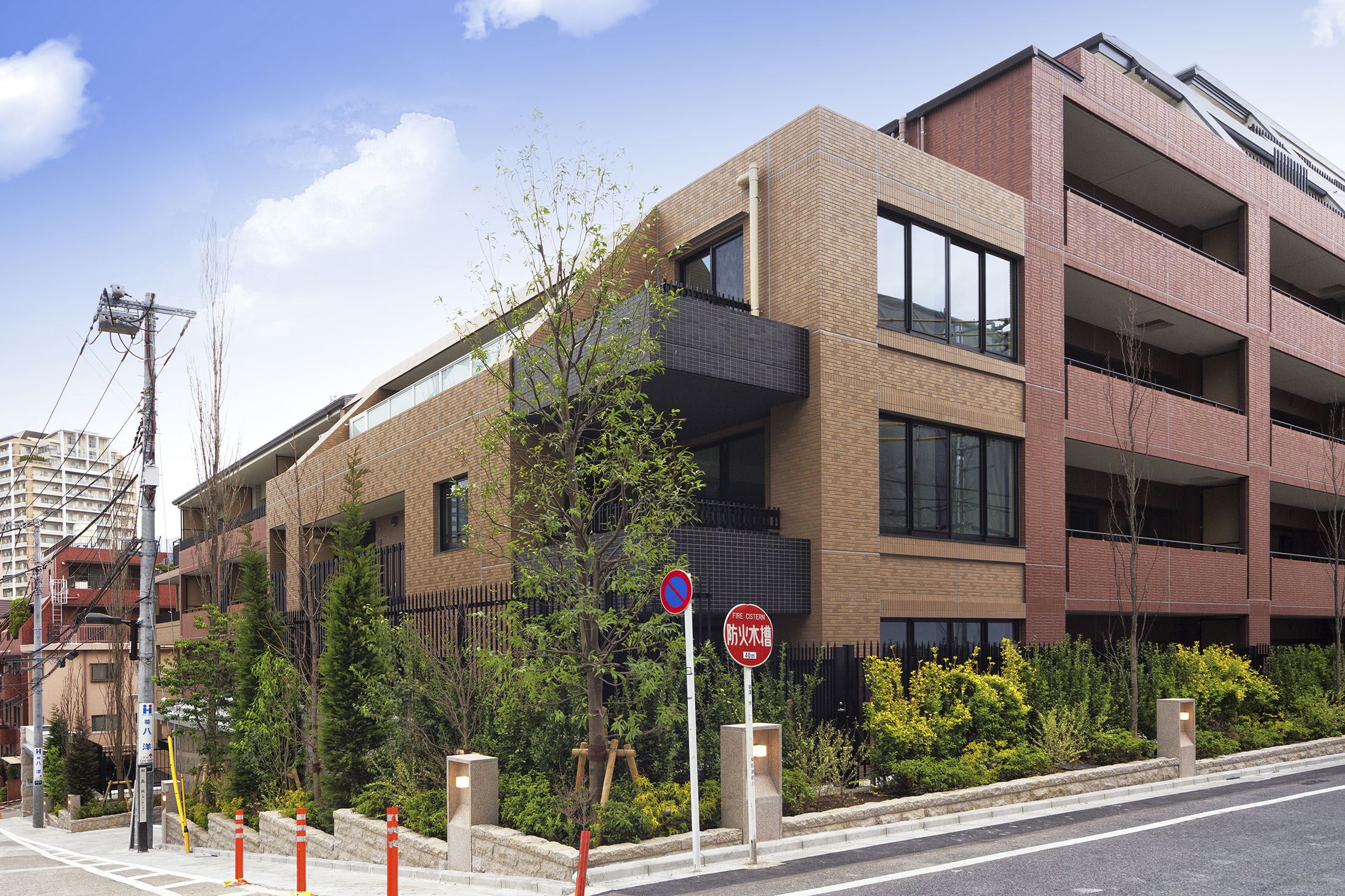 基壇部の天然石に加え、ファサードには重厚感あふれるタイルを使用。色や質感の異なる多彩な素材を緻密に貼り分けることで、変化に富んだ表情や奥行きを感じさせるデザインに。外周部にはグリーンゾーンを設けて高木と中低木をリズミカルに配し、重厚感と気品、潤いが一体となった味わい深い風景を作り上げています。