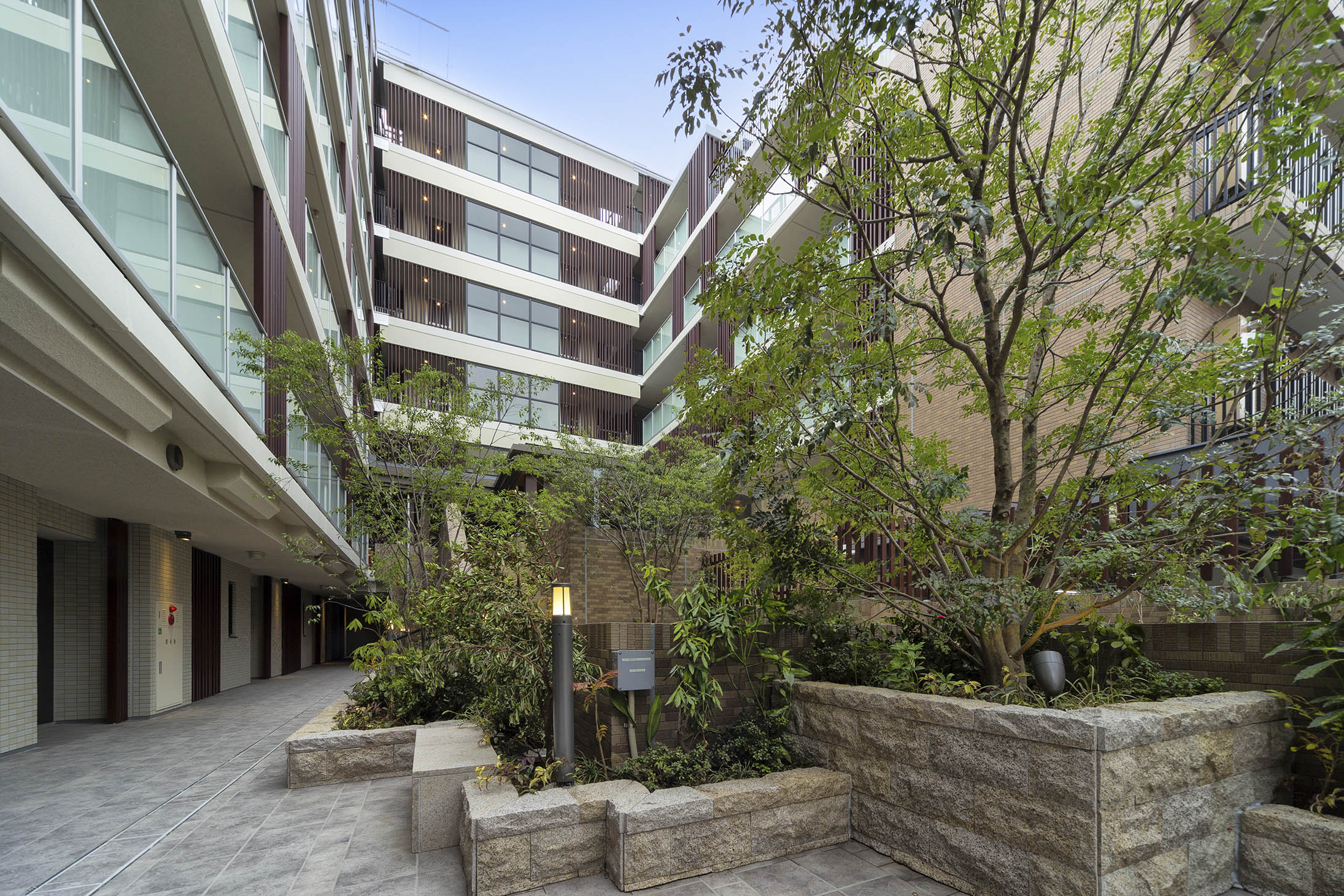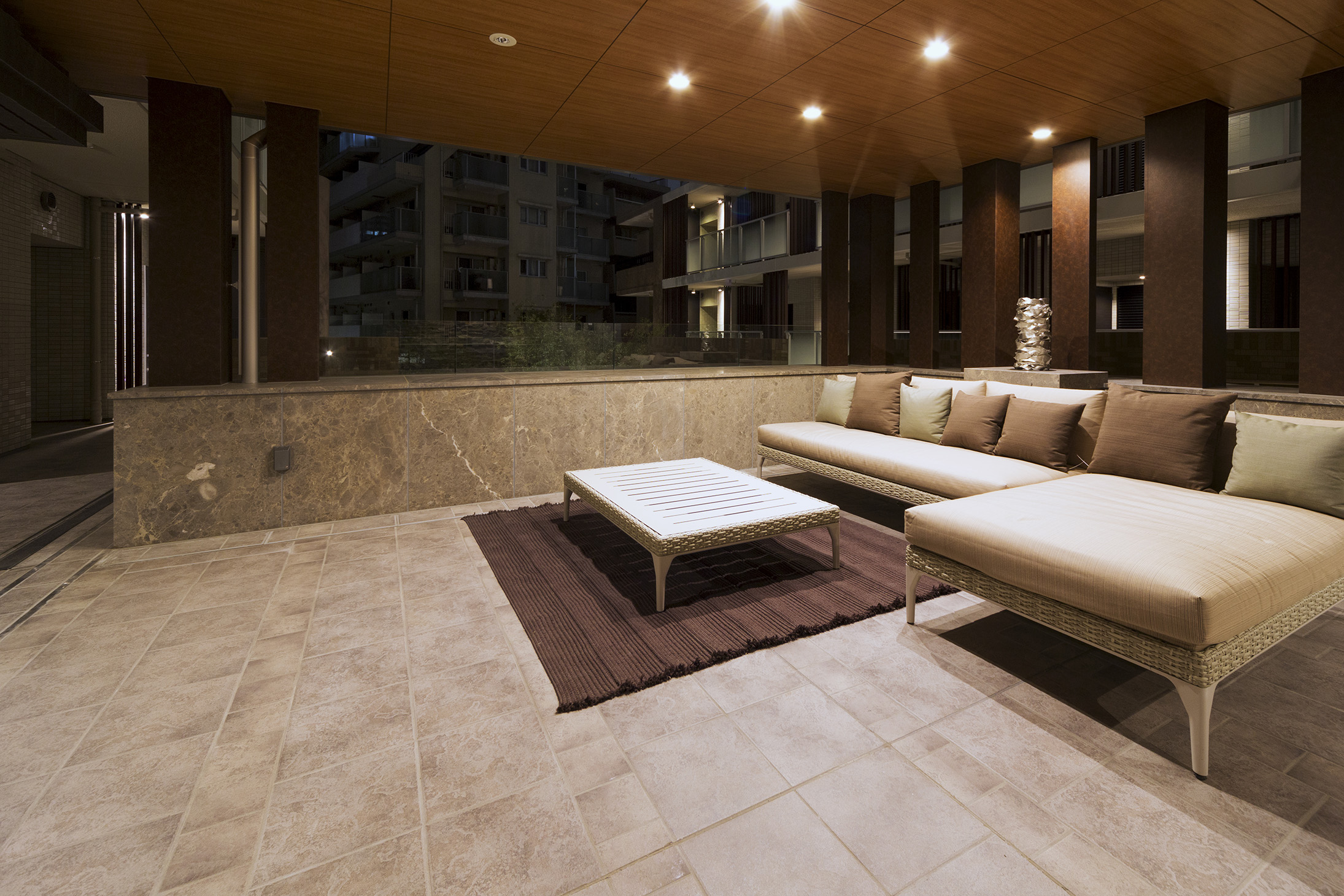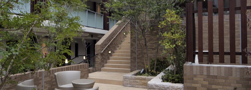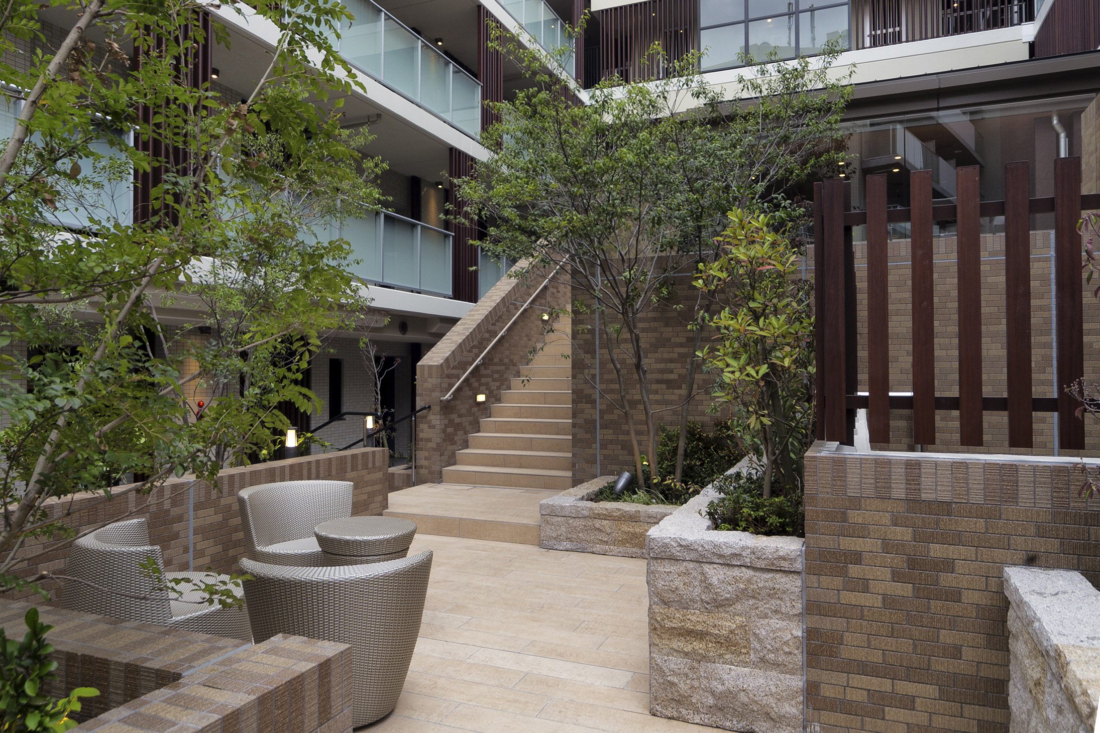 エントランスから一歩入れば、あたたかな木質感やタイルの風合いに包まれる落ち着いたウェルカムラウンジ。その先にある半屋外のガーデンラウンジでは、屋外からの風がそよぎ陽光が舞う中で、ゆったりとしたソファからプライベートな空が広がり、季節の花々で彩られたステップガーデンが視界を包み込みます。ここにある自然の風景は、住む人だけが享受できる美しい世界。リゾートのくつろぎが味わえる空間です。