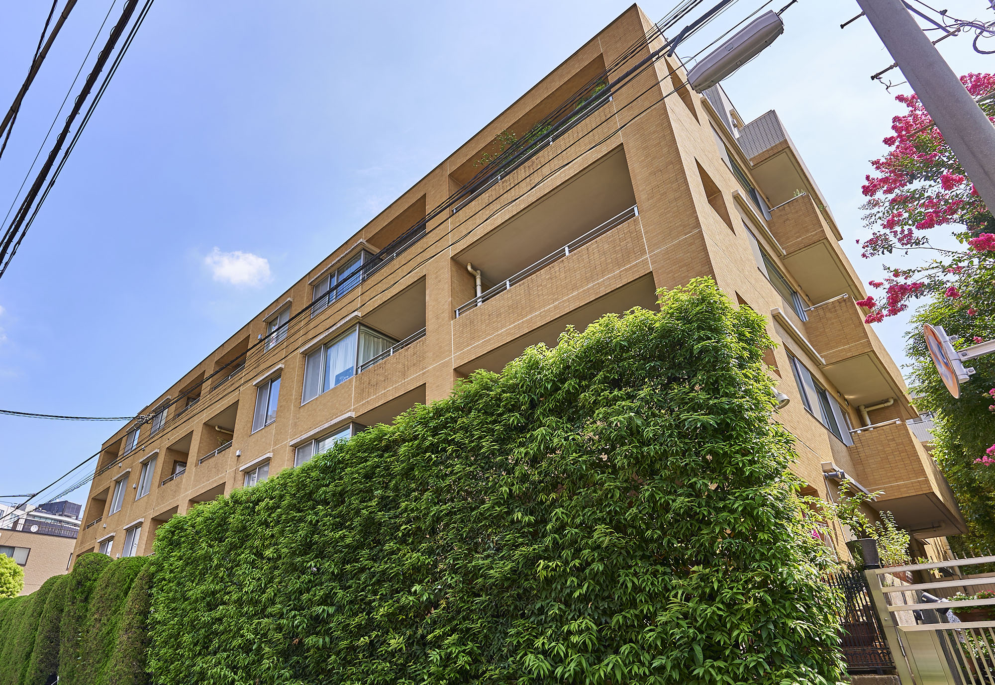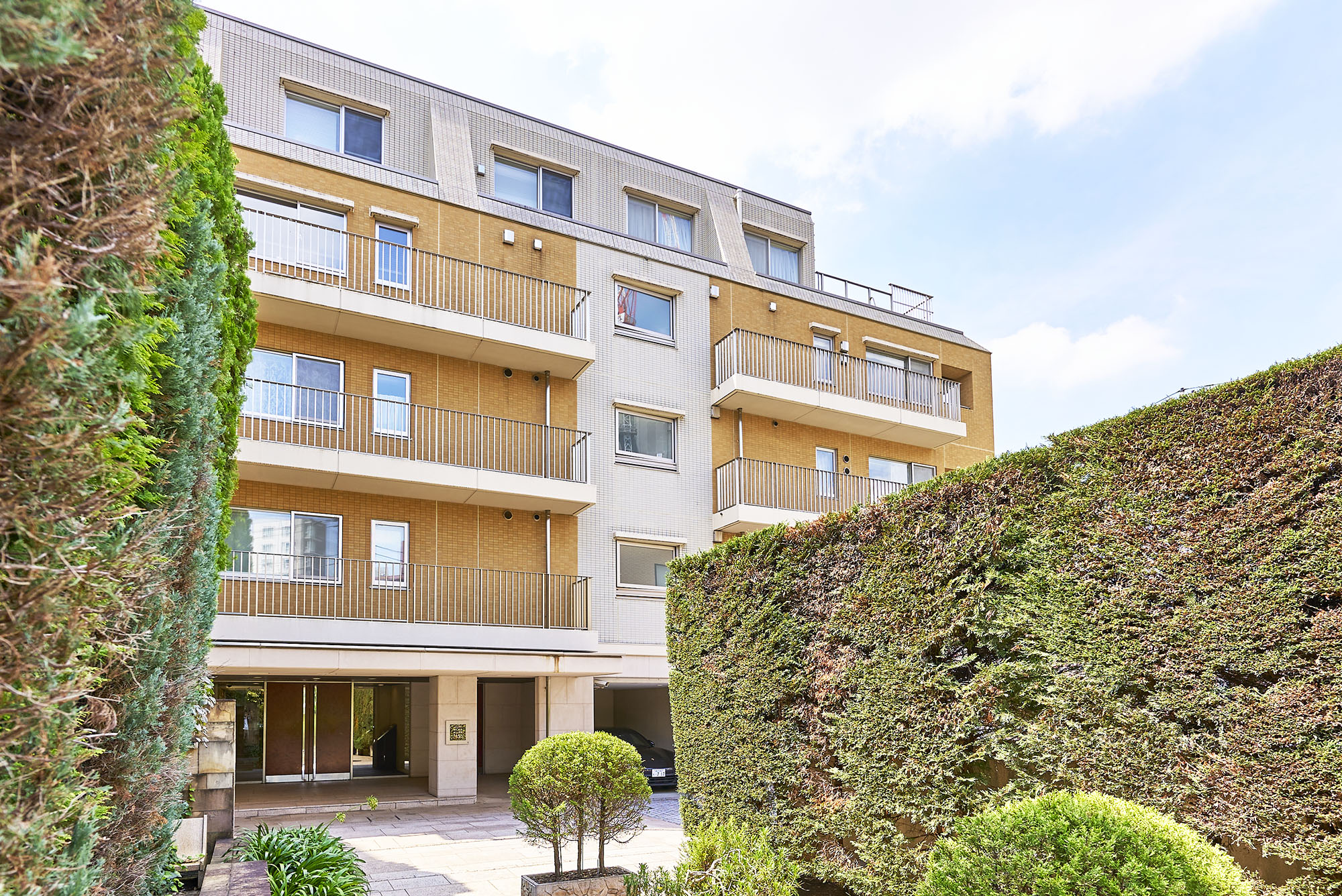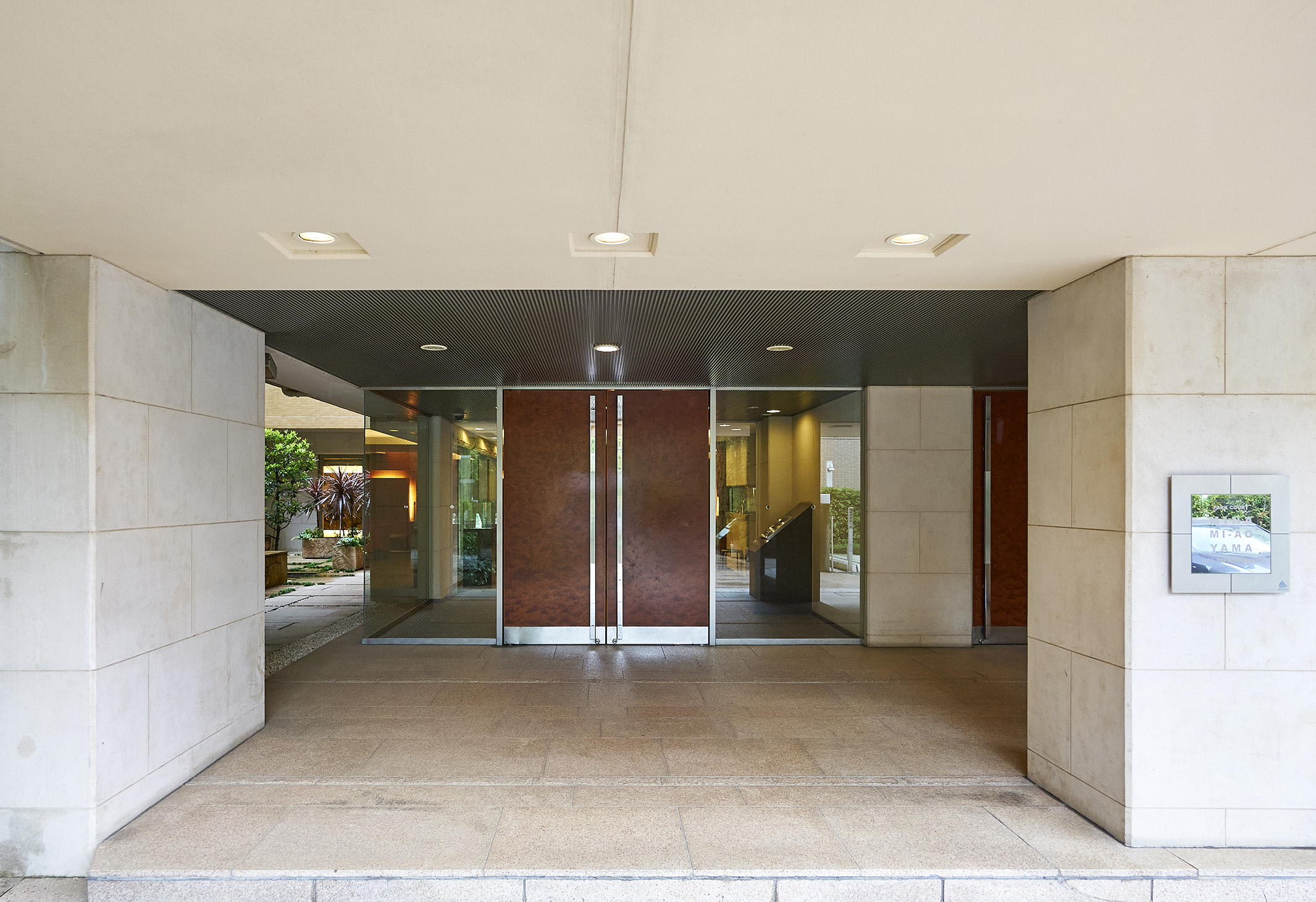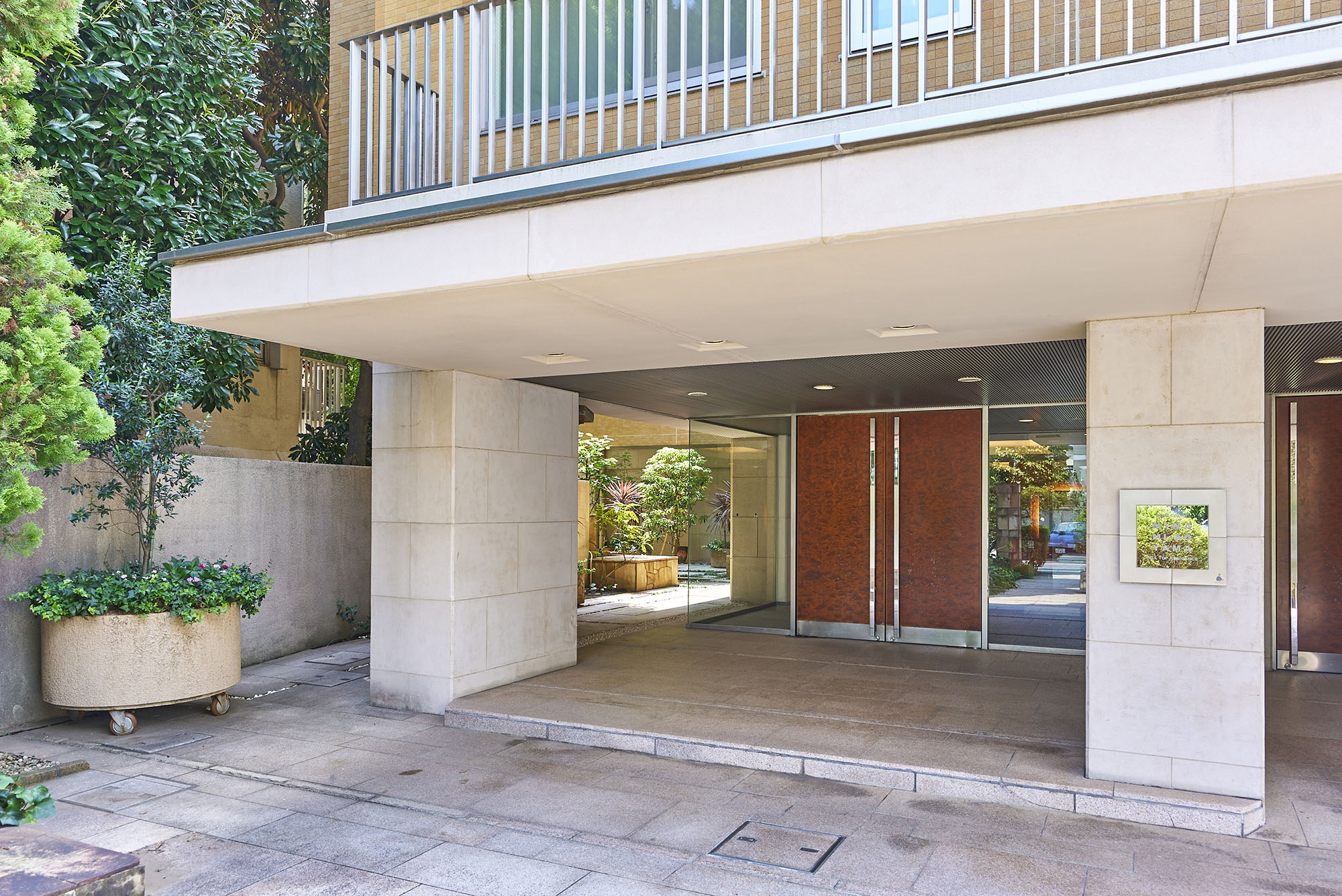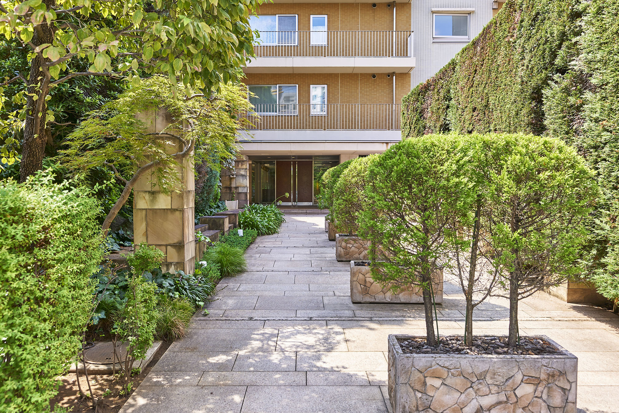 落ち着いたベージュとソフトなオレンジブラウン色のツートーンで、メリハリをつけながらも柔らかな印象の外観デザインです。エントランスに通じる石畳のアプローチは、四季折々の花々や奥行きを感じさせる樹木に包まれ、南青山という街にふさわしいさりげない高級感を演出しています。