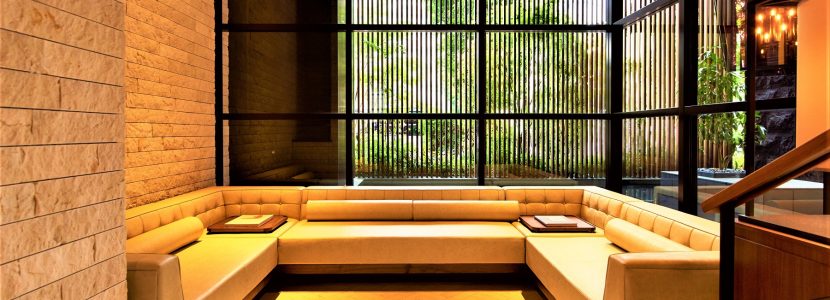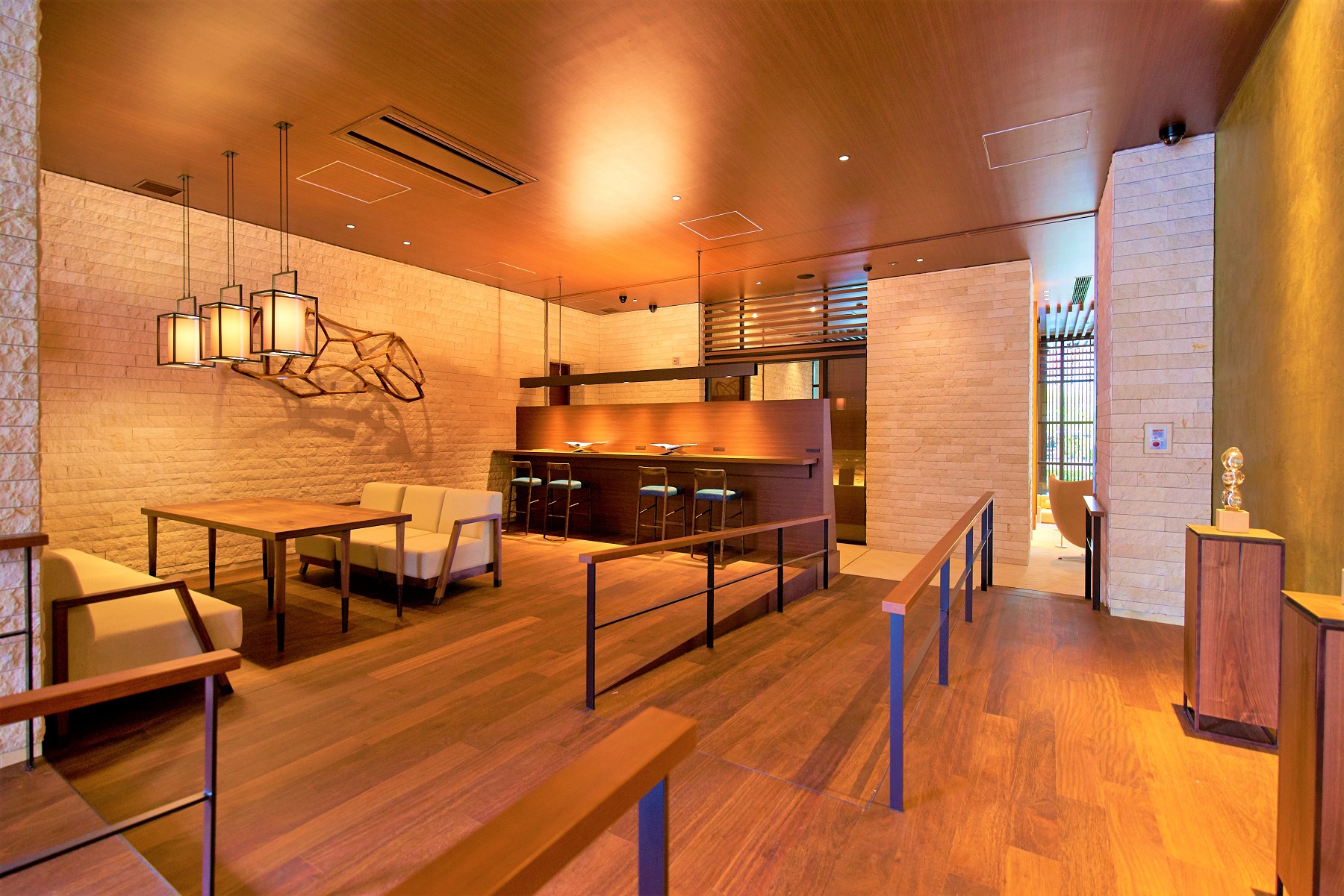 優しい光に煌めく水盤や野趣あふれる熱帯の植物・ガジュマルの樹などを眺める「グランドラウンジ[ザ ホワイエ]」。天井には内外の連続性を演出する木調ルーバー、壁面には風合い豊かな石や、「土」をテーマにしたアートなどを配して、人々を迎えるにふさわしい上質感を醸し出す空間を目指しました。さらに、住む方の快適な暮らしをサポートするコンシェルジュカウンターを設置。潤いと洗練、もてなしの心に彩られた応接・迎賓空間です。