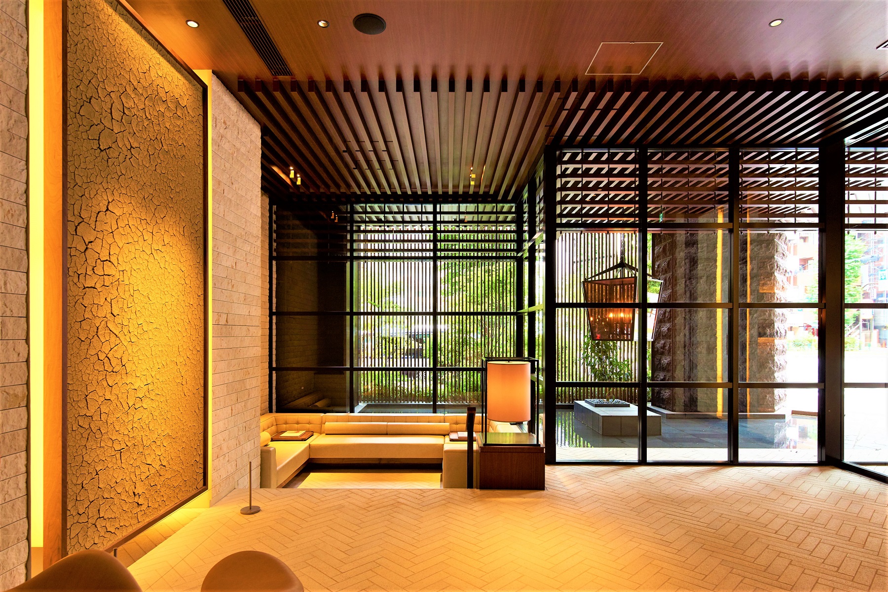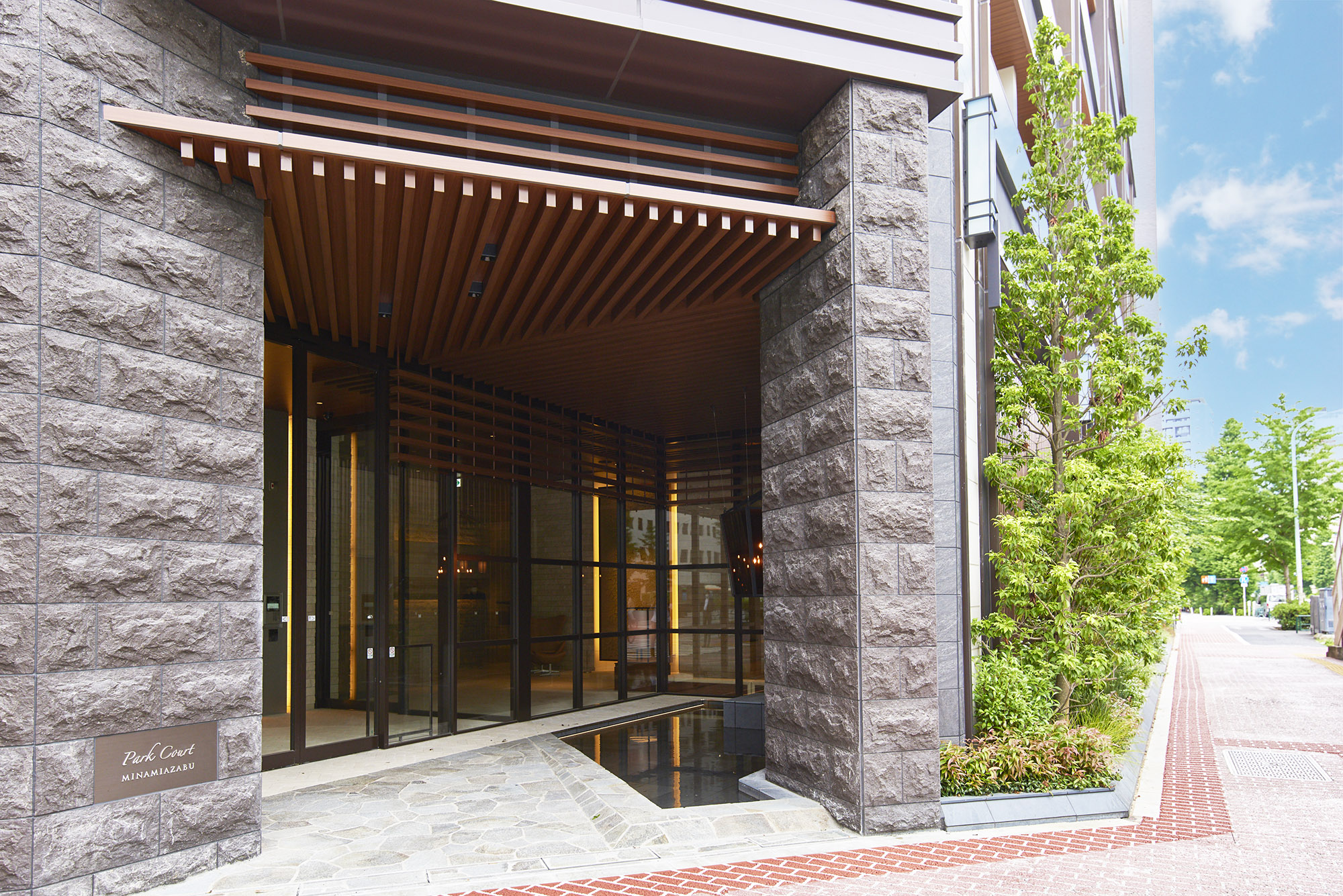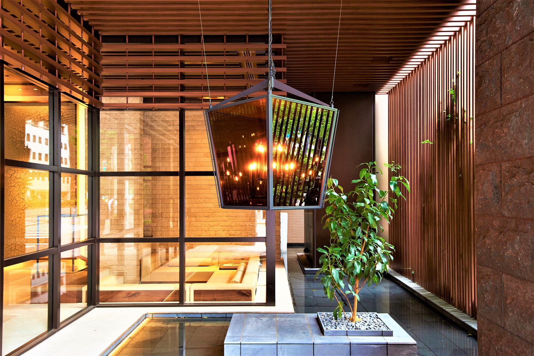 重厚感のある石調タイルや温かみを感じさせる木調ルーバーの天井などを採用した、人々を格調高く迎え入れるエントランス、建物内へと歩むアプローチ上には、街と建物との境界を思わせる水盤をデザイン。帰宅時の緊張感を解きほぐし、心を動から静へと緩やかに導くとともに、街並みにも潤いをもたらします。