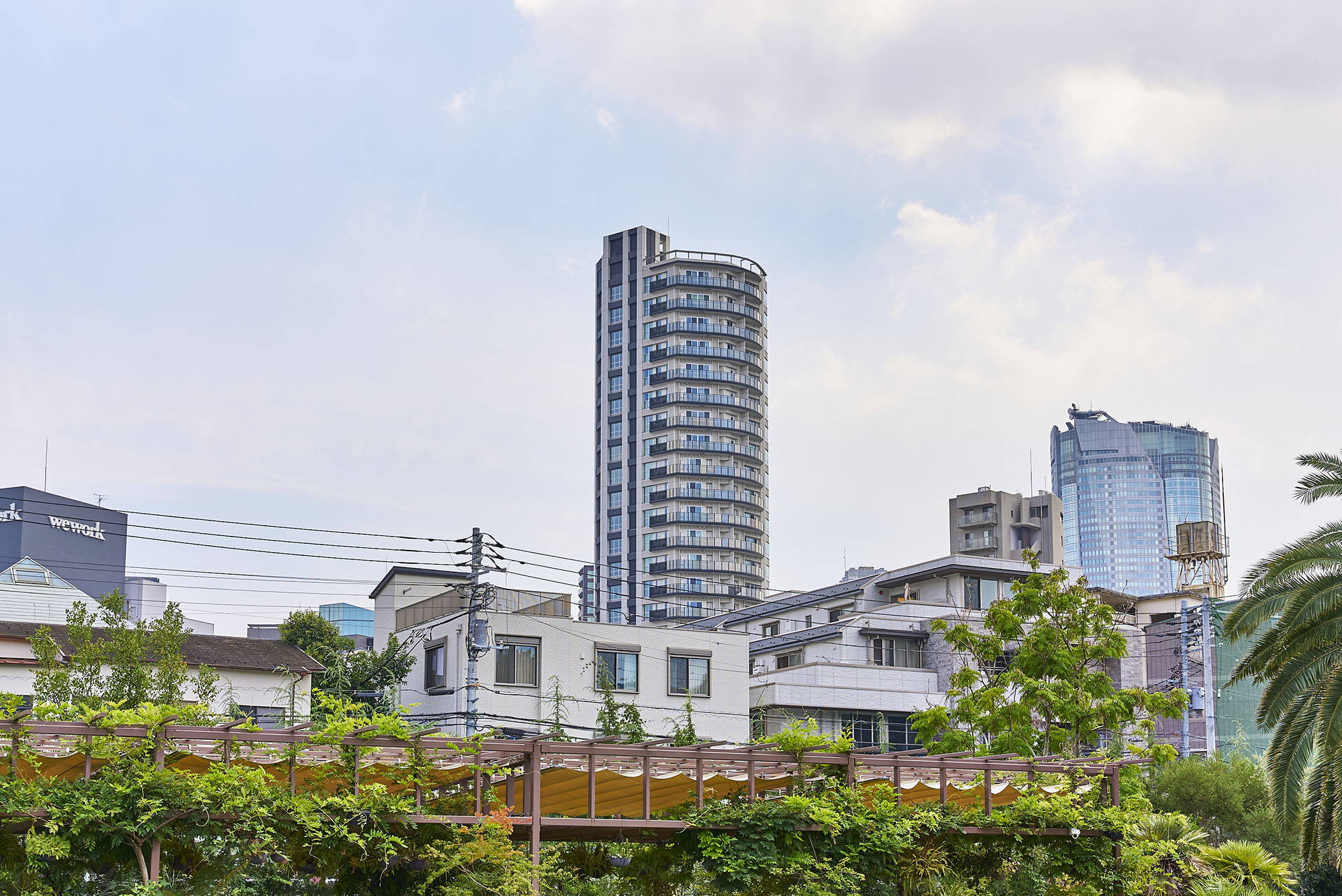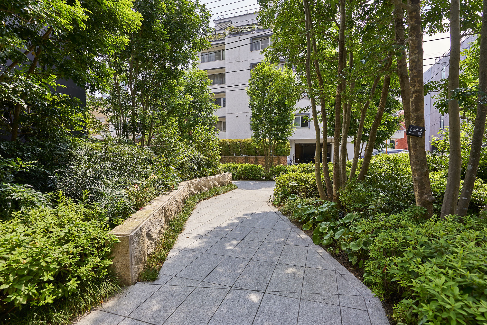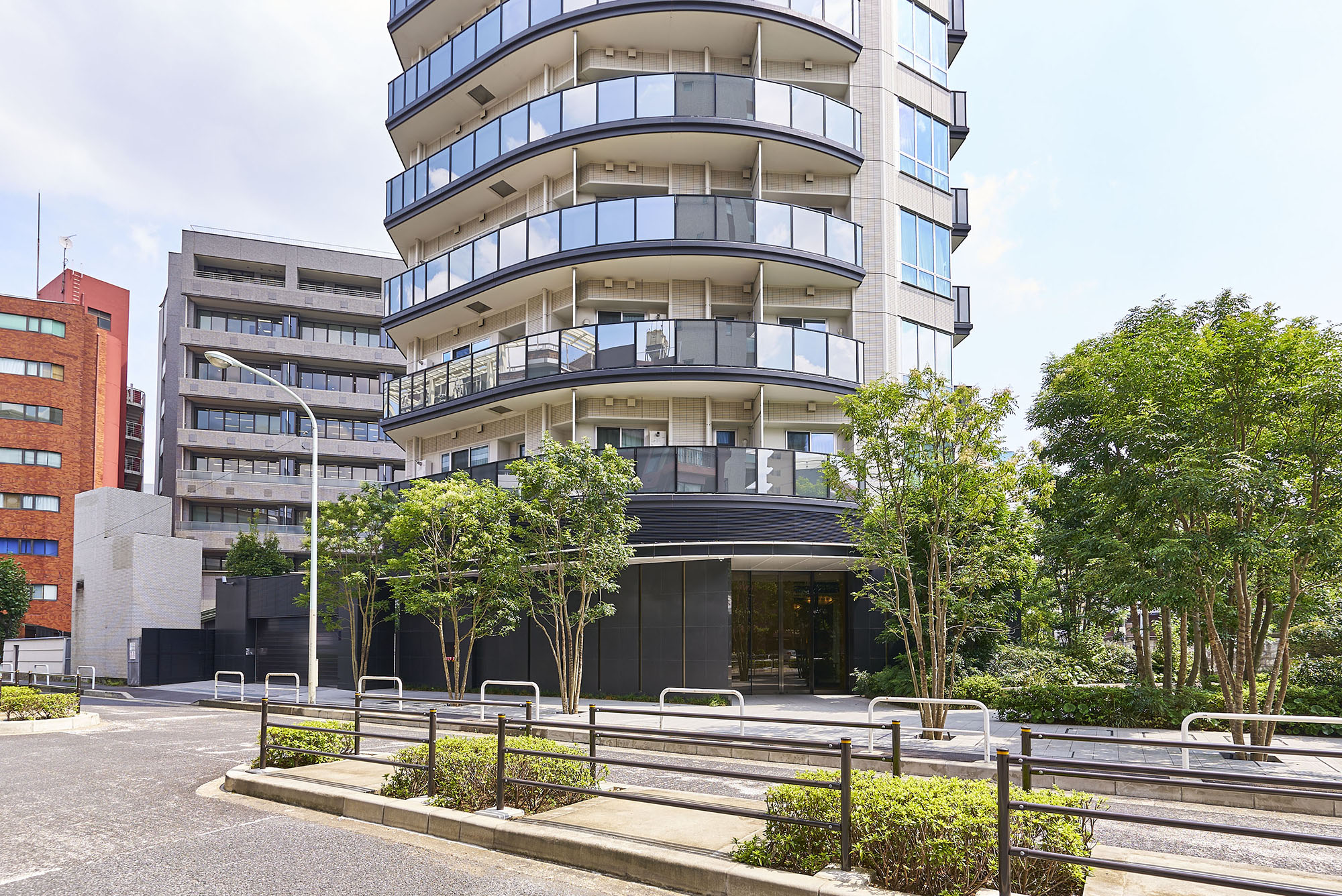 賑わう都心の通りから一本入ると、驚くほど静けさが満ちる場所があります。そんな落ち着きと穏やかさを纏う地に聳える「パークコート乃木坂ザタワー」。アプローチは緑の潤い溢れる迎賓空間に、外観は「グレイス(優美)」をコンセプトとして基壇部には黒の御影石などを使い、品格を感じさせる邸宅の佇まいとなっています。