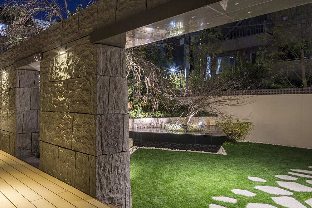 モダンと和を調和させたトラディショナルな意匠。それは建物の外から内へと連続し、全体に美しい統一感を与えています。「西の庵治石、東の本小松石」と言われる日本の二大銘石が使用されている石垣と石壁。品のある、落ち着いた雰囲気をもたらす格子は、建物の主要なアクセントになっています。随所にちりばめられた本物だけがもつ質感と、そこから生まれる雰囲気。それもこの住まいの価値のひとつです。