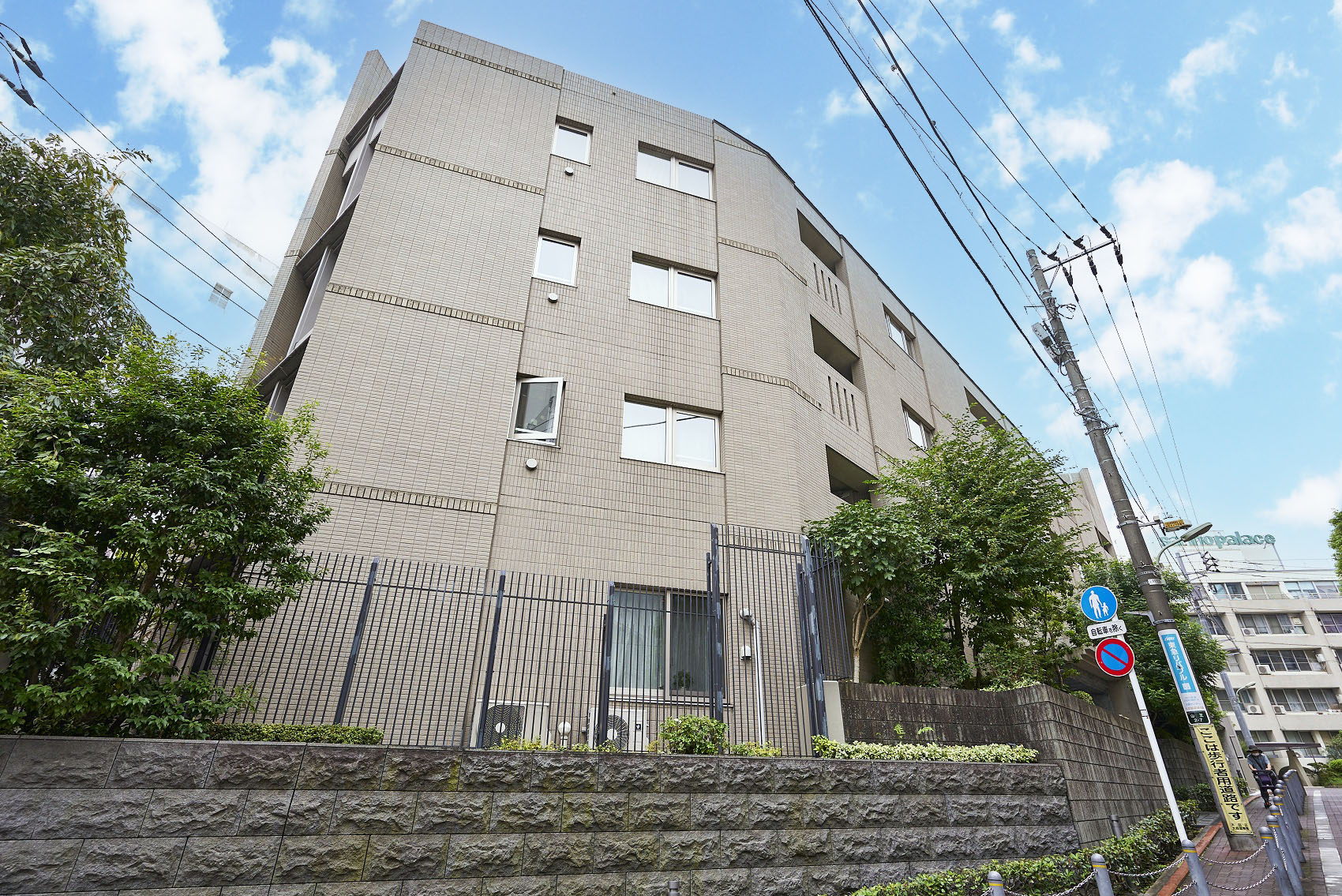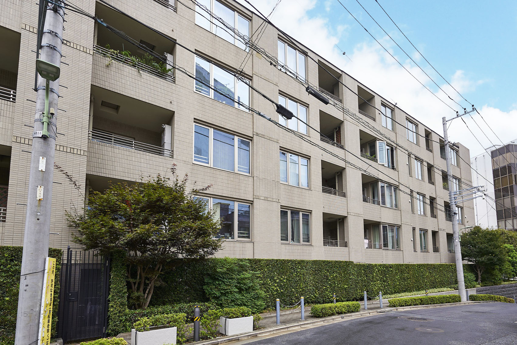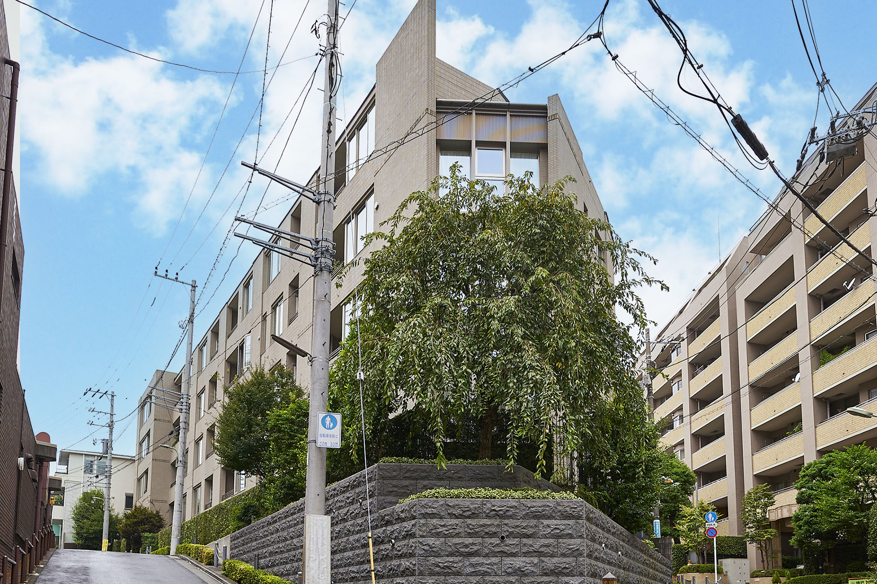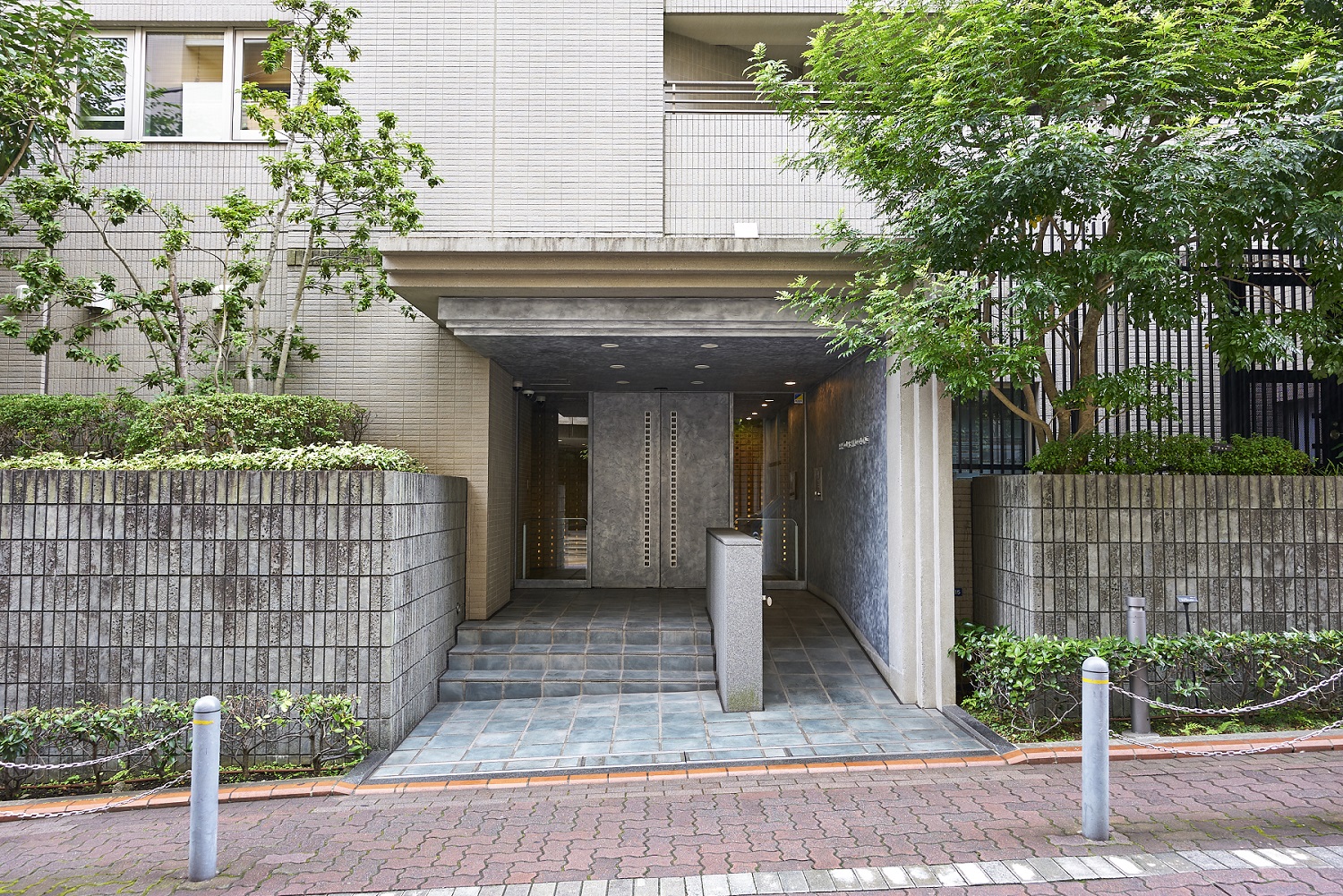 敷地の基壇部に施した威厳のある御影石の擁壁、落ち着いた色彩のタイル、建物の顔となる東面にレイアウトしたシンボルツリーの枝垂桜。約100年前からこの場所に存在していた、壮厳な邸宅を修景し、山王に相応しい景観を創造しています。素材には土・石・ガラス・金属など、匠の技によりつくられた風合い豊かなマテリアルを採用。華美に飾り立てるのではなく、素材の持つ力を最大限に活かしたシンプルな建築は、歳月を積み重ねるほどに愛着が深まっていきます。