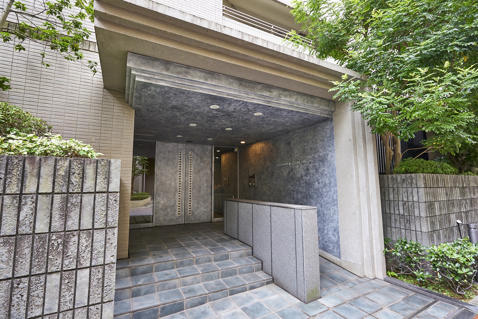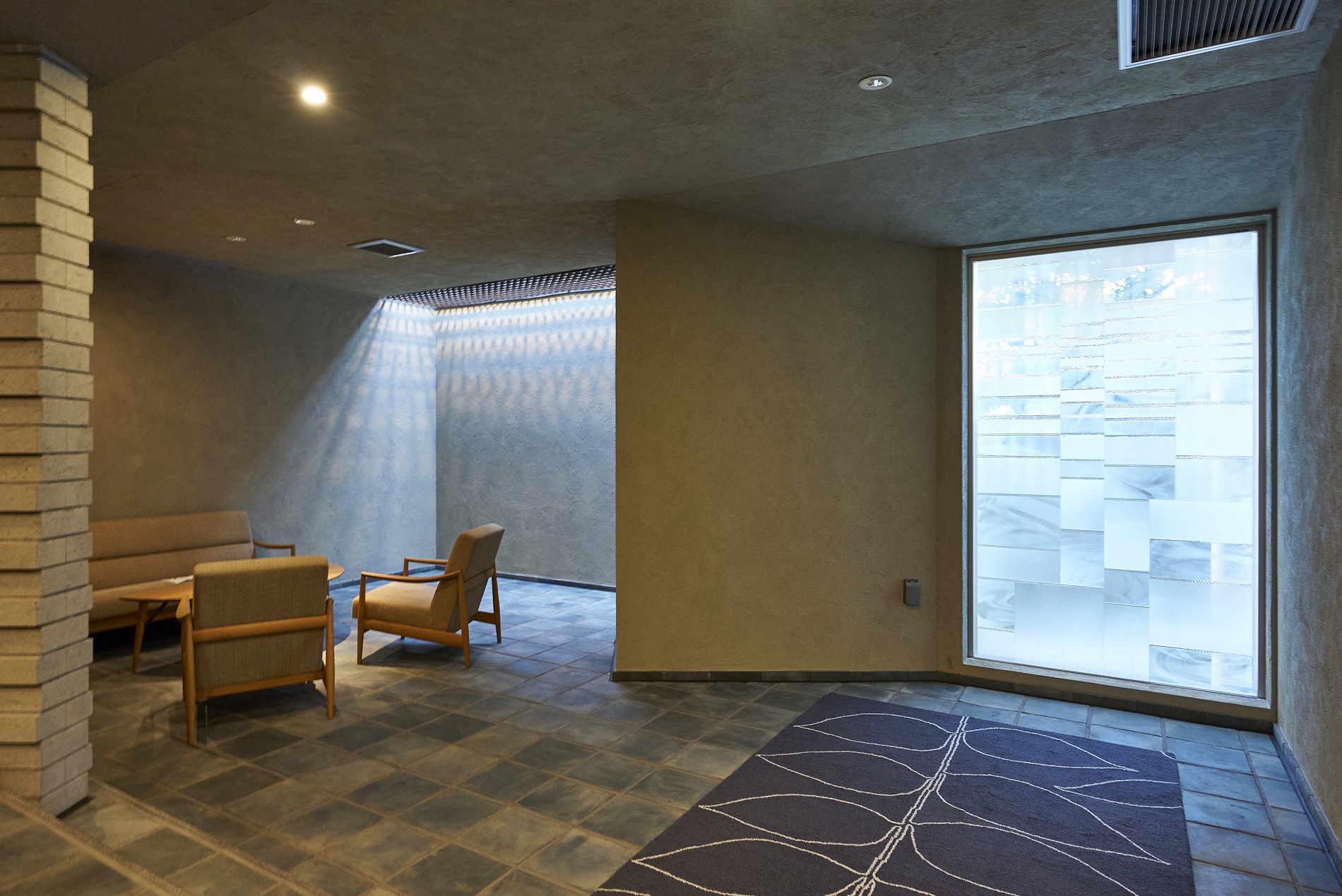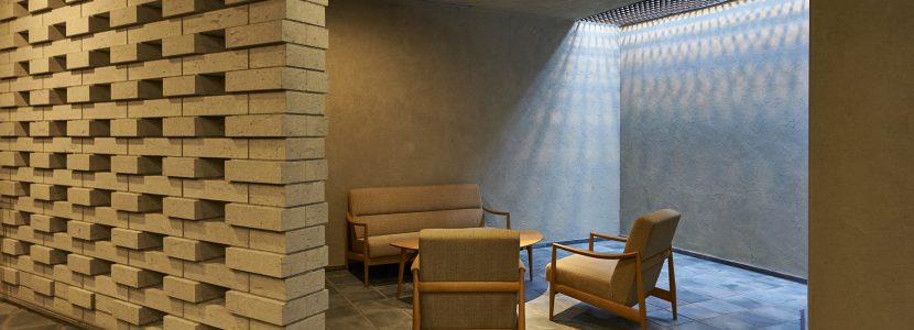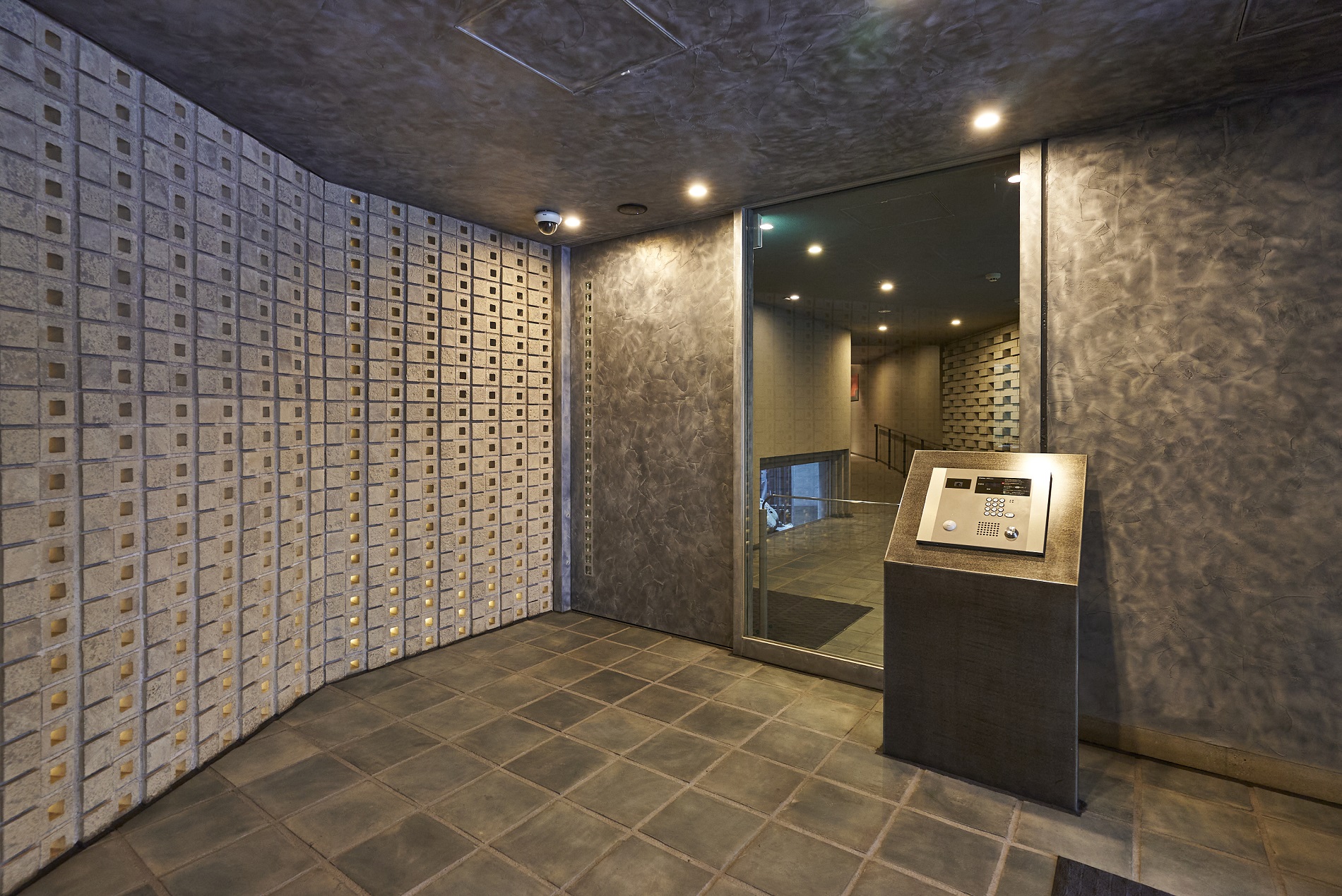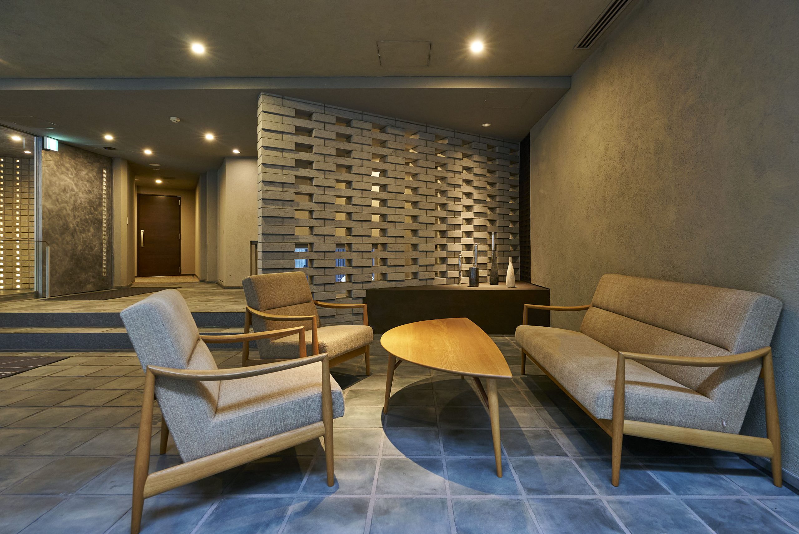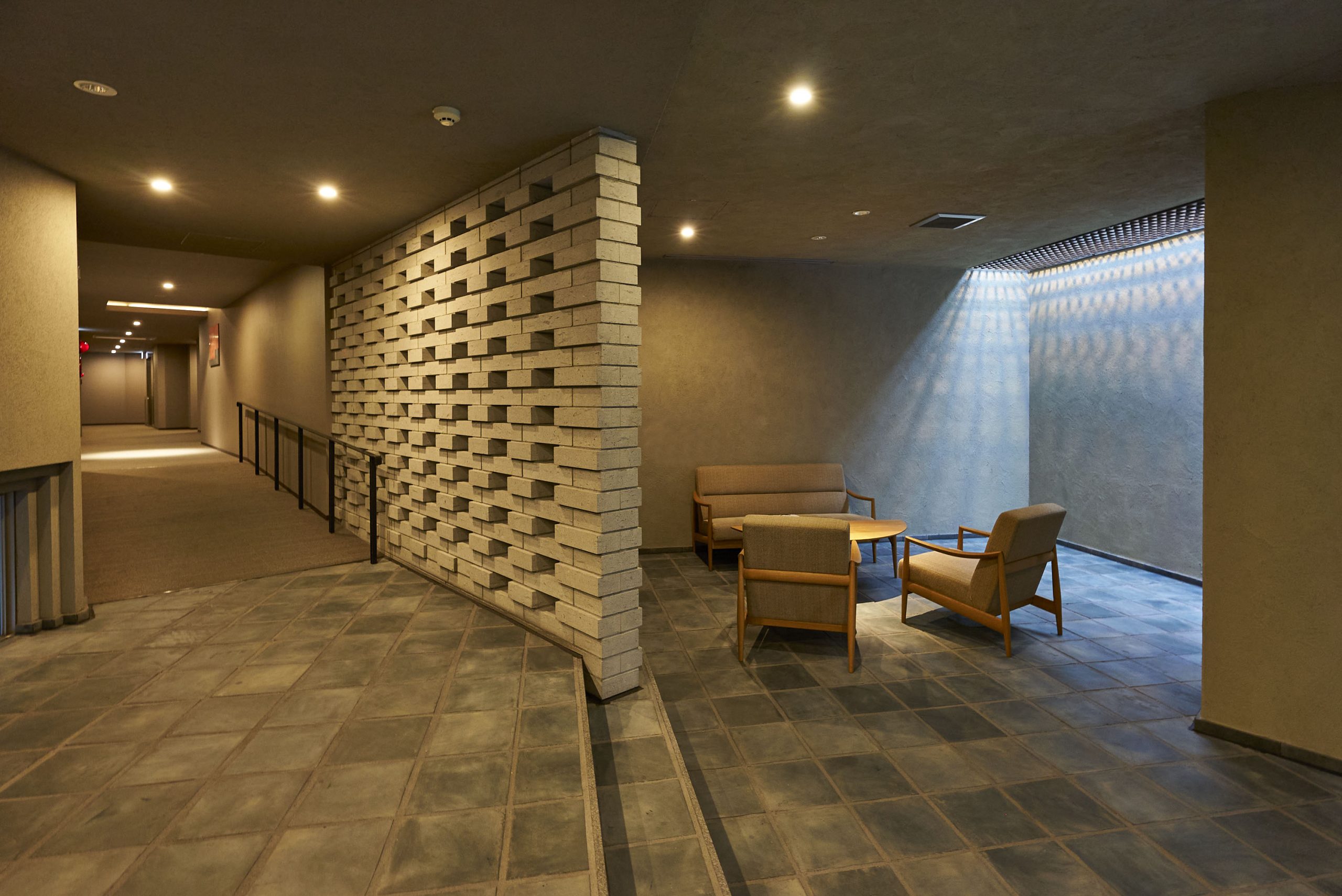 住まう方、そして訪れる方を迎えるエントランスは、足元には落ち着いたカラーのせっ器質タイル、扉や壁面にはしっとりとした光沢を放つアルミ左官仕上げで、上質かつ住まいとしてのぬくもりを感じさせる空間です。風除室の奥には、有孔ブロックを利用した幻想的なライティングが施され、洗練された雰囲気で建物内部へと誘います。1階にはラウンジも設けられており、外からの光が優しく差し込む、落ち着いた空間となっています。