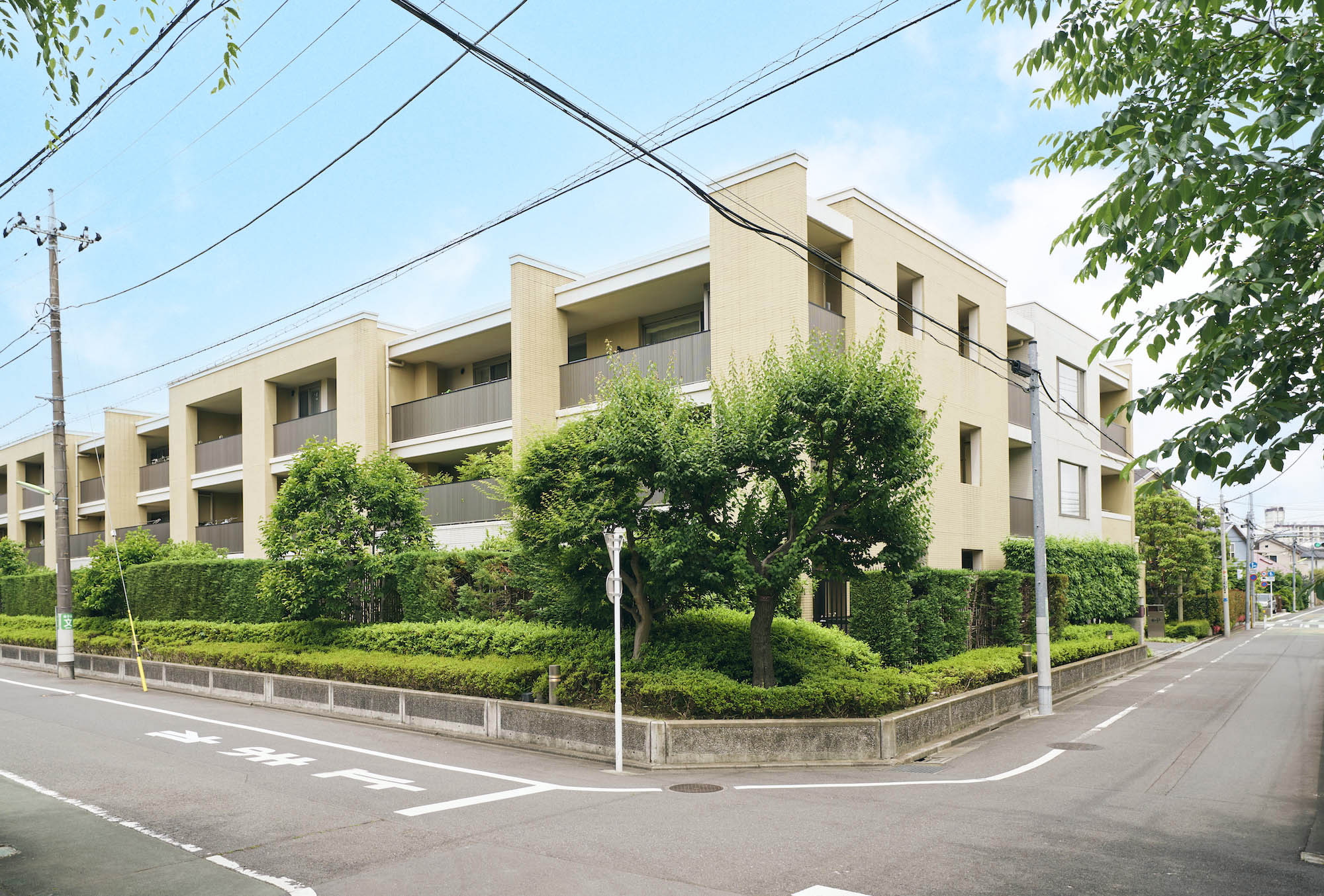 流麗なる趣、潤いある風景。この場所に調和した邸宅でありながら、静かに個性を纏った住まいとなっています。品格を高め、伝統を薫らせ、建物全体の印象を引き締める役割を果たす最上部のコーニス。面と線を巧みにデザインした深みのある表情。建築美へのこだわりが細部まで貫かれています。