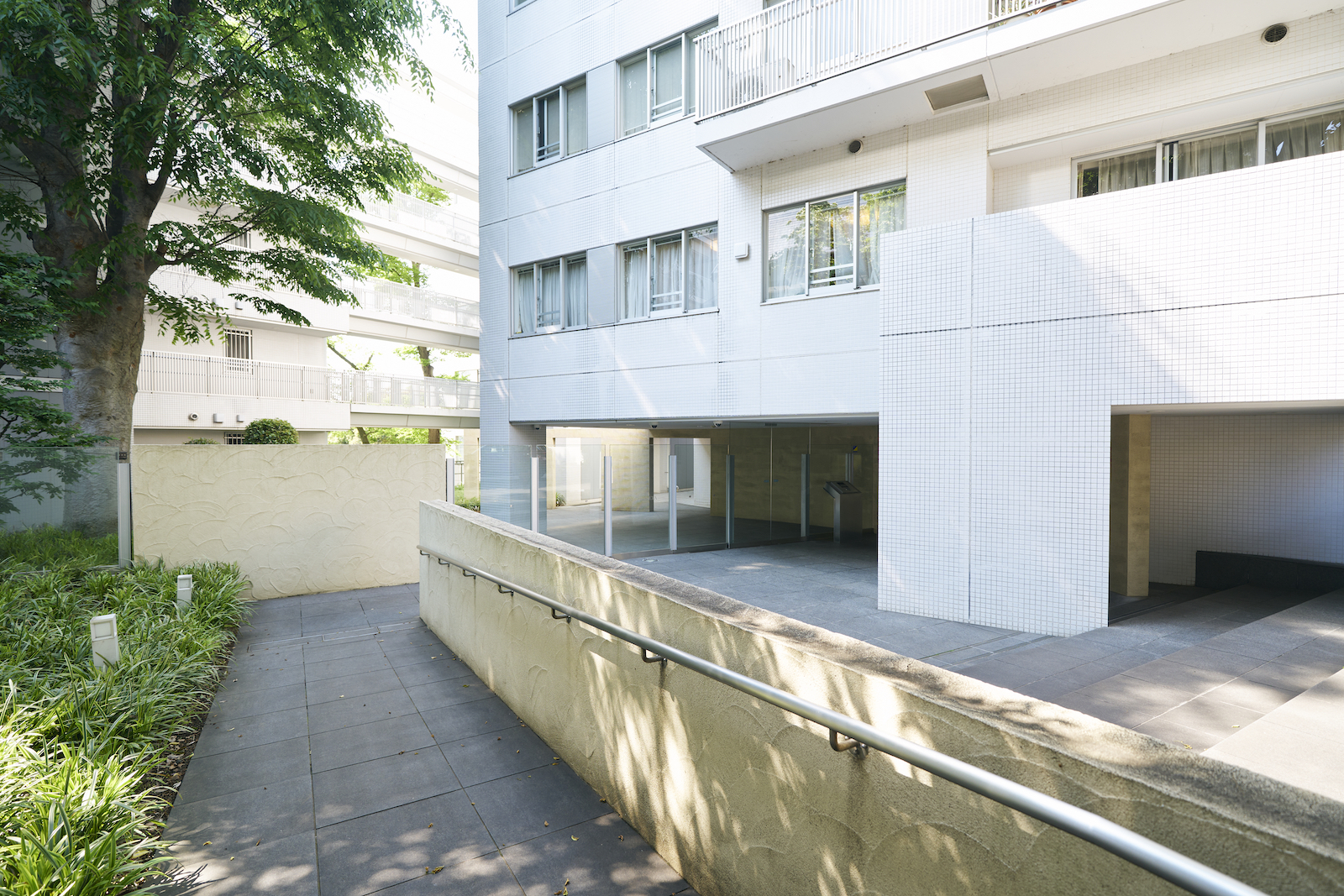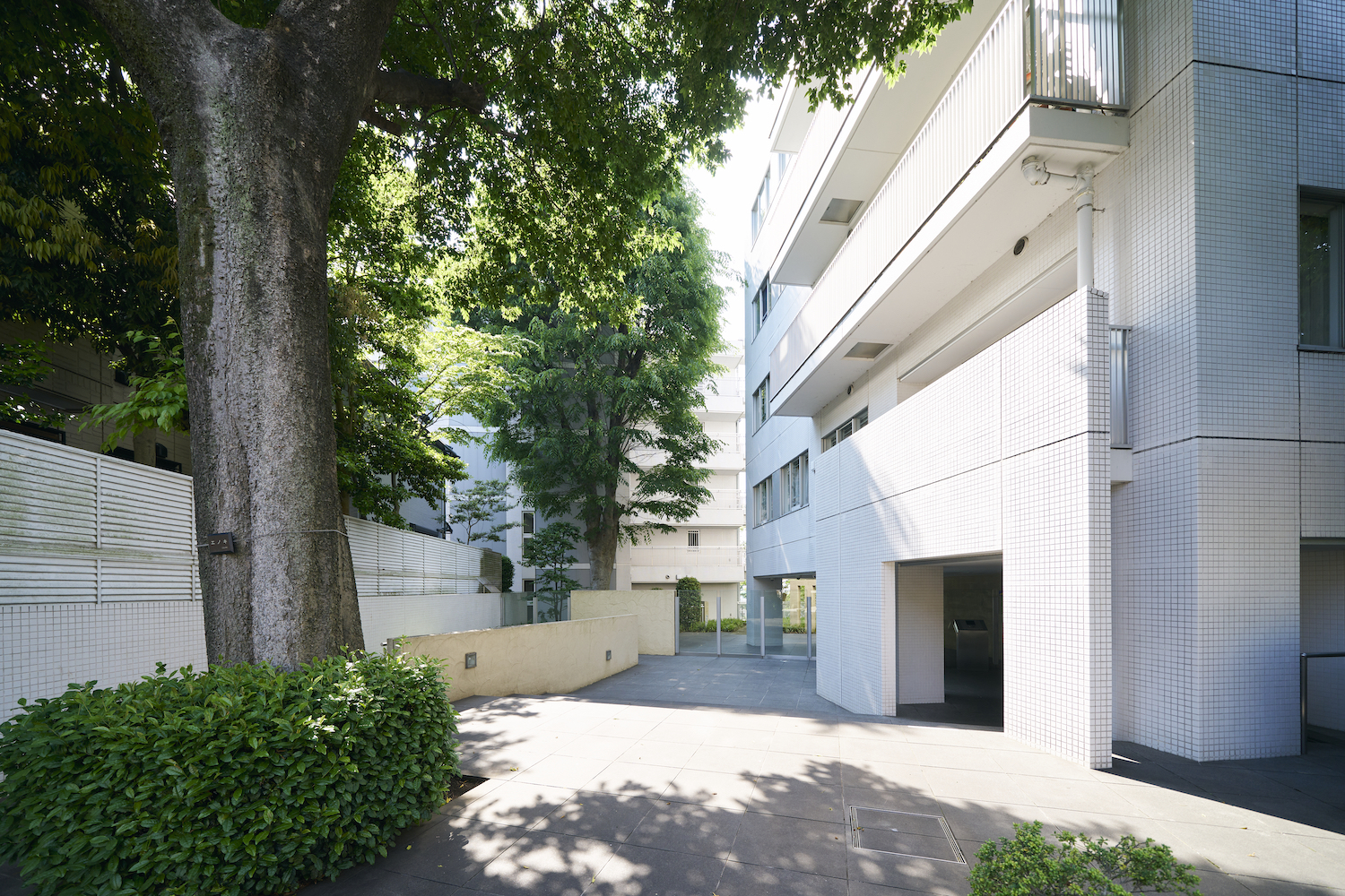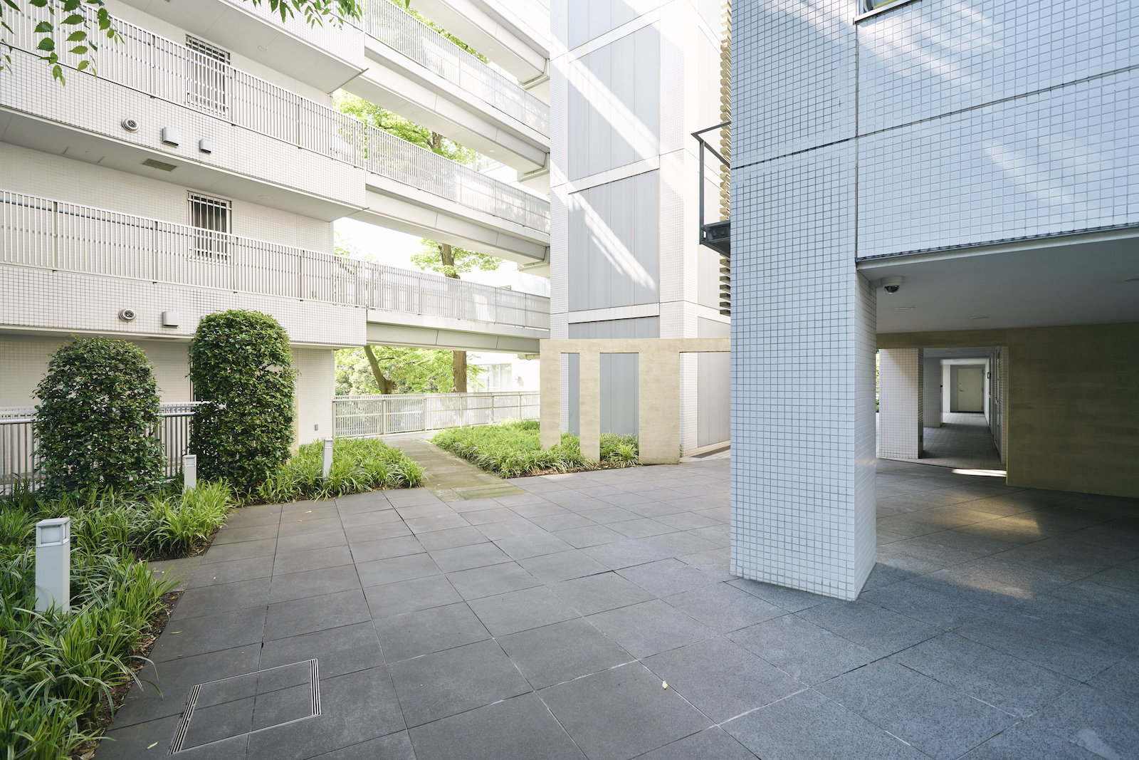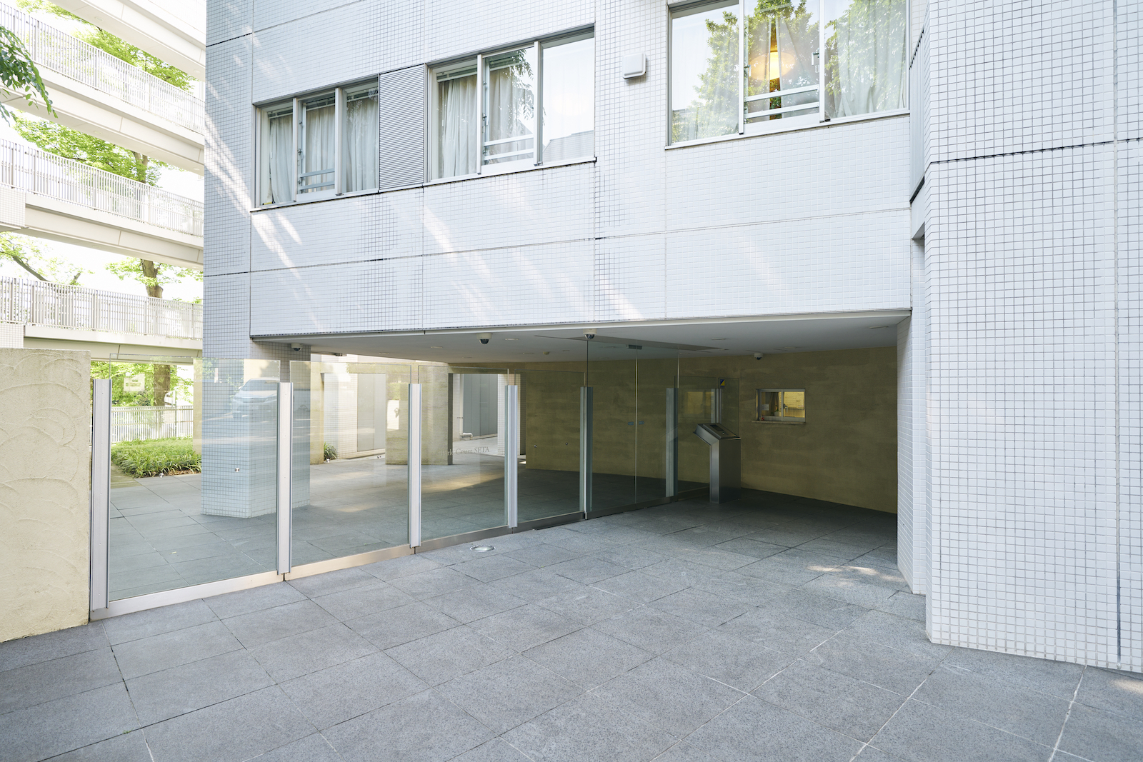 住街区と私邸の境界となるエントランス。「パーク・コート瀬田」のエントランスは、周辺の自然環境のなかに溶け込む“領域“であり、建物内に閉ざされたホール形式ではありません。視覚的・空間的に広がりを持たせるため、パブリックとプライベートの境界を示す壁面にガラススクリーンを採用。その大胆な発想は、セキュリティ機能を併せ持たせつつ、エントランス空間に開放性をもたらし、同時に敷地内の植栽を街並景観に参加させることを可能としています。住棟間に位置する中庭は、御影石製のインターロッキングを敷きつめ低木の植栽をあしらったプロムナードの趣き。日中は柔らかな自然光が降り注ぎ、陽が沈むとライトアップされた樹木が美しく照らされる、絵画的な情景を見せてくれます。その開放感あふれるパブリックゾーンからプライベートゾーンへ導くアプローチとして、中庭と遠景を見渡す空中廊下があります。エントランスと私邸を結ぶ役割だけでなく、視界の中に光や風や緑の息吹を感じながら歩く楽しみを大切にした共用空間です。