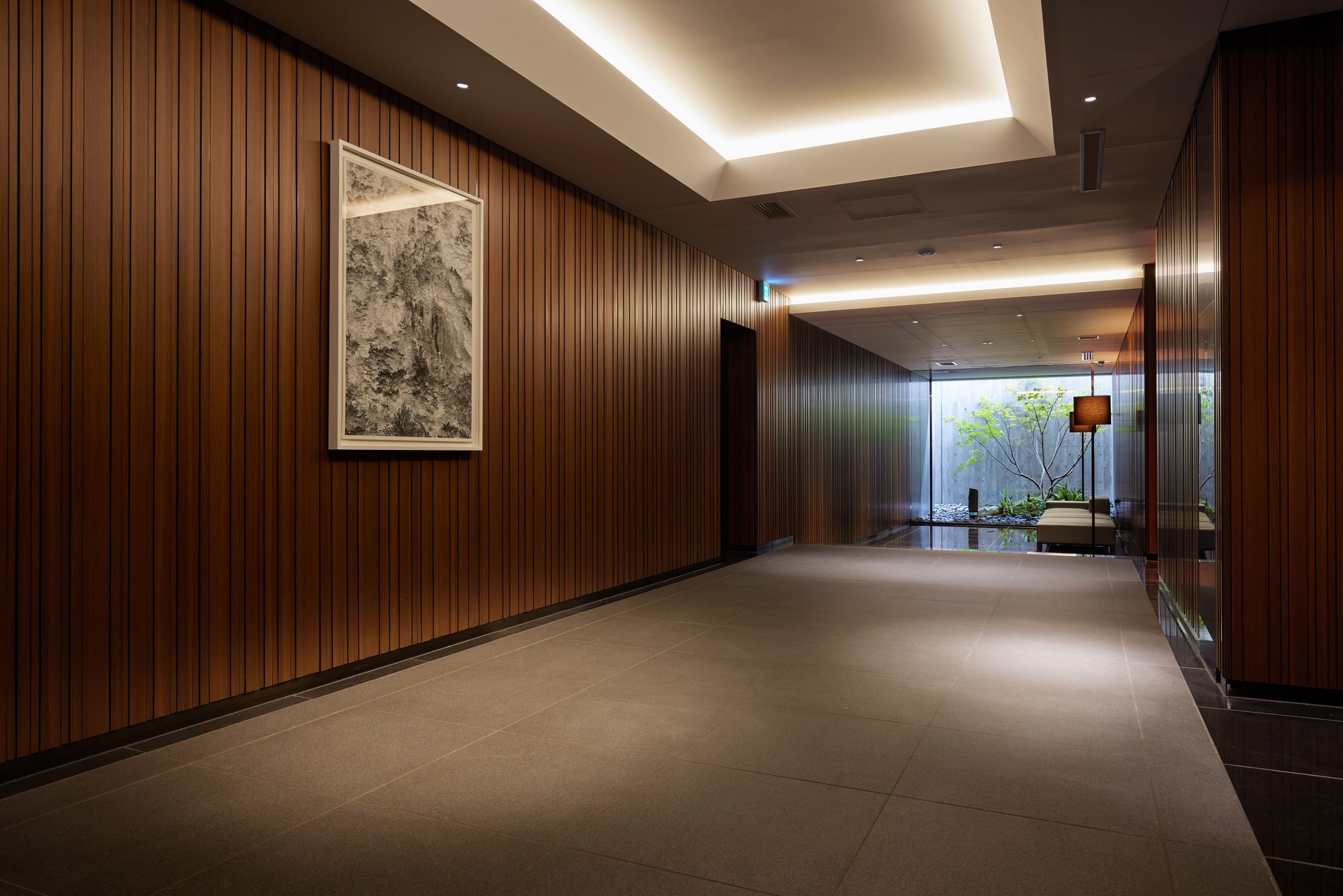伝統美とモダンデザインを調和させた、シンボリックなアプローチを進むと、壁面にアートが飾られたエントランスホールが続いています。そこは、国内海外のアーティスト達の作品が競演し、まるで美術館のような静かで凛とした空間です。エントランスホール内には、築山風の中庭を眺めるラウンジも完備。その他、空の下で開放的なリゾート感を満喫できるルーフテラスも用意されています。都心にいることを忘れさせるような、静穏な日常を味わうことのできる共用空間です。