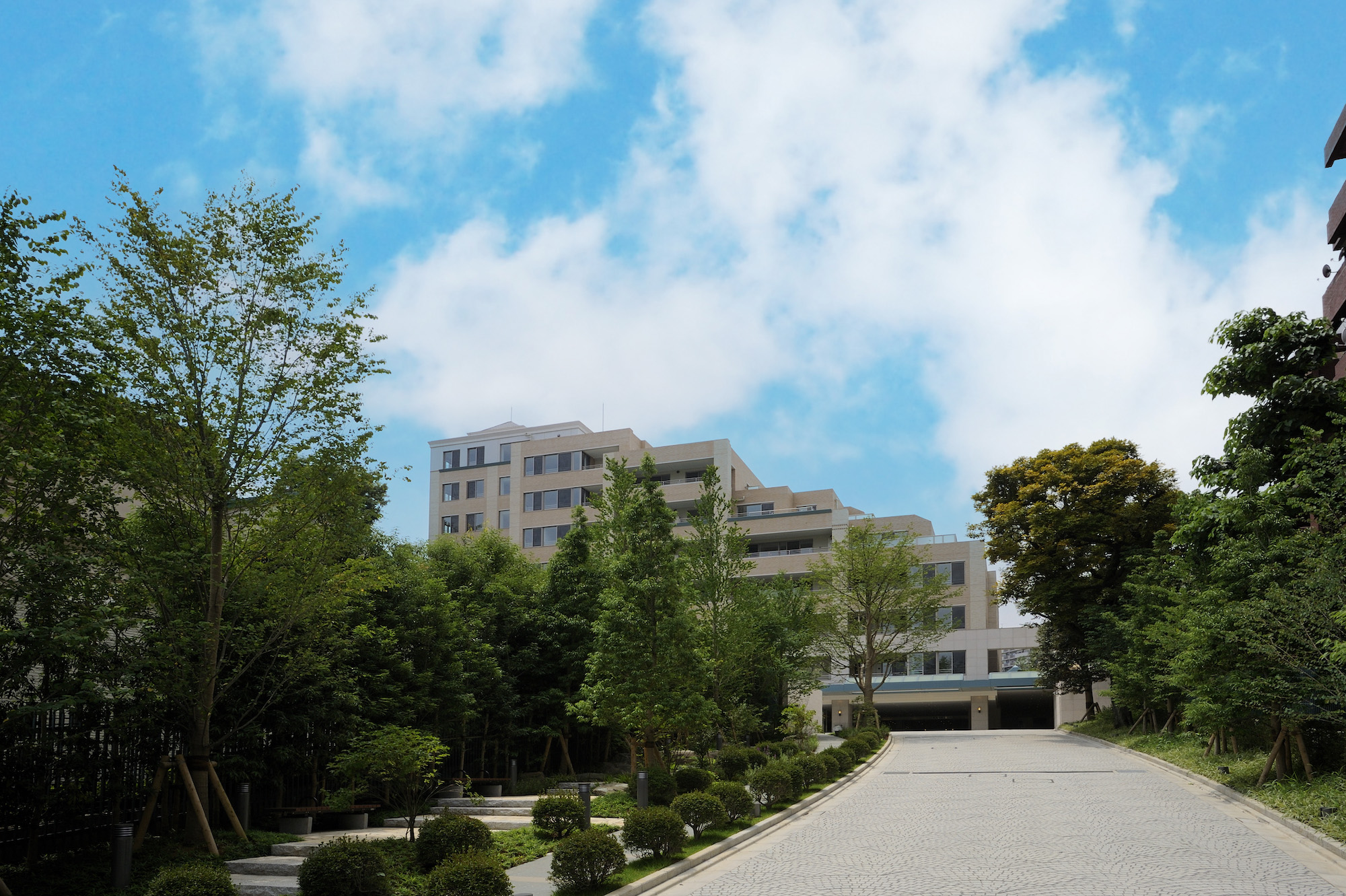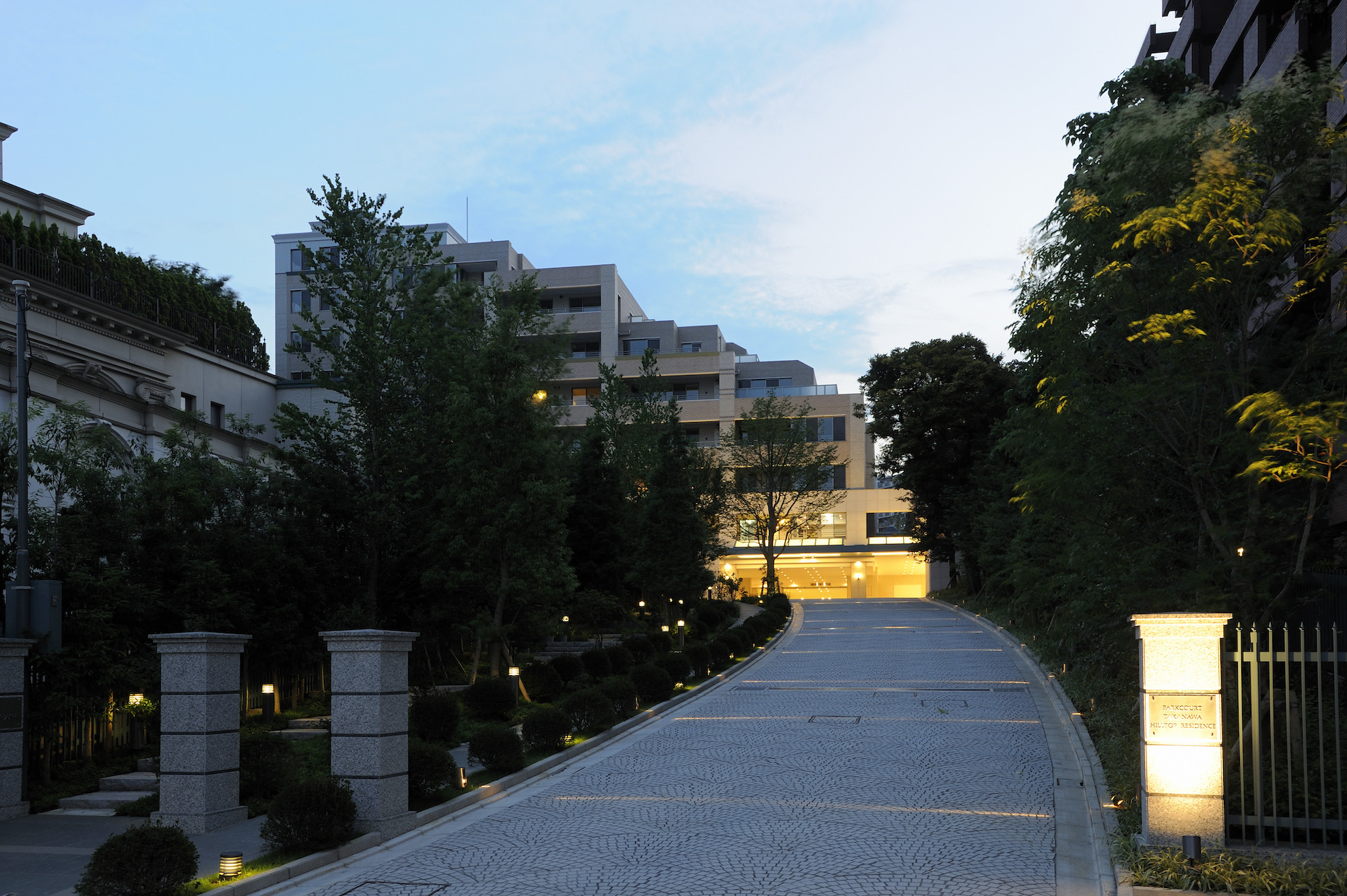 高き誇りを感じさせる、尖塔を備えたシンボリックな外観。結界性を創りだす、威厳のある門柱。緑のなか、住まう人を安らぎへと誘う長いアプローチ。時の積み重ねを美しく見せる既存樹と庭石。高輪の、丘の上の邸宅に相応しい条件を備え、この街そのものの資産ともいえるレジデンスです。一枚一枚職人の手で焼かれ、時とともに風合いを増すスレンダーモザイクタイルを外壁に取り入れるなど、微細なニュアンスにもこだわり、本物の上質を追求しています。