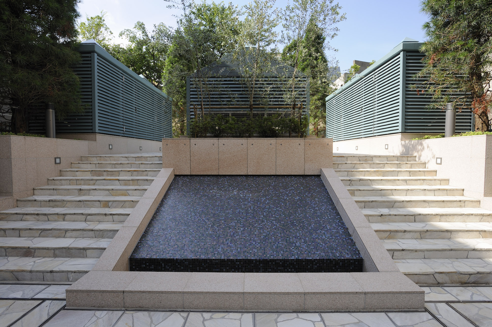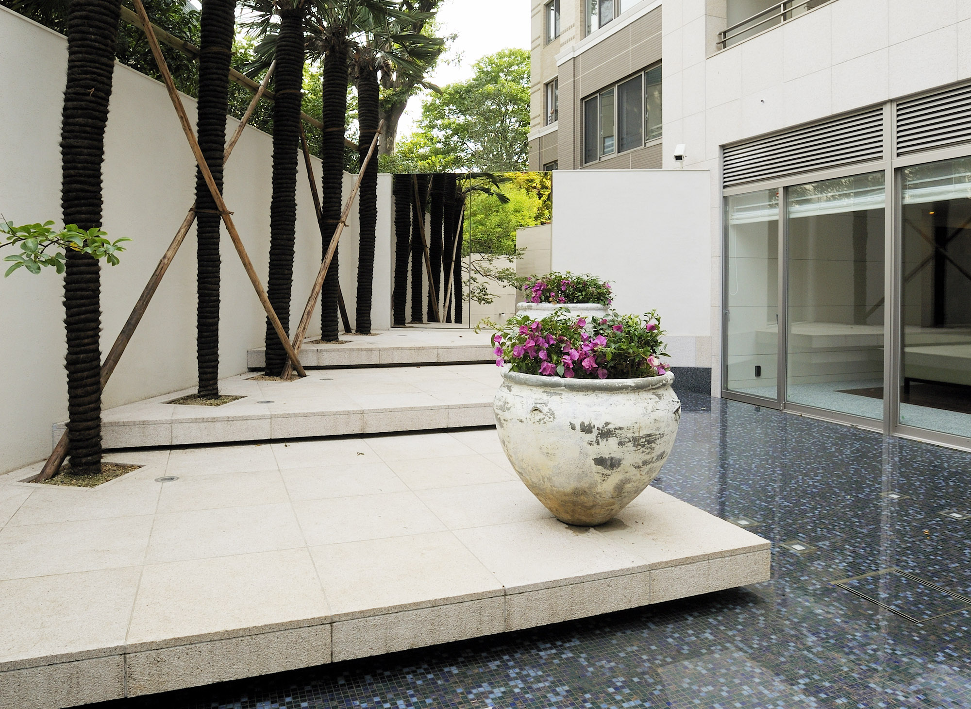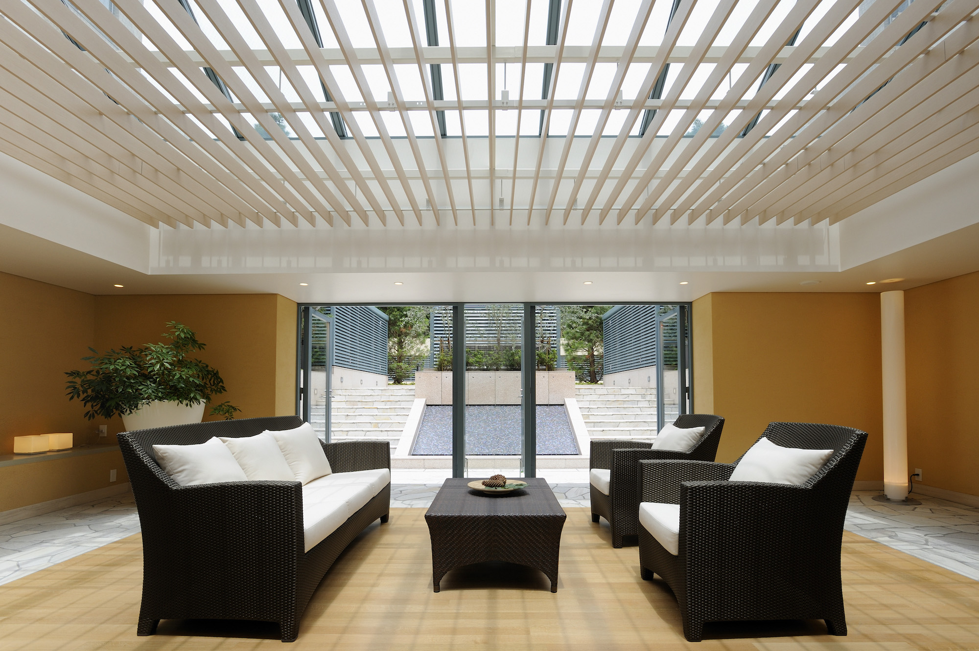コモンスペースの中心となる「サロン」は、吹き抜けで天井が高く、贅沢なくつろぎの空間です。やさしく光を放つライムストーンの壁と、ナチュラルオークで設えたライブラリーとの美しいコントラストが、モダンと伝統のハーモニーを生み出しています。パティオの中央にある「ガーデンハウス」は、リゾートにも似た開放感を感じられるスペース。天井のルーバーから陽光が差し込み、光と影のコントラストが心地いいリズムを演出しています。隣の「ガーデンテラス」では、水盤の流れ落ちる水の音に、心まで潤いで満たされ、都心にいることを忘れてしまうようなひと時を過ごすことができます。