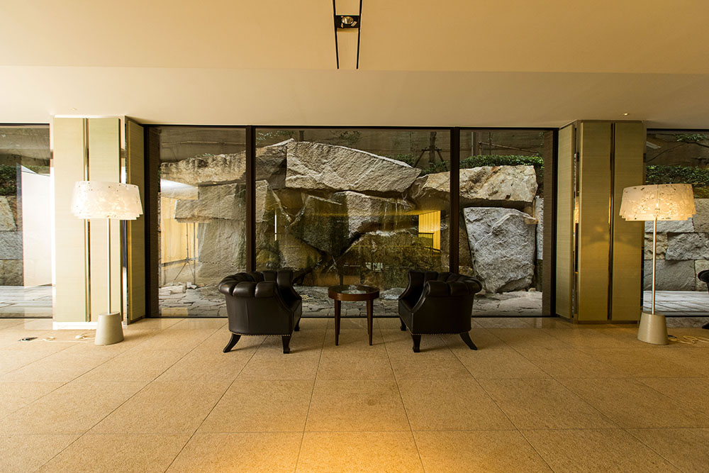 2階ロビーラウンジから眺める、水の流れるストーンガーデン「悠久」の石積み。
