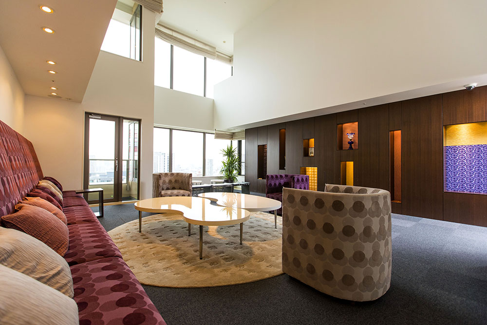 布の豊かな表情が幻想的な空間を創り出す、28階のプレミアムラウンジ。