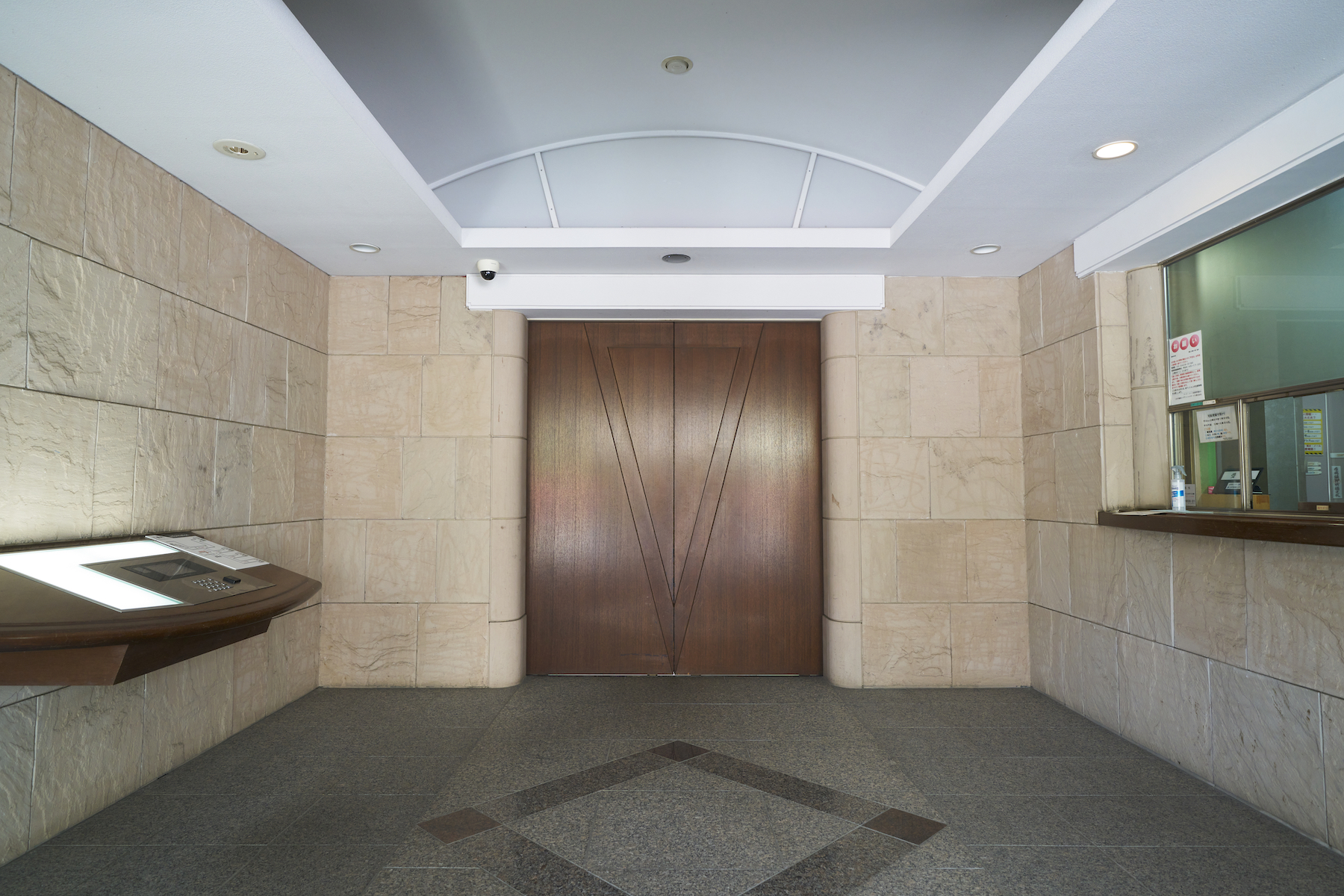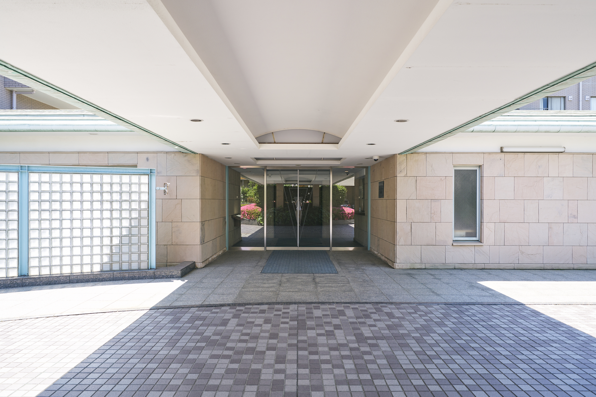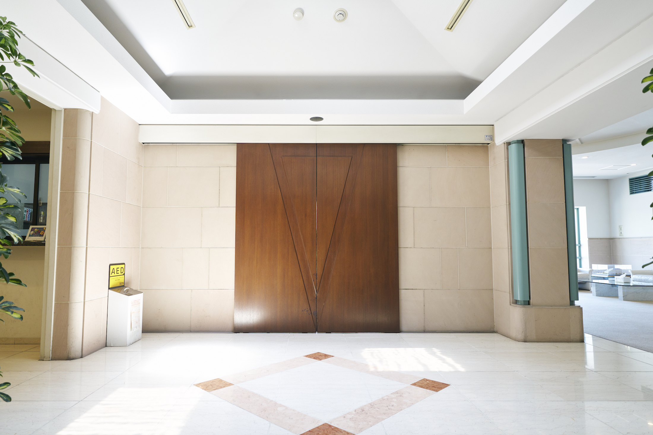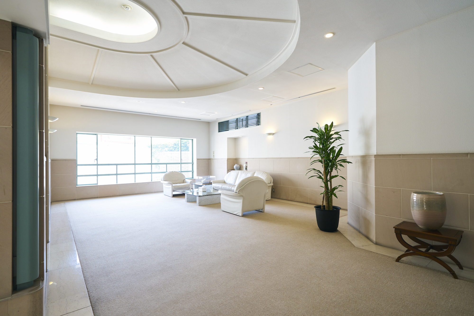 両サイドにグリーンスペースを配したタイル貼りのエントランスアプローチ。銅板仕上げのアーチ型屋根を施した車寄せ。壁には砂岩、床は御影石貼りと贅をこらした装いで、格調高い住まいの顔にふさわしいエントランスを形成しています。しっとりとした光沢を放つ大理石が敷きつめられたエントランスホールは、幾重にも美しく折り上げた高い天井に照明を効果的に配し、優雅で、かつ重厚な趣のある空間に。そのそばには、お客さまをおもてなしする共用の応接間として利用できるロビーが配されています。床には厚手のカーペット、天井はエントランスホールと同様に美しくデザインされた折り上げ天井で、さらに、ワイドスクリーン状の窓越しに広がる緑が、いっそうの趣を演出。贅沢な装いに包まれたやすらぎの空間です。