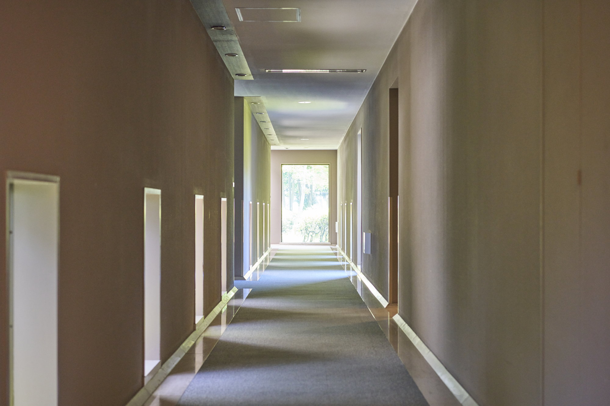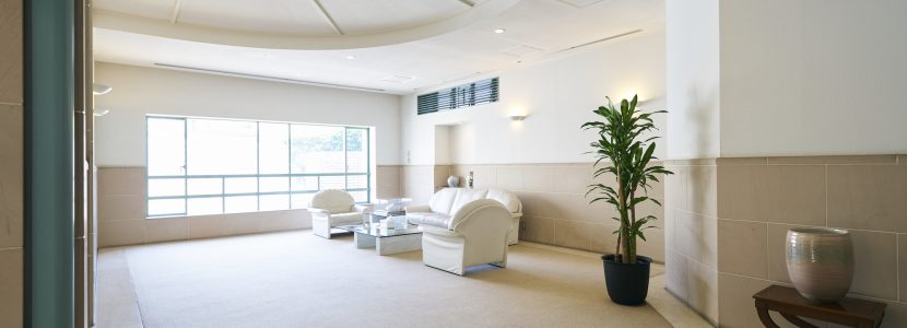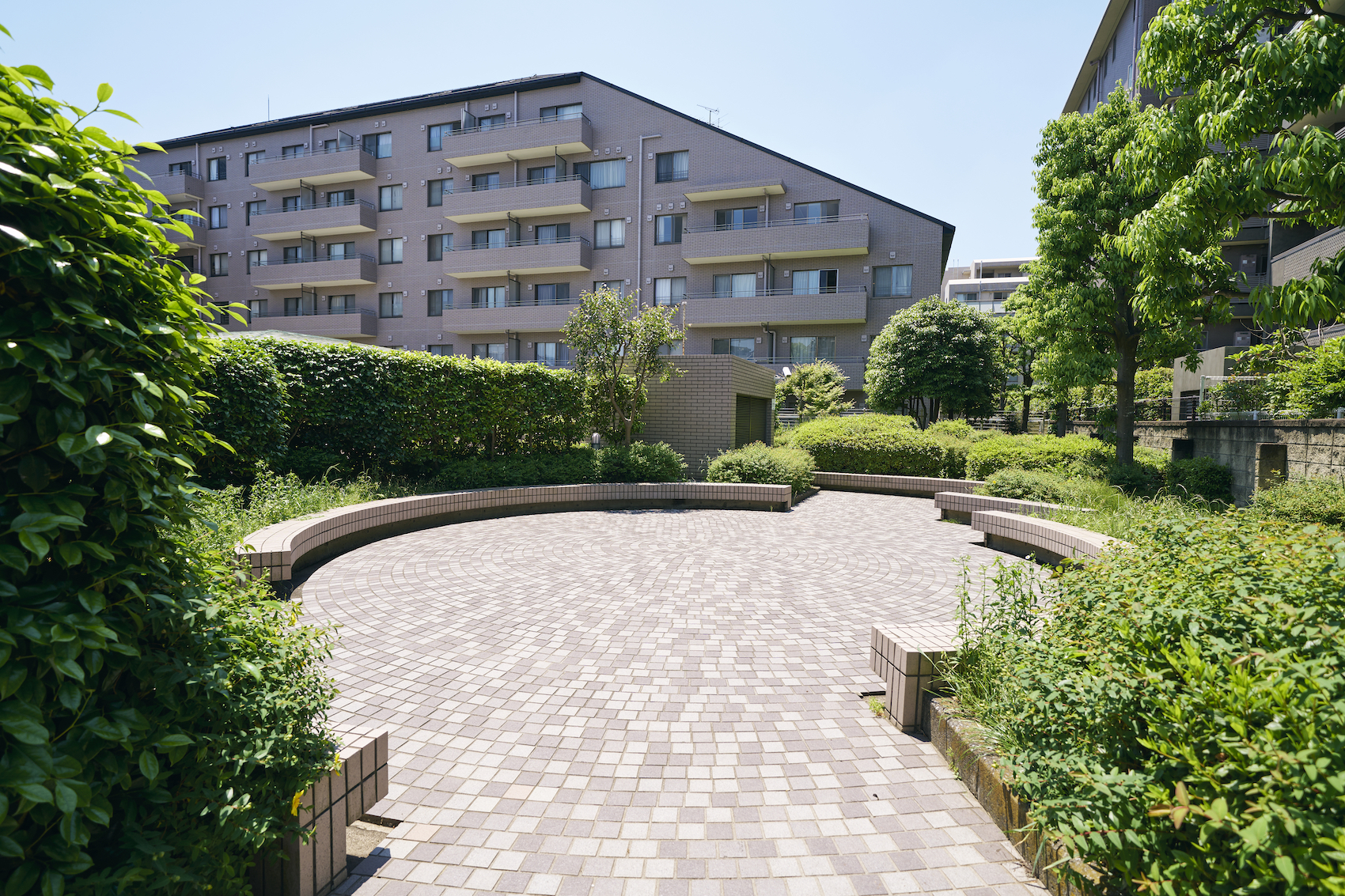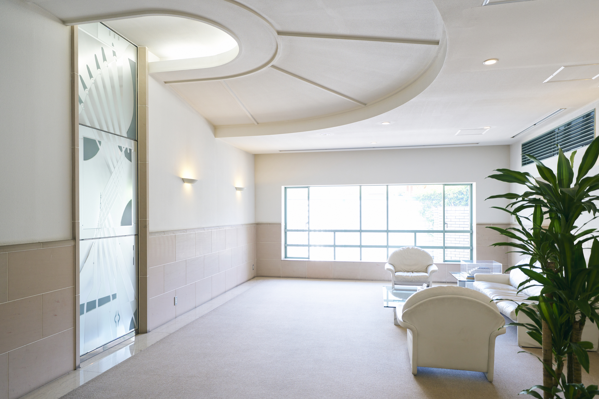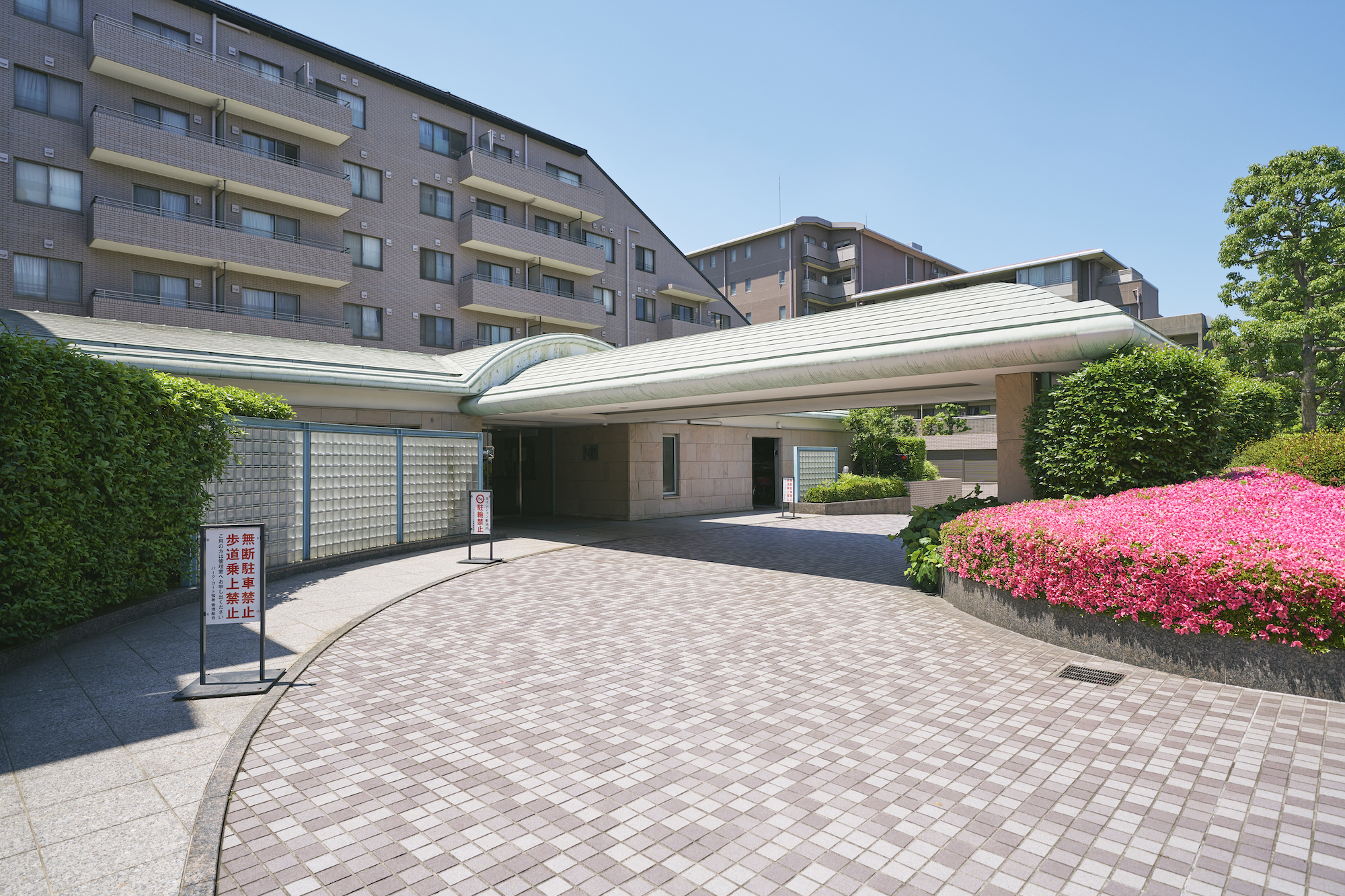 両サイドにグリーンスペースを配したタイル貼りのエントランスアプローチ。銅板仕上げのアーチ型屋根を施した車寄せ。壁には砂岩、床は御影石貼りと贅をこらした装いで、格調高い住まいの顔にふさわしいエントランスを形成しています。しっとりとした光沢を放つ大理石が敷きつめられたエントランスホールは、幾重にも美しく折り上げた高い天井に照明を効果的に配し、優雅で、かつ重厚な趣のある空間に。そのそばには、お客さまをおもてなしする共用の応接間として利用できるロビーが配されています。床には厚手のカーペット、天井はエントランスホールと同様に美しくデザインされた折り上げ天井で、さらに、ワイドスクリーン状の窓越しに広がる緑が、いっそうの趣を演出。贅沢な装いに包まれたやすらぎの空間です。