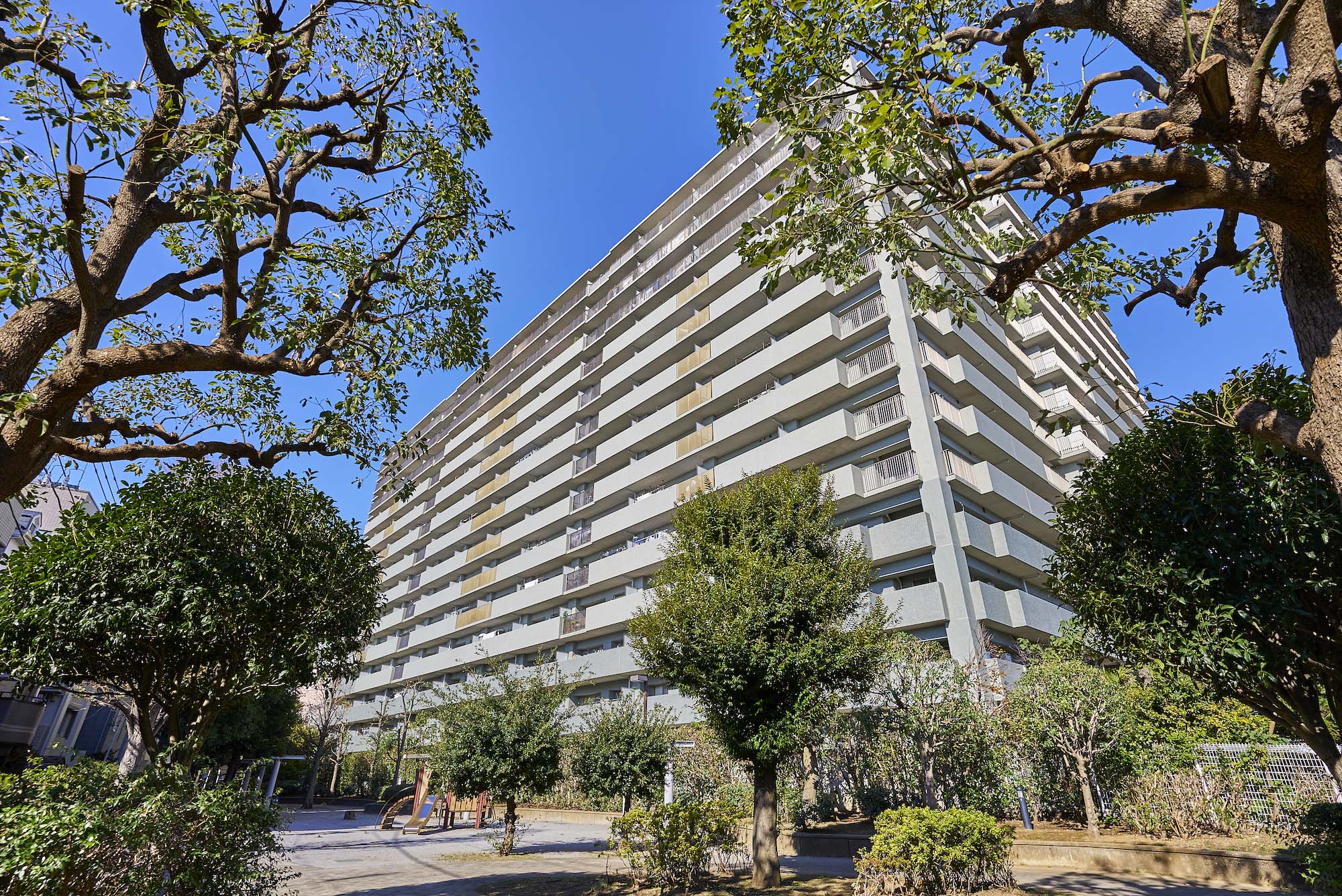 開発区域面積12,480.71㎡の広々とした敷地に、空地60%以上のゆとりを確保した「パーク・エステート上板橋」。地上14階建・全298戸の雄大なフォルムに、シックなグレー系のタイル貼り、ツートーンに色分けされたスタイリッシュな外観デザインです。敷地の中心、コの字型の住戸棟に囲まれるようにして建つエントランス棟は、勾配屋根が印象的な南欧風の外観で、重厚な住戸棟とのコントラストを成し、シンボル的な存在となっています。