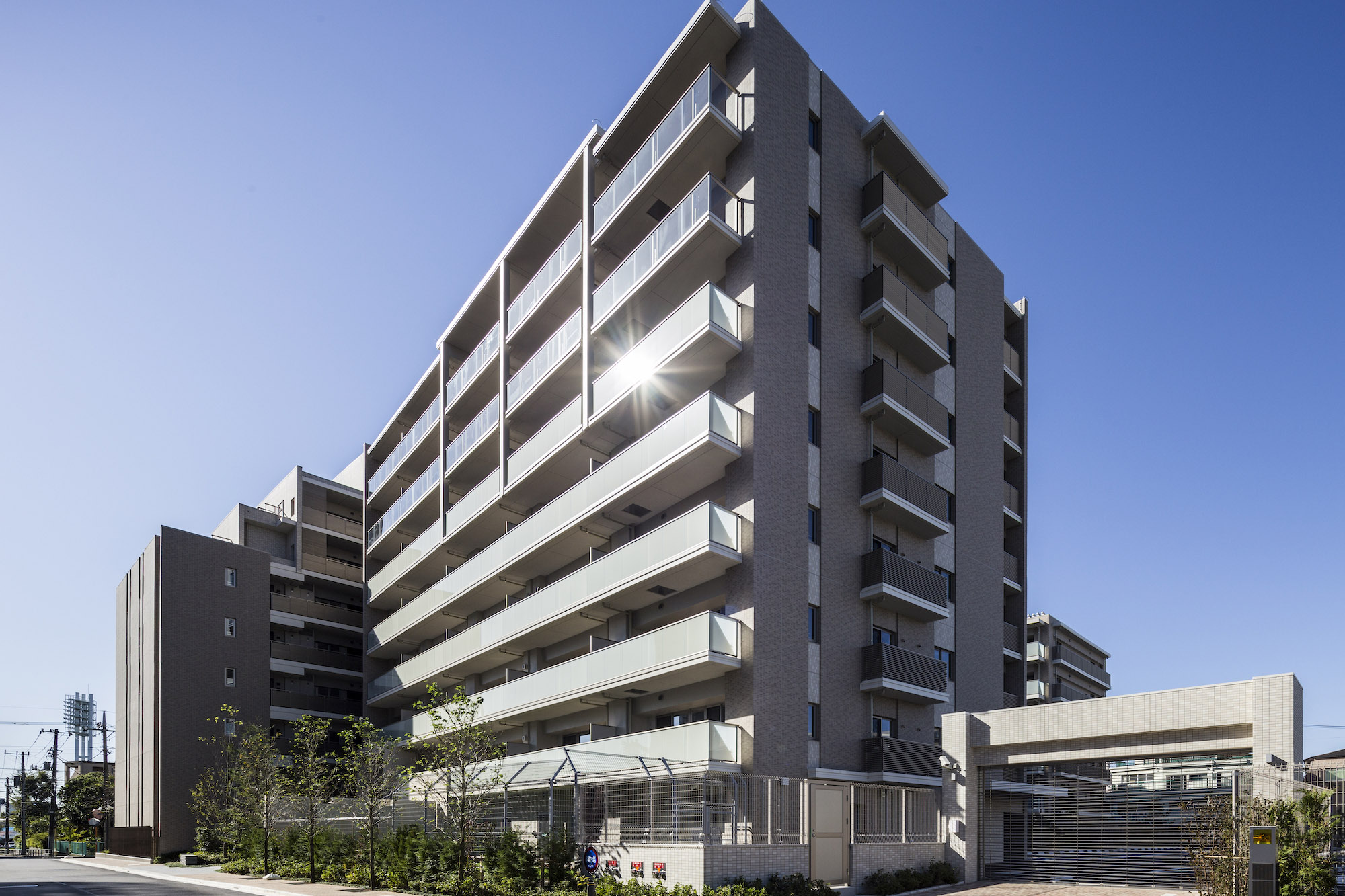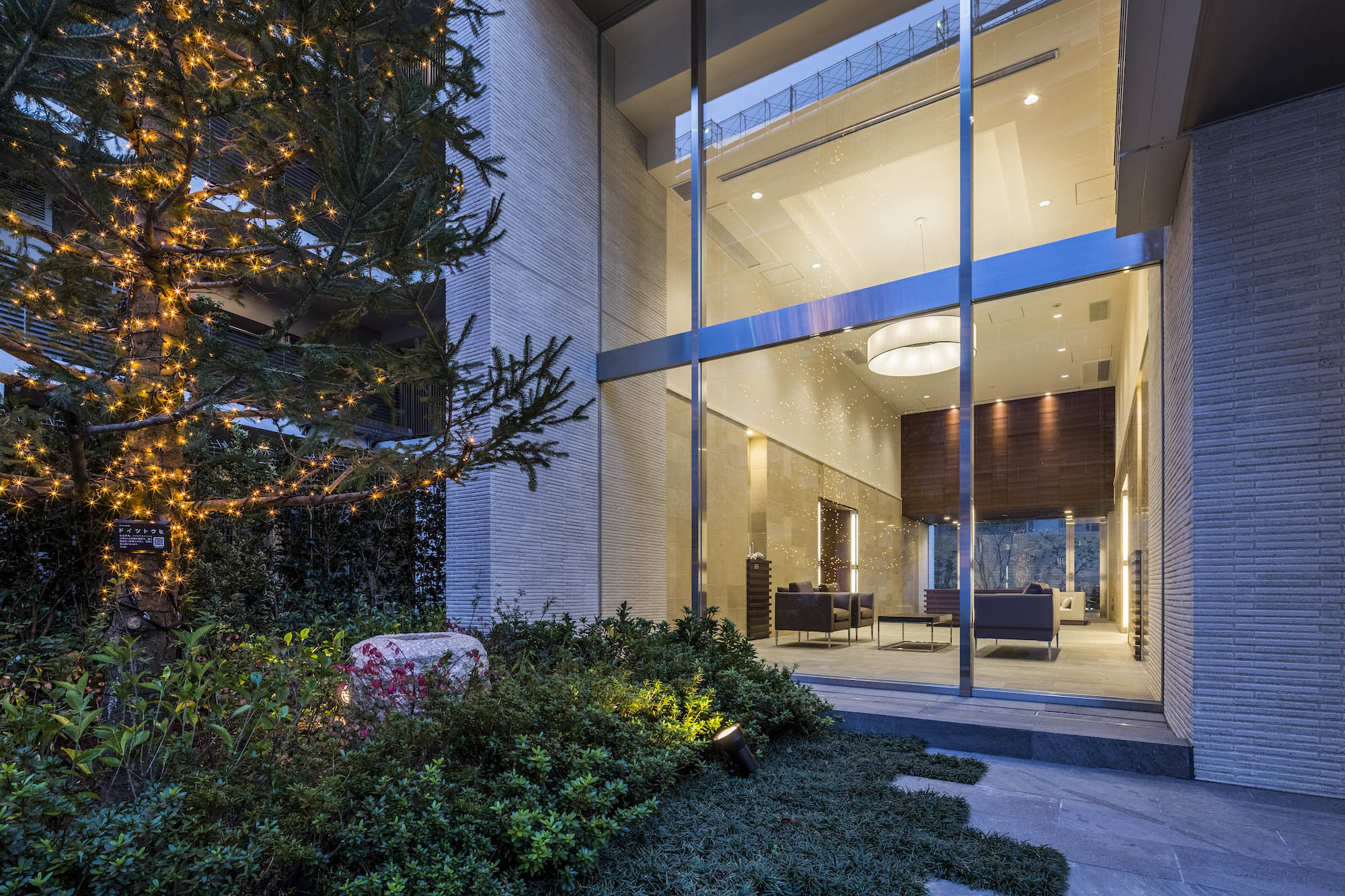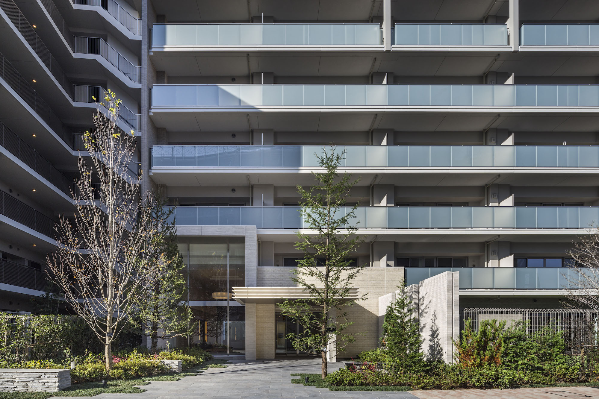 基壇部は、周囲とのつながりを意識し、アースカラーのタイルを採用。中・高層部には軽やかなベージュのタイルや、透明感のあるガラス手すりを設置し、空へ近づくほどに明るい印象をもたせています。さらに、ファサードに建物を分節するマリオンを設置。スケールの大きな建物でありながら、周辺の街並みと馴染む建物となっています。住まいの顔となるメインエントランスには、存在感を高めるボーダータイル、大きく張り出したスタイリッシュな庇、二層吹抜け・ガラス張りのラウンジなどを設け、住まう方を迎える上質な空間を追求。素材一つひとつの質感や色調にもこだわり、この地のランドマークに相応しいデザインが施されています。