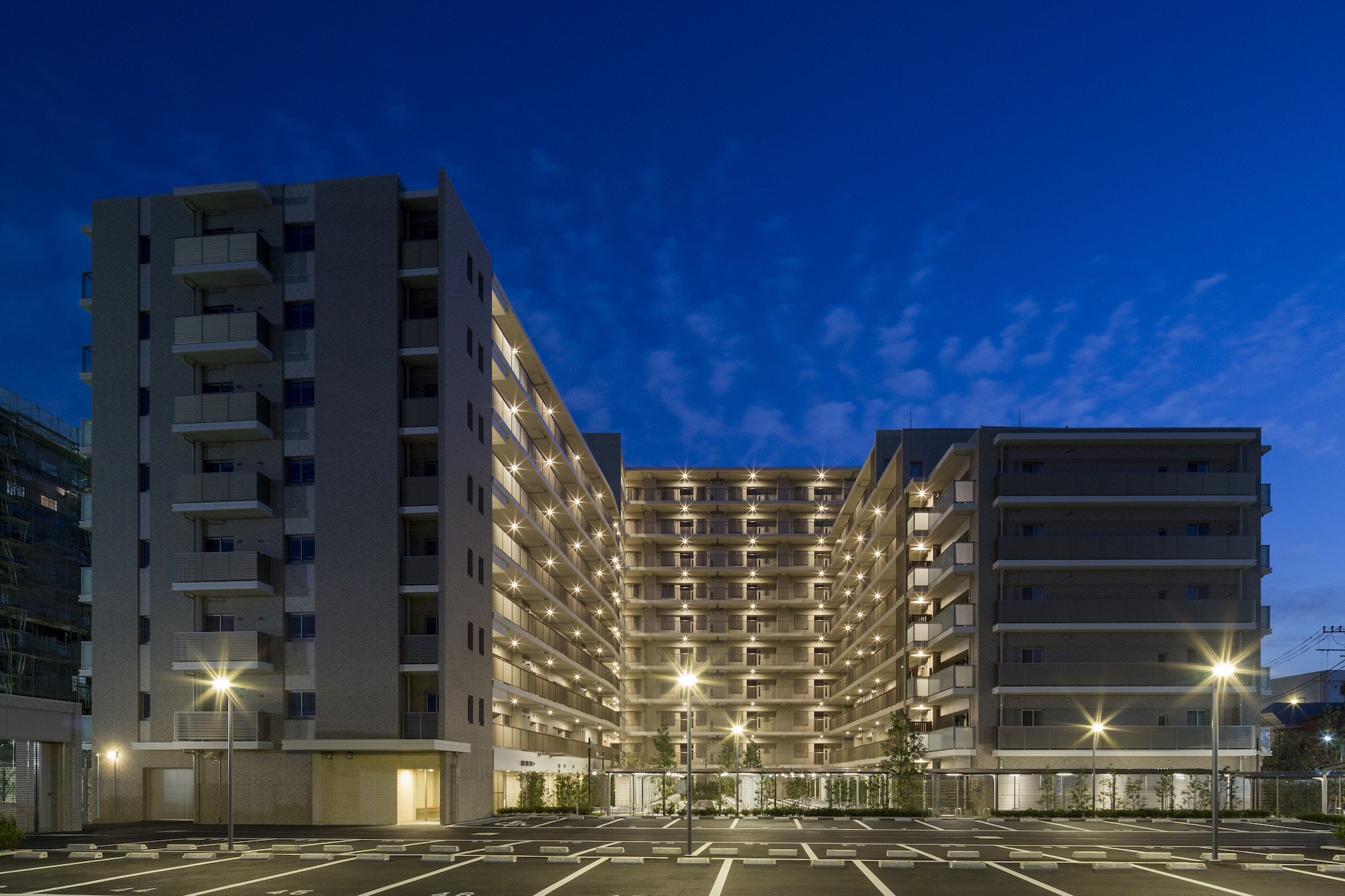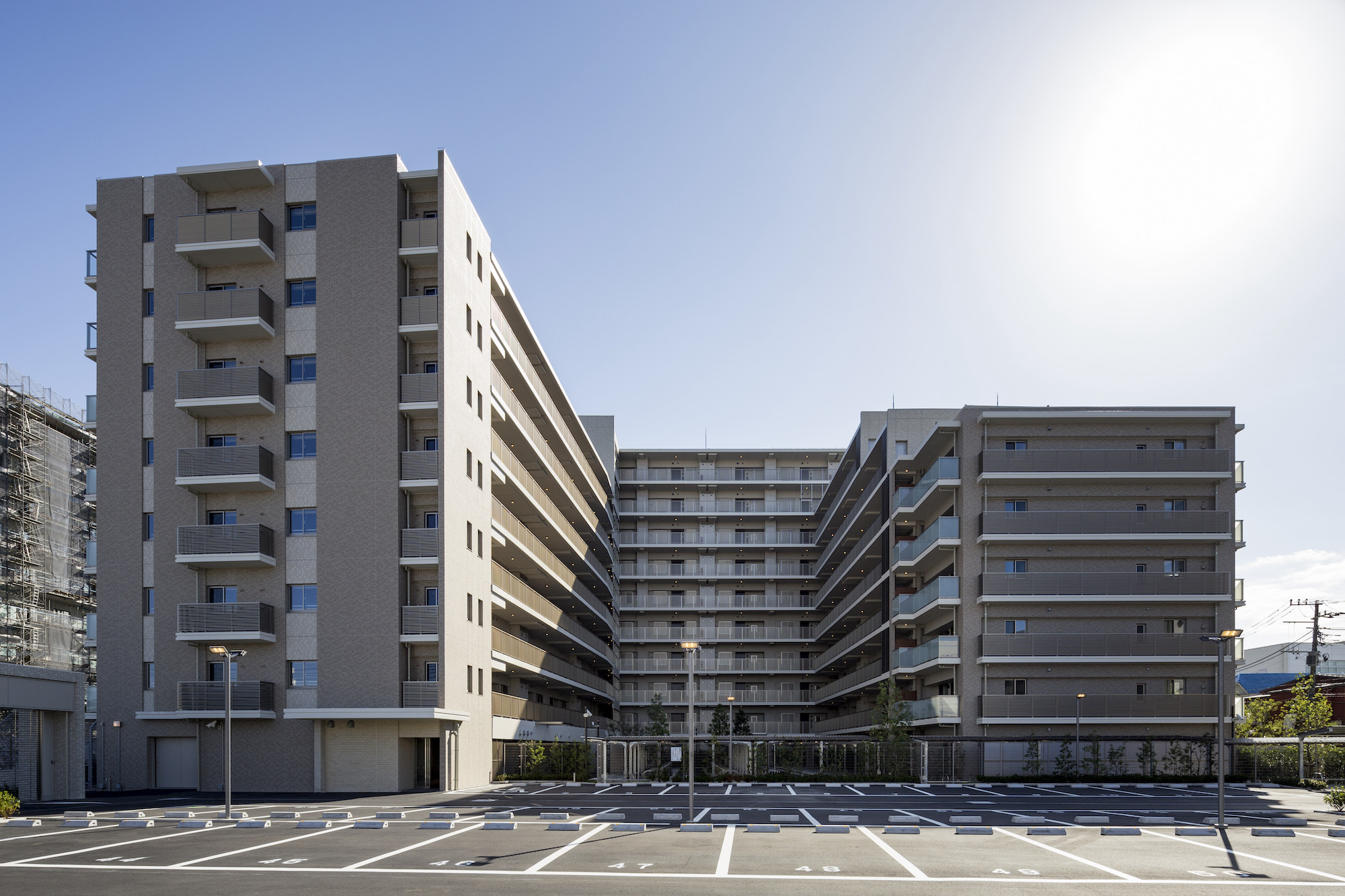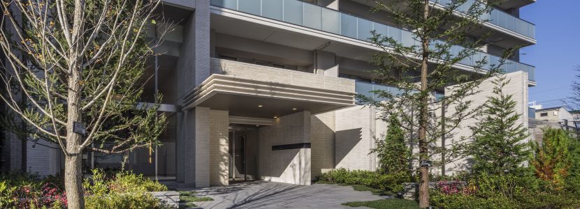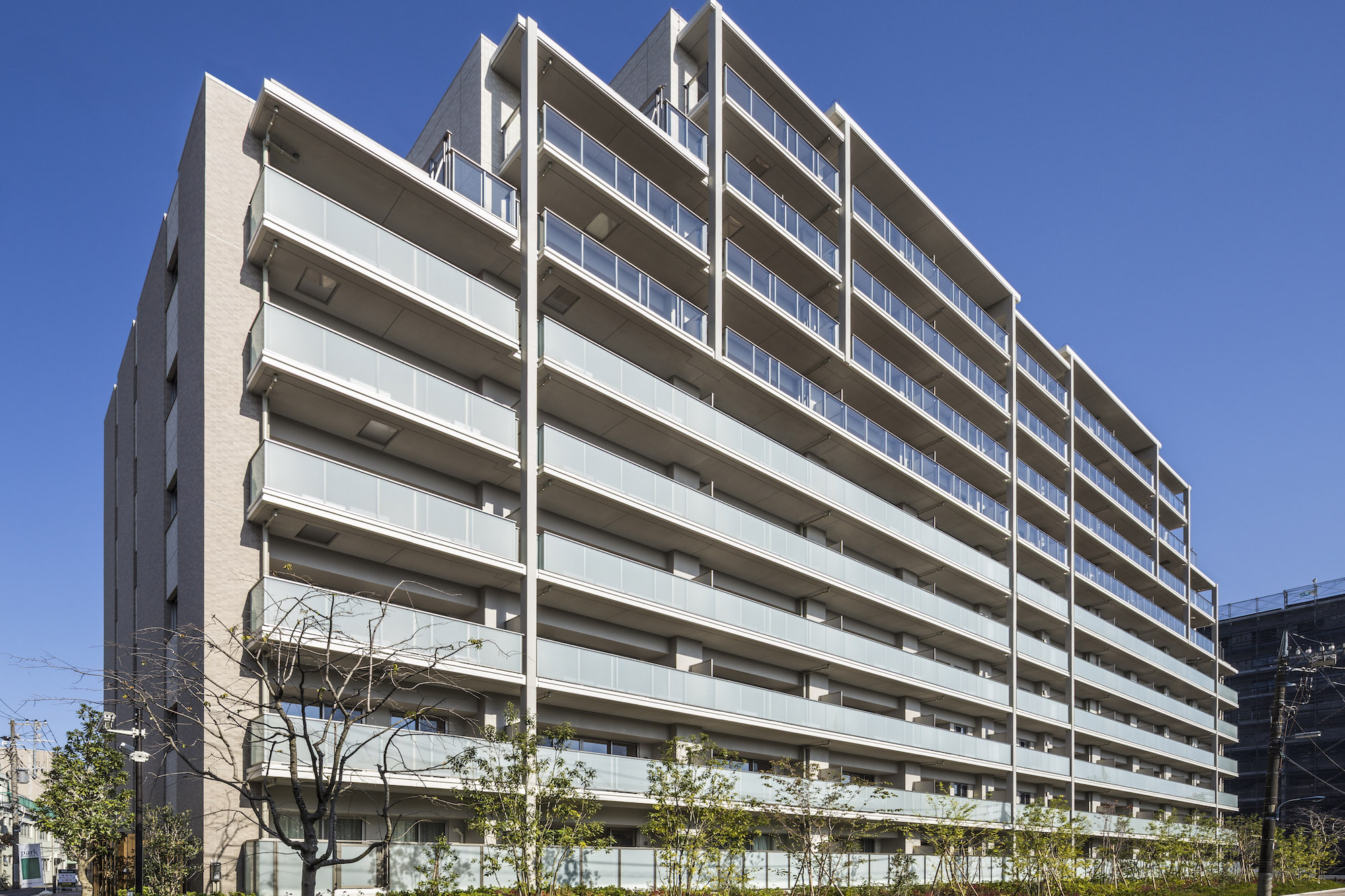 基壇部は、周囲とのつながりを意識し、アースカラーのタイルを採用。中・高層部には軽やかなベージュのタイルや、透明感のあるガラス手すりを設置し、空へ近づくほどに明るい印象をもたせています。さらに、ファサードに建物を分節するマリオンを設置。スケールの大きな建物でありながら、周辺の街並みと馴染む建物となっています。住まいの顔となるメインエントランスには、存在感を高めるボーダータイル、大きく張り出したスタイリッシュな庇、二層吹抜け・ガラス張りのラウンジなどを設け、住まう方を迎える上質な空間を追求。素材一つひとつの質感や色調にもこだわり、この地のランドマークに相応しいデザインが施されています。