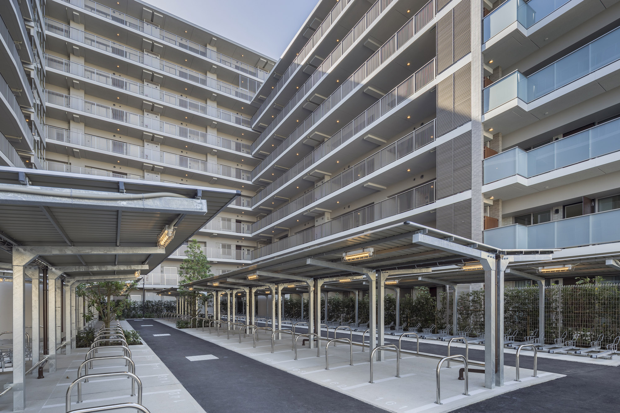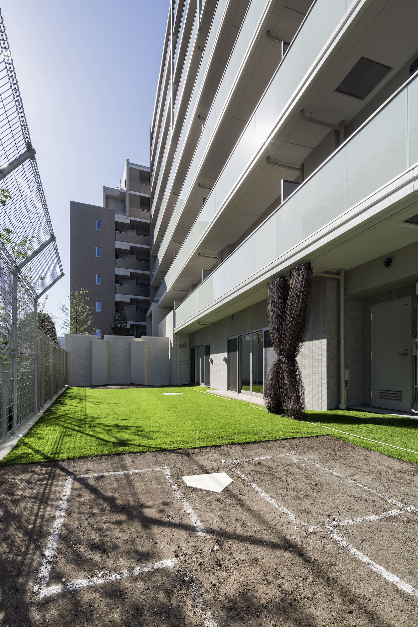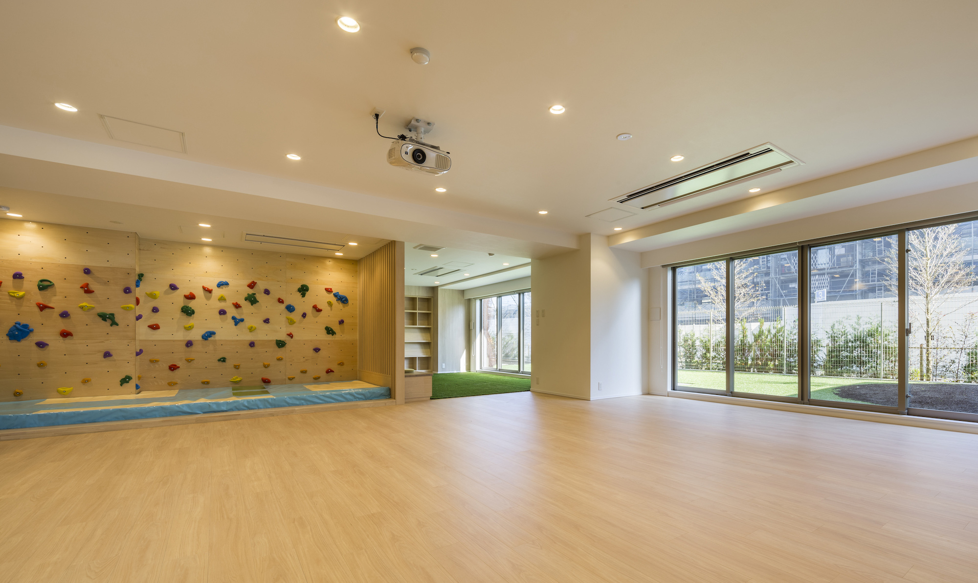 住まう方が行き交うメインエントランスの近くにある「クロッシングサロン(集会室)」には、ミーティングやサークル活動などにも利用できる広々とした空間を中心に、6つのテーマを掲げたスペースが設けられています。“Healthy”がテーマのスペースにはヨガなどを楽しめる大型ミラー、“Community”のスペースにはスポーツ観戦できるスクリーンを設置。“Kid’s”は小さな子供向けのボルダリングスペース、“Culture”は書籍を楽しめるライブラリー空間です。ライブラリーには人工芝のマットを敷いた“Relax”エリアや、屋外には“Sports”をテーマにしたキッズマウンドも。人々が集い世代を超えて、豊かなシーンがつながり、自然と交流が育まれる空間が広がっています。