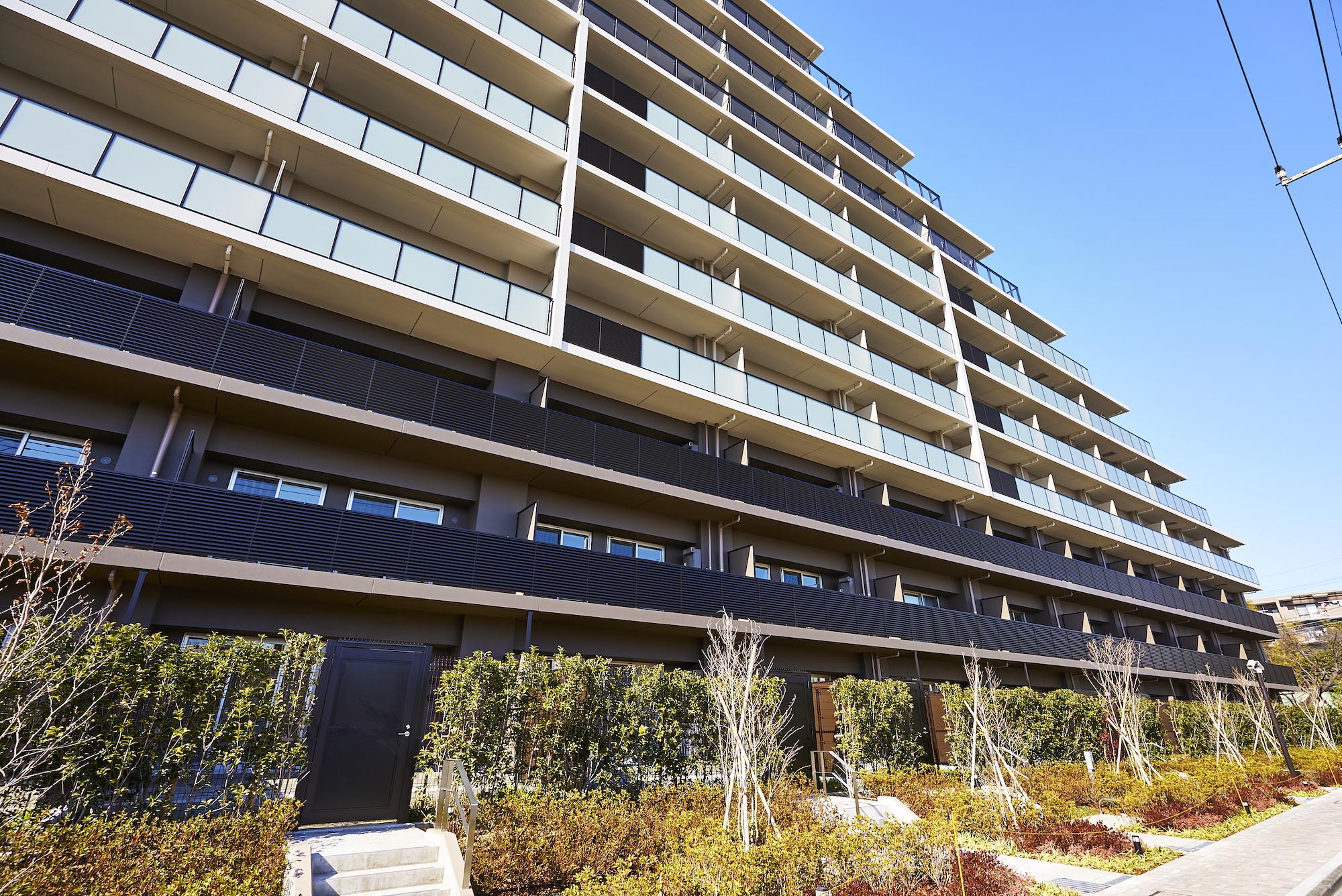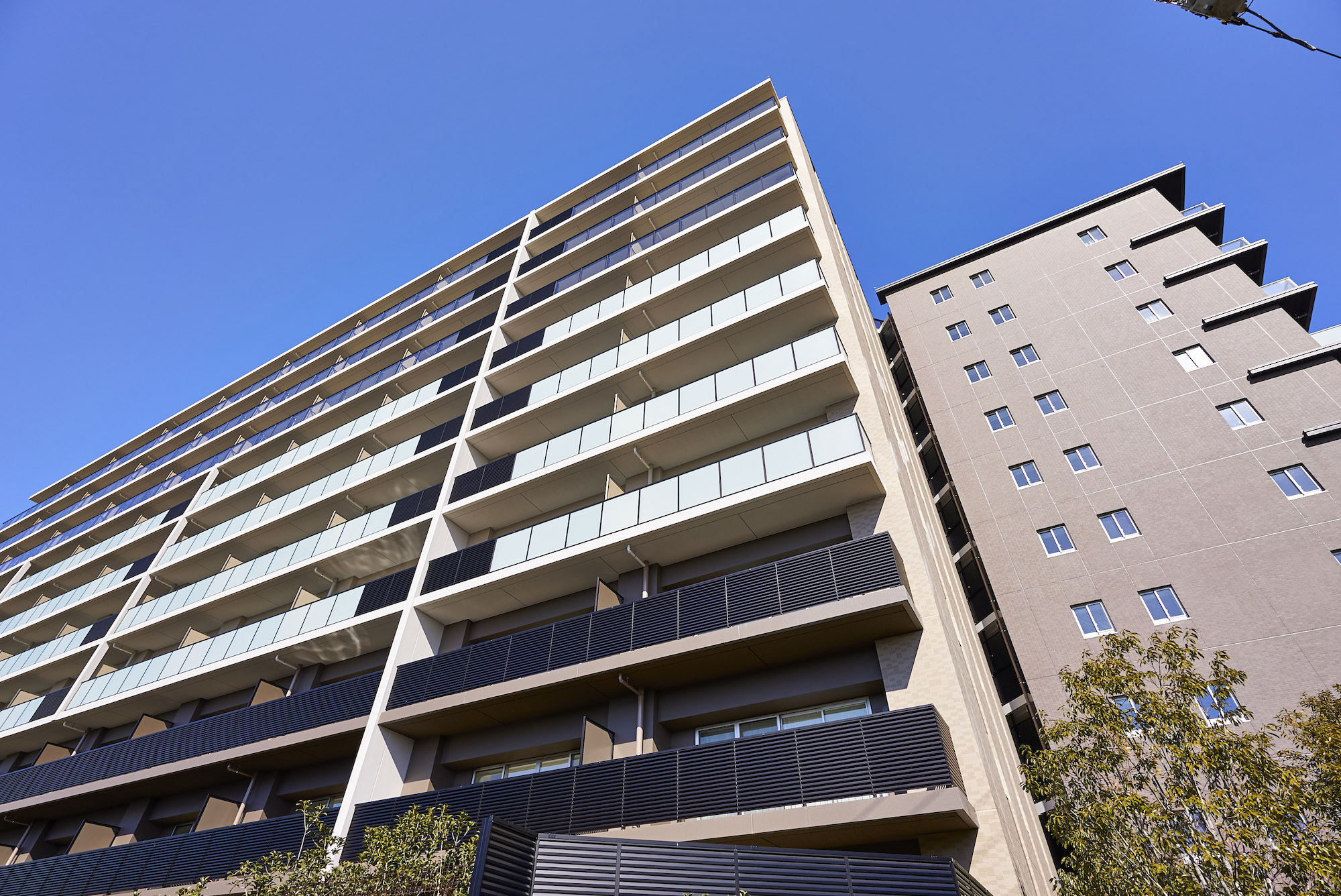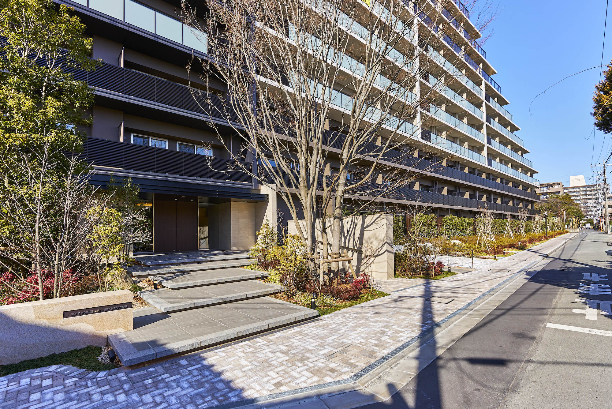 昭島を象徴する美しい自然。その緑を育む“空”と“水”、そして“大地”がファザードに表現されています。アースカラーを基調に壁面の色やルーバーを使い分けることで、大地のような重厚感のある基壇部から清らかな水を模した中層部、そして空へ溶け込むような上層部へとグラデーション状に色調を変化させ、洗練された佇まいを演出しています。リズミカルな階段や、豊かな樹々で迎えるエントランスは、メインストリートから一歩奥まった静謐な空間。緑陰のアプローチの先に広がるのは、安らぎに満ちた家族のオアシスです。