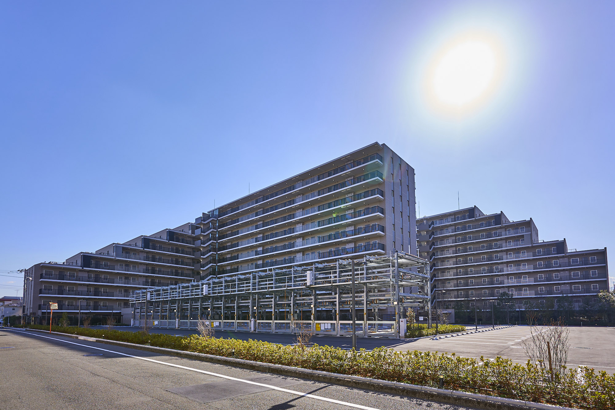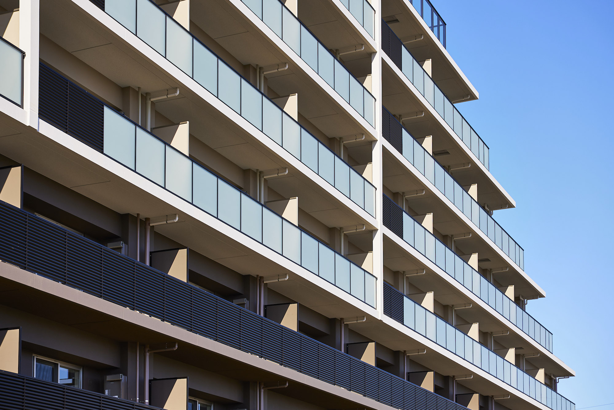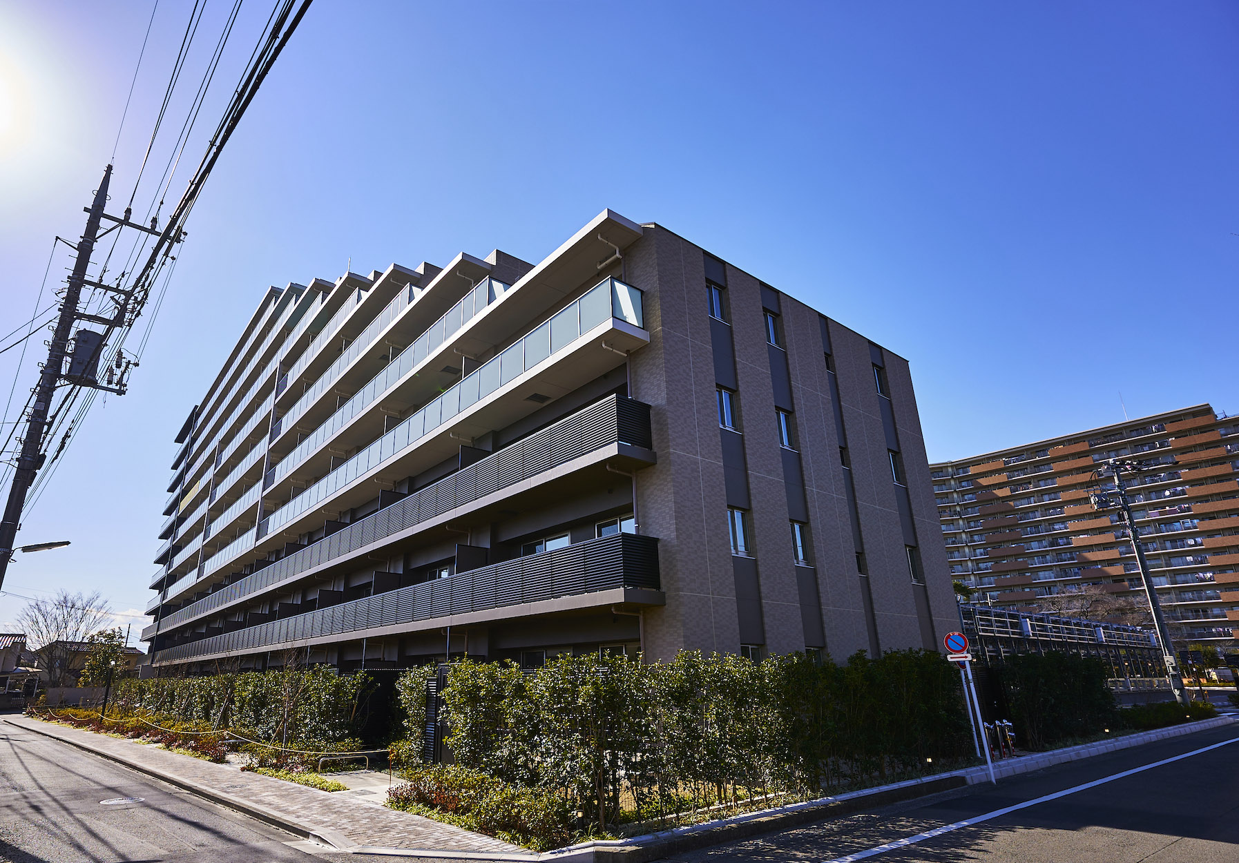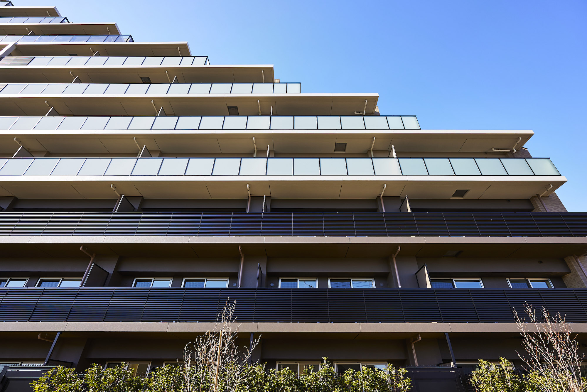 昭島を象徴する美しい自然。その緑を育む“空”と“水”、そして“大地”がファザードに表現されています。アースカラーを基調に壁面の色やルーバーを使い分けることで、大地のような重厚感のある基壇部から清らかな水を模した中層部、そして空へ溶け込むような上層部へとグラデーション状に色調を変化させ、洗練された佇まいを演出しています。リズミカルな階段や、豊かな樹々で迎えるエントランスは、メインストリートから一歩奥まった静謐な空間。緑陰のアプローチの先に広がるのは、安らぎに満ちた家族のオアシスです。