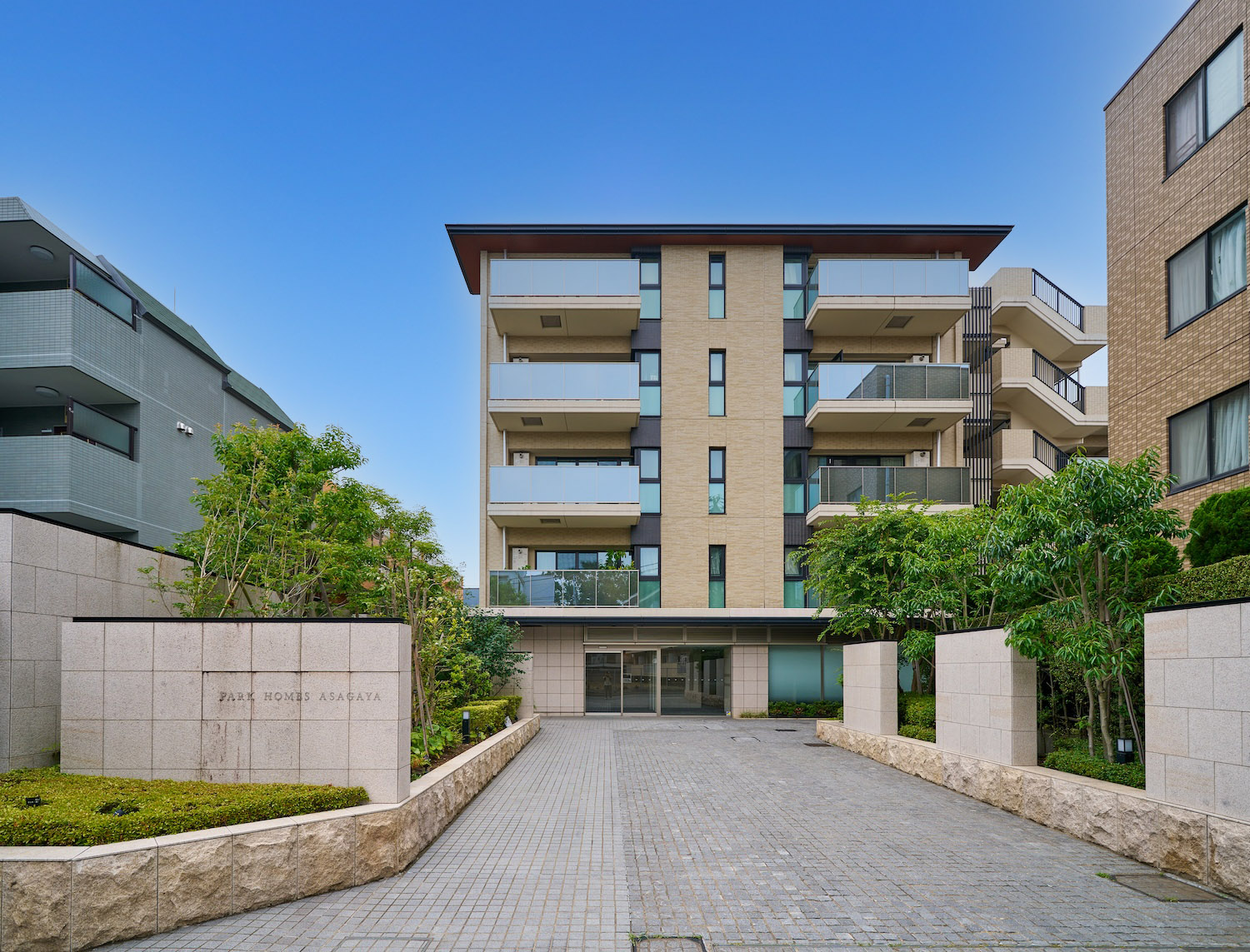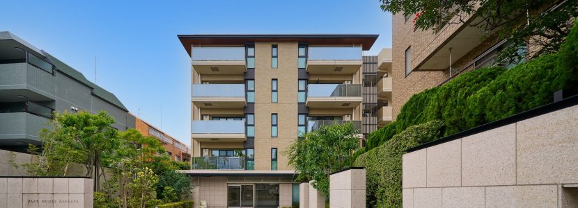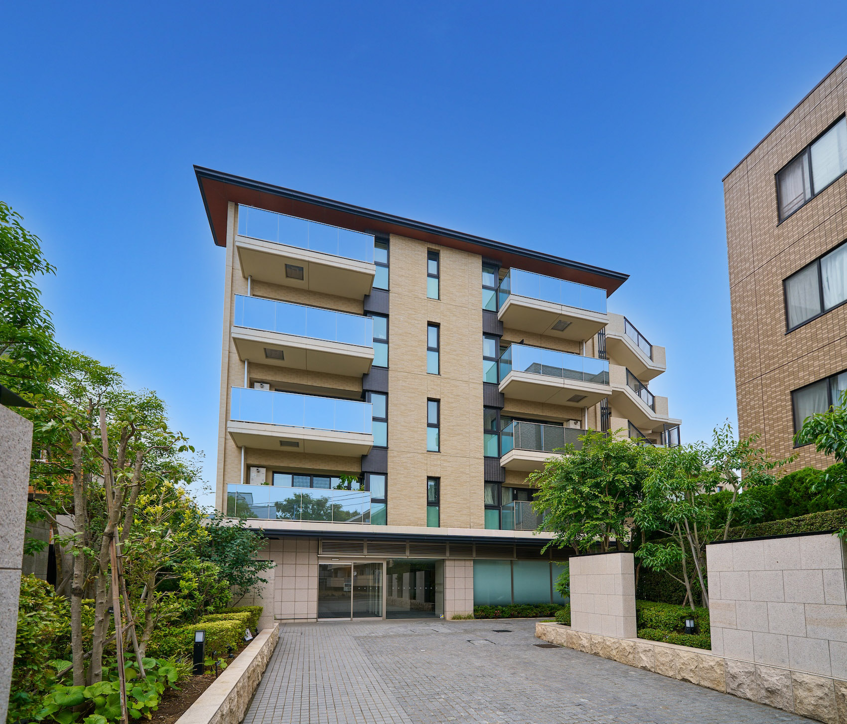 外壁には、風合いあるベージュのタイルを基調とし、色の濃いタイルをアクセントとして使用。周囲の景観に溶け込む、上質な佇まいを創出しています。長くとったアプローチには濃灰色の石を敷き詰め、周囲とシンクロさせる緑を配置。最上部に設えられた水平ラインを強調した庇が、住まいとしての品格を醸し出しています。