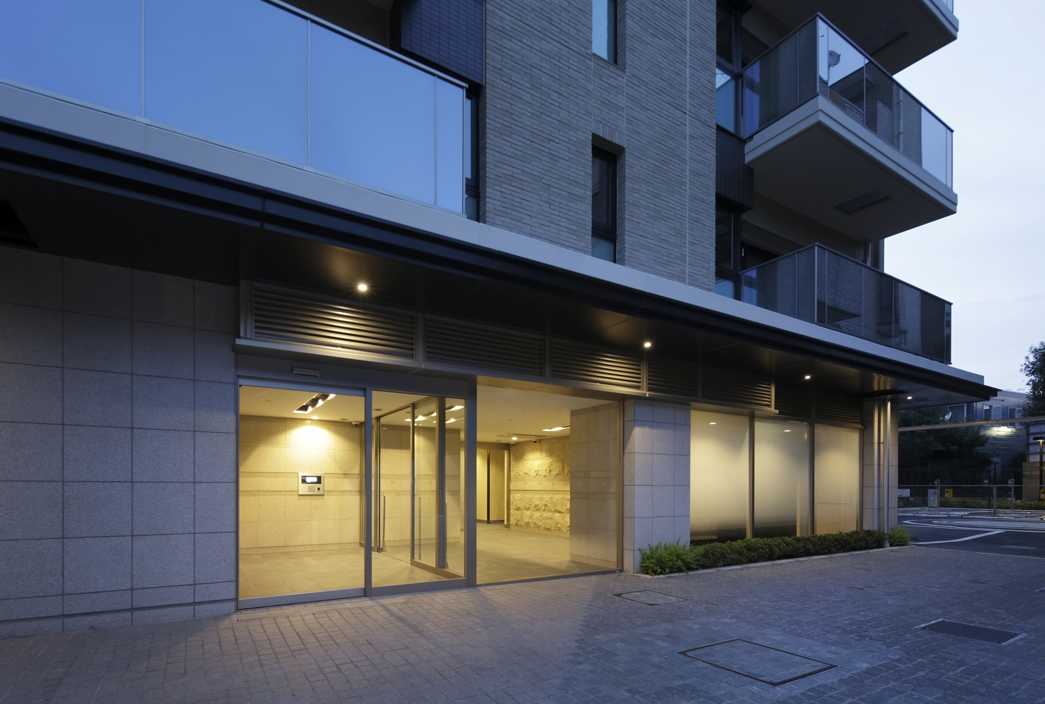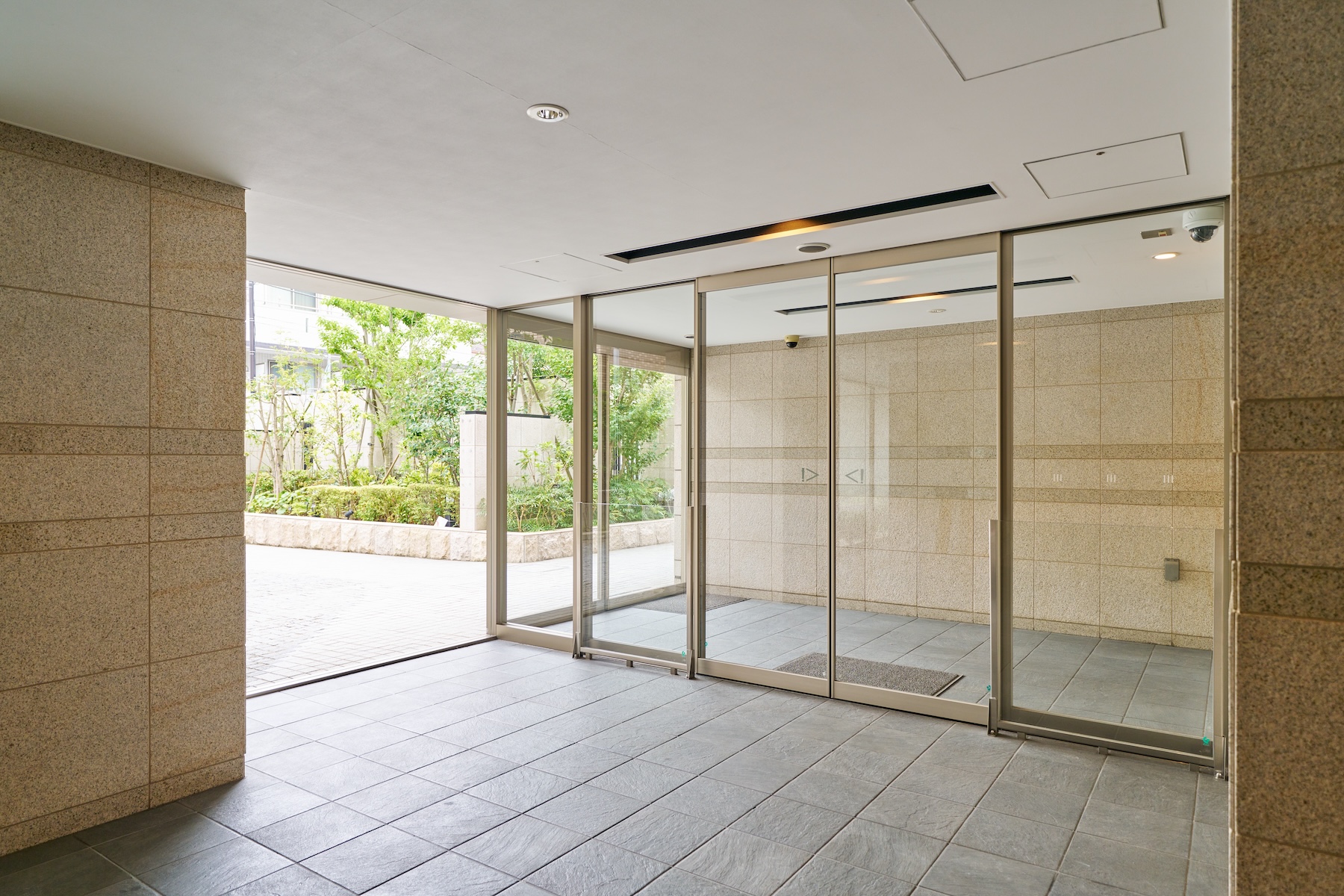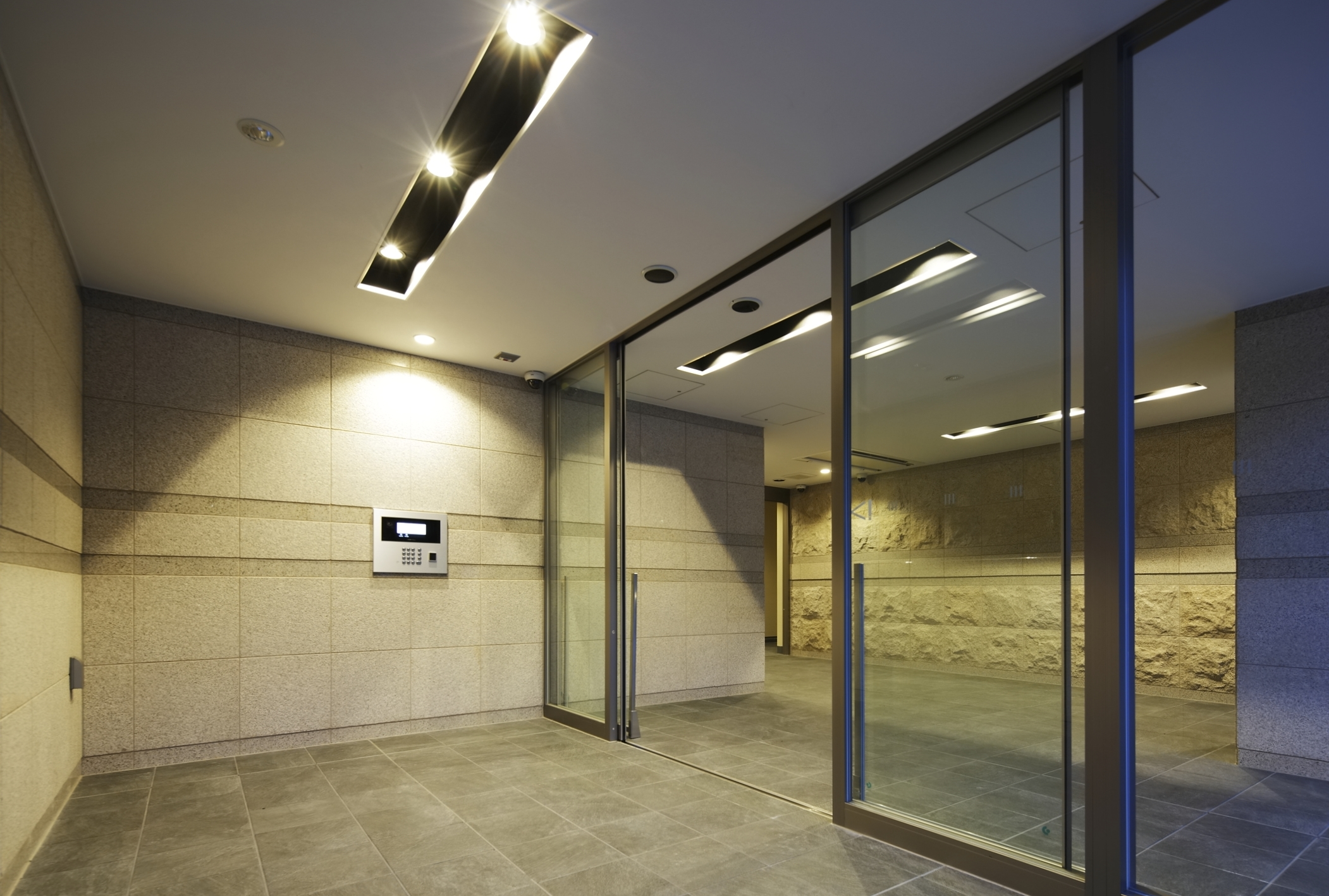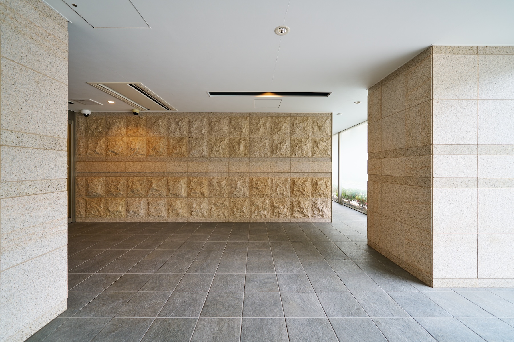 周囲とシンクロさせる緑を豊富に配した、ゆとりあるアプローチは、左右に壁を設けて囲まれ感をつくり、セキュリティにも配慮。エントランス内の壁には外構と同じ質感のある石が施されており、外と内部空間を繋ぎ、住まう方や訪れる方をさりげなくプライベート空間へと導きます。