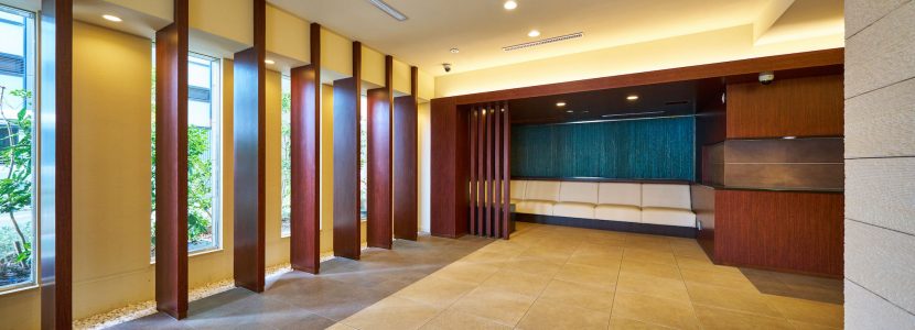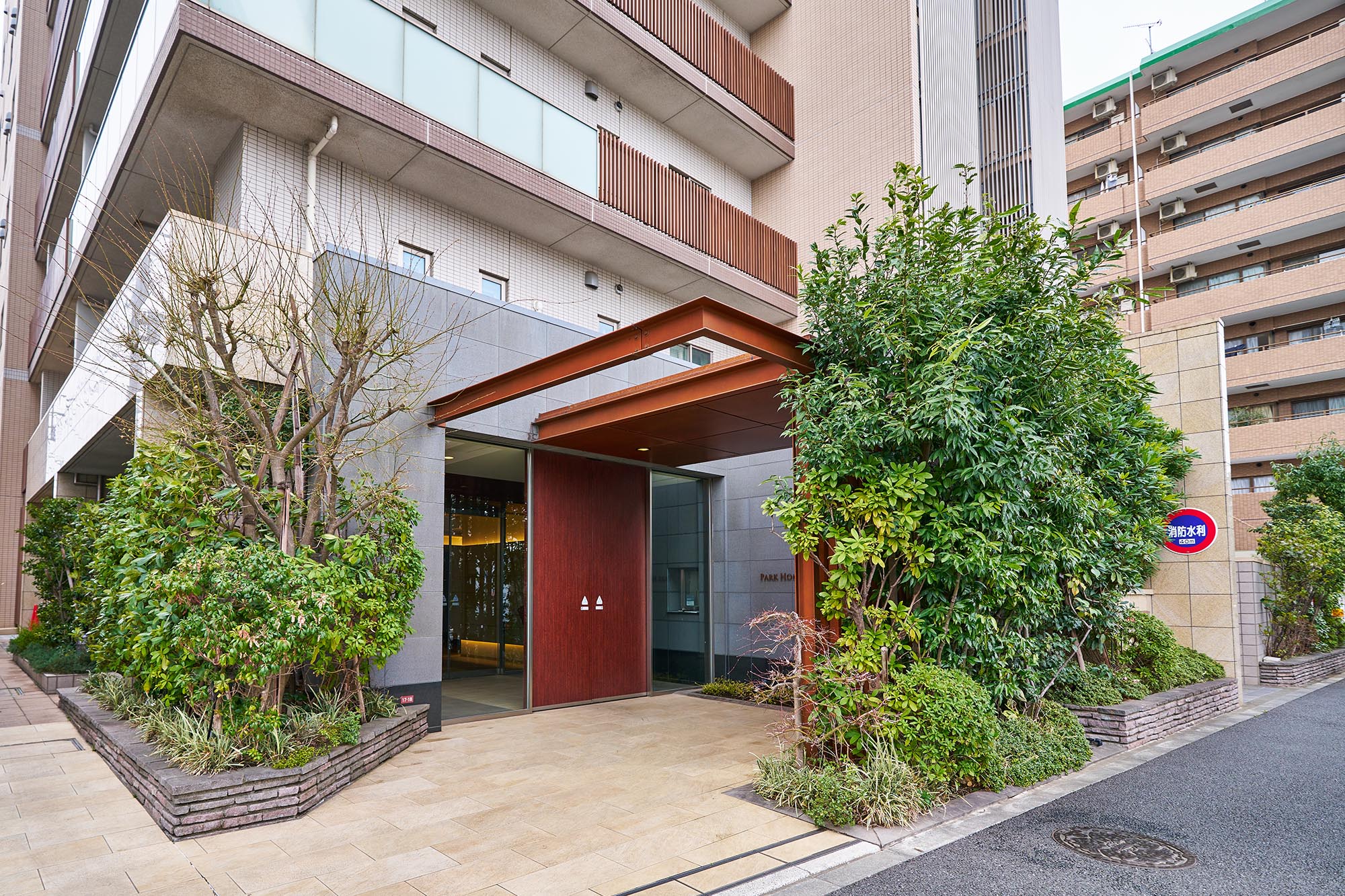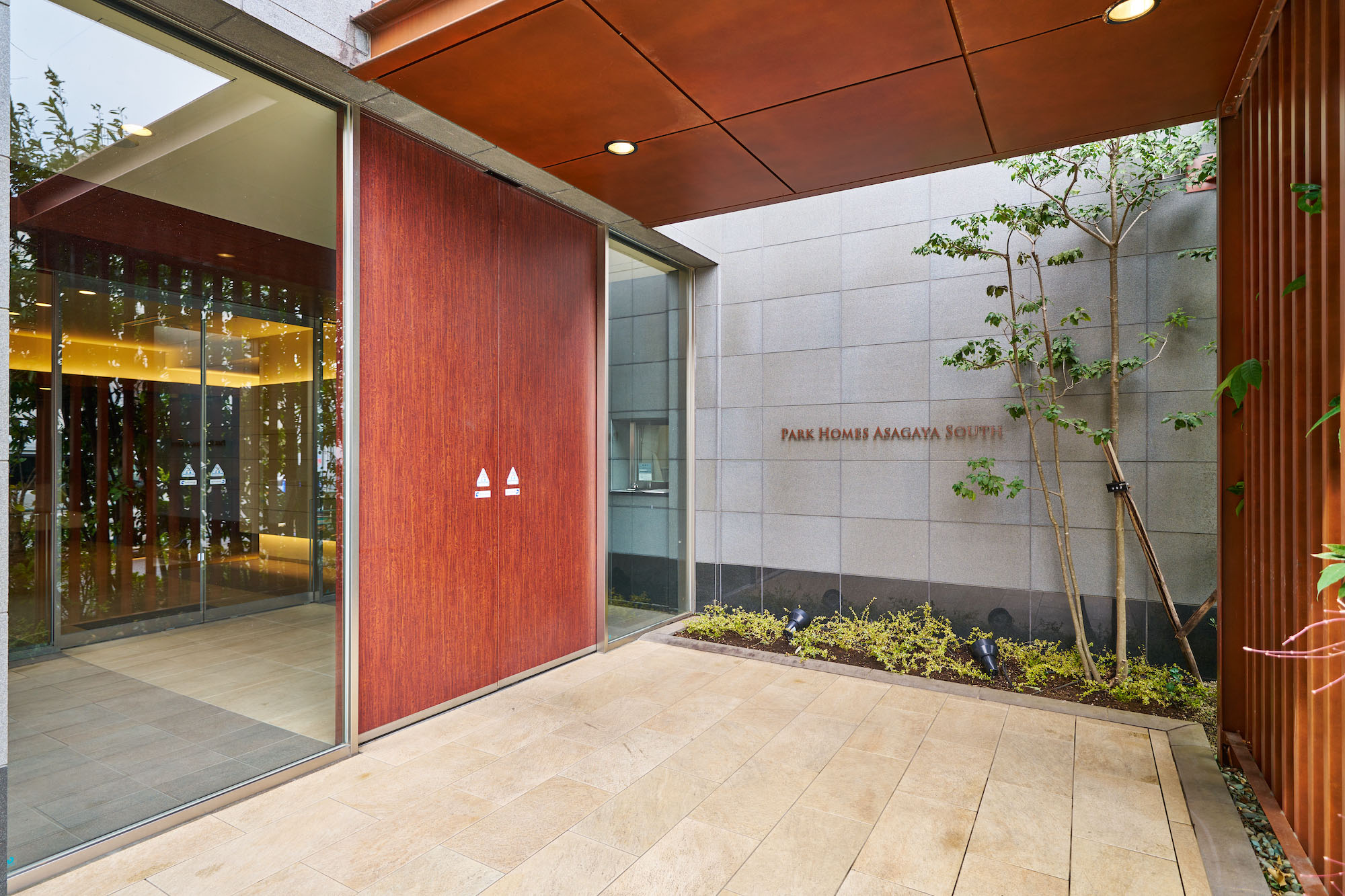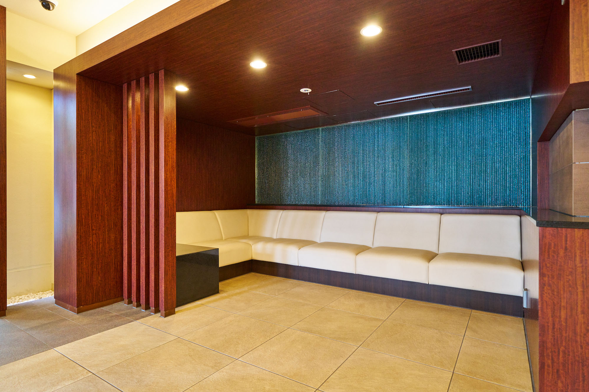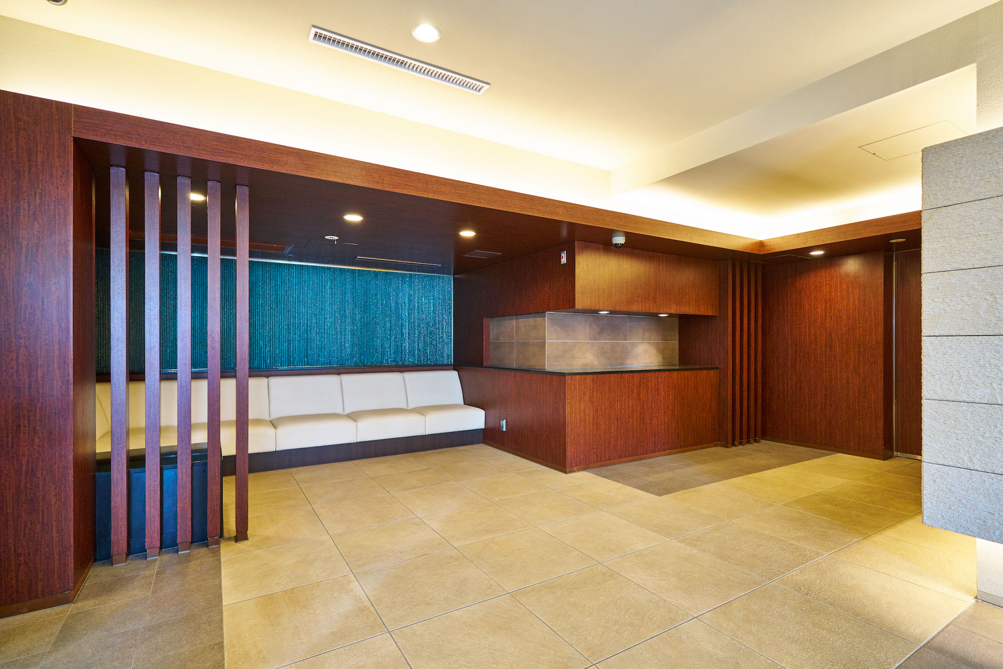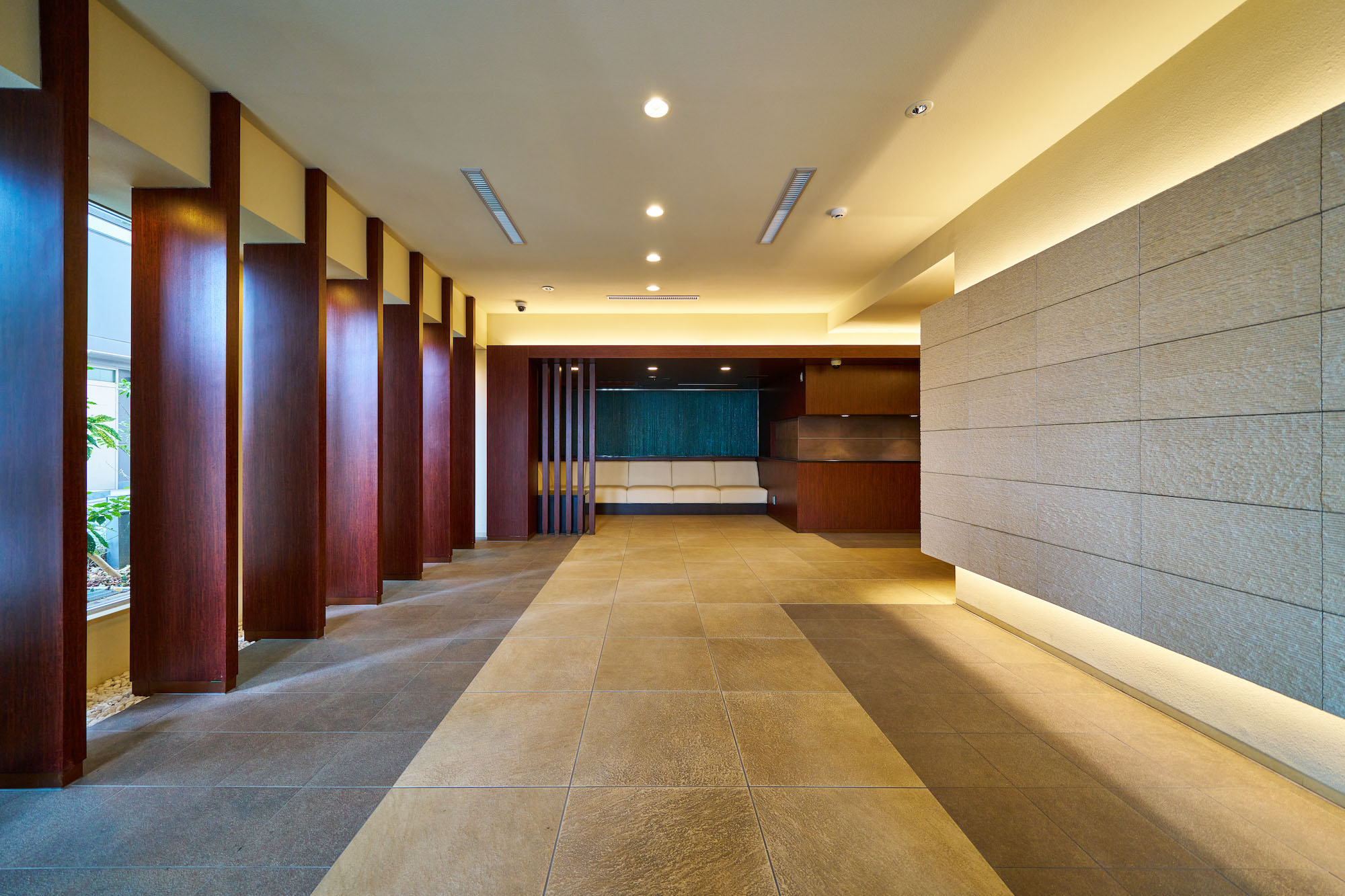 エントランス前はゆったりとした空間が確保され、通りからの視線に配慮した斜入りの動線。シンボルツリーや植込によって潤いが演出されています。エントランスホールは、お気に入りのリゾートホテルに滞在しているような心地よい空間。あたたか味のある色調でまとめた大空間が、住まう方をやさしく迎え入れます。木調ルーバーの間から差し込む自然光のやわらかさと、壁面にとり込んだ間接照明の知的な輝きが、さらなる奥へと誘います。