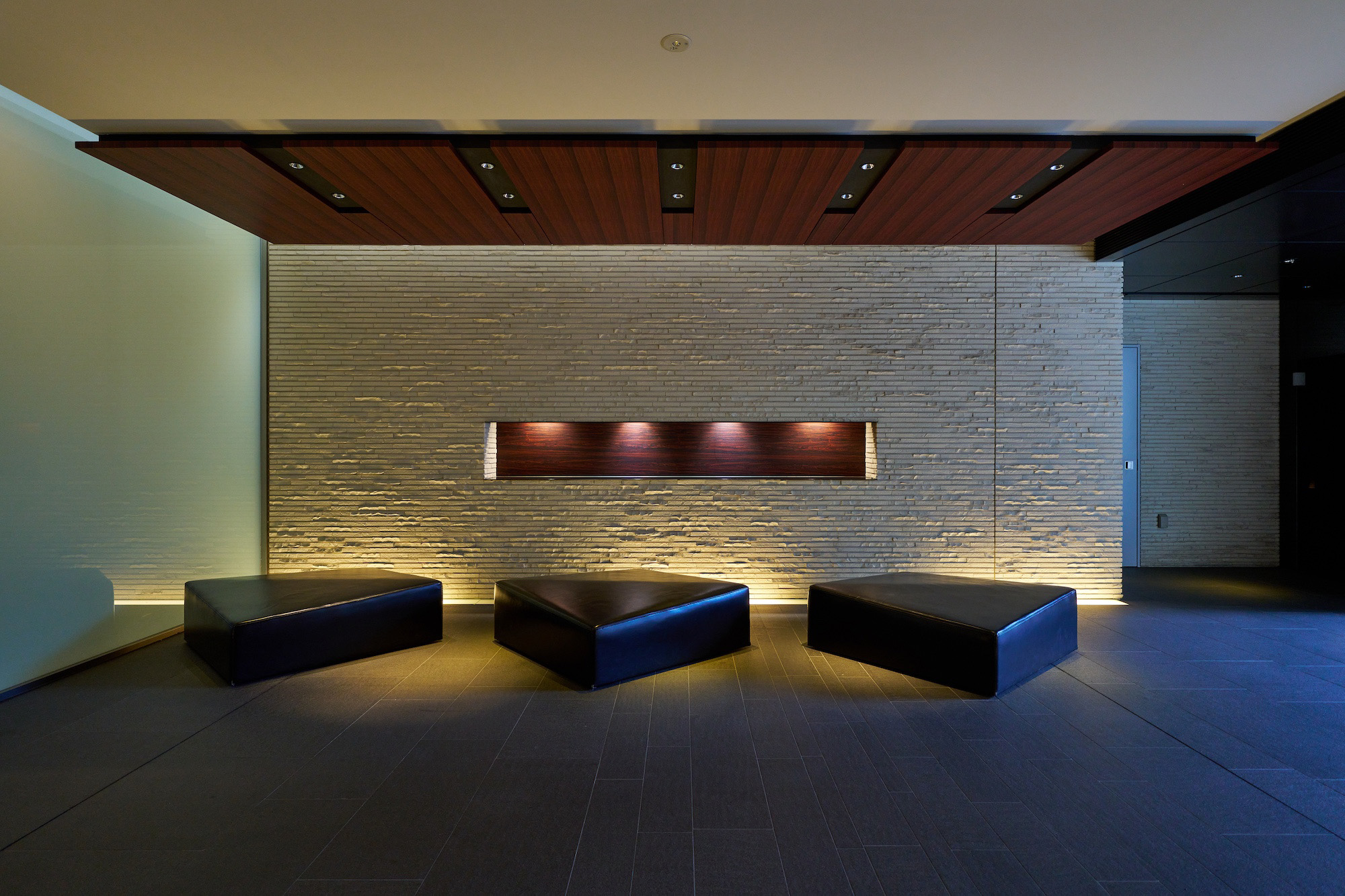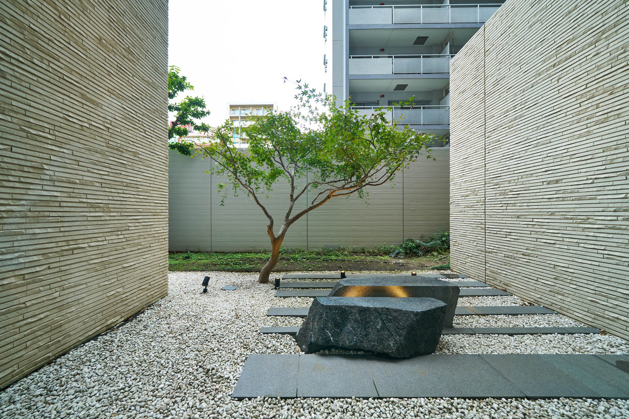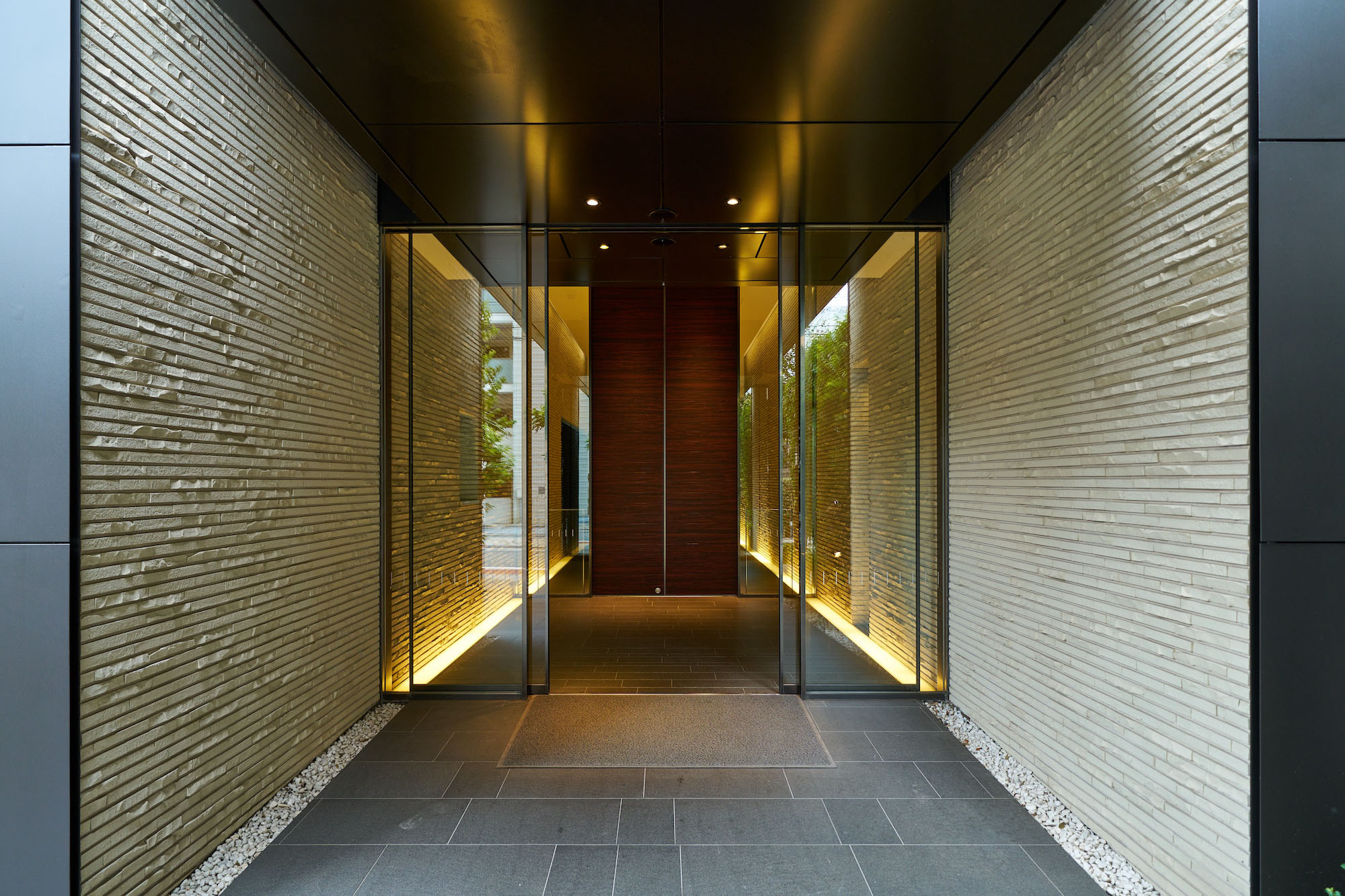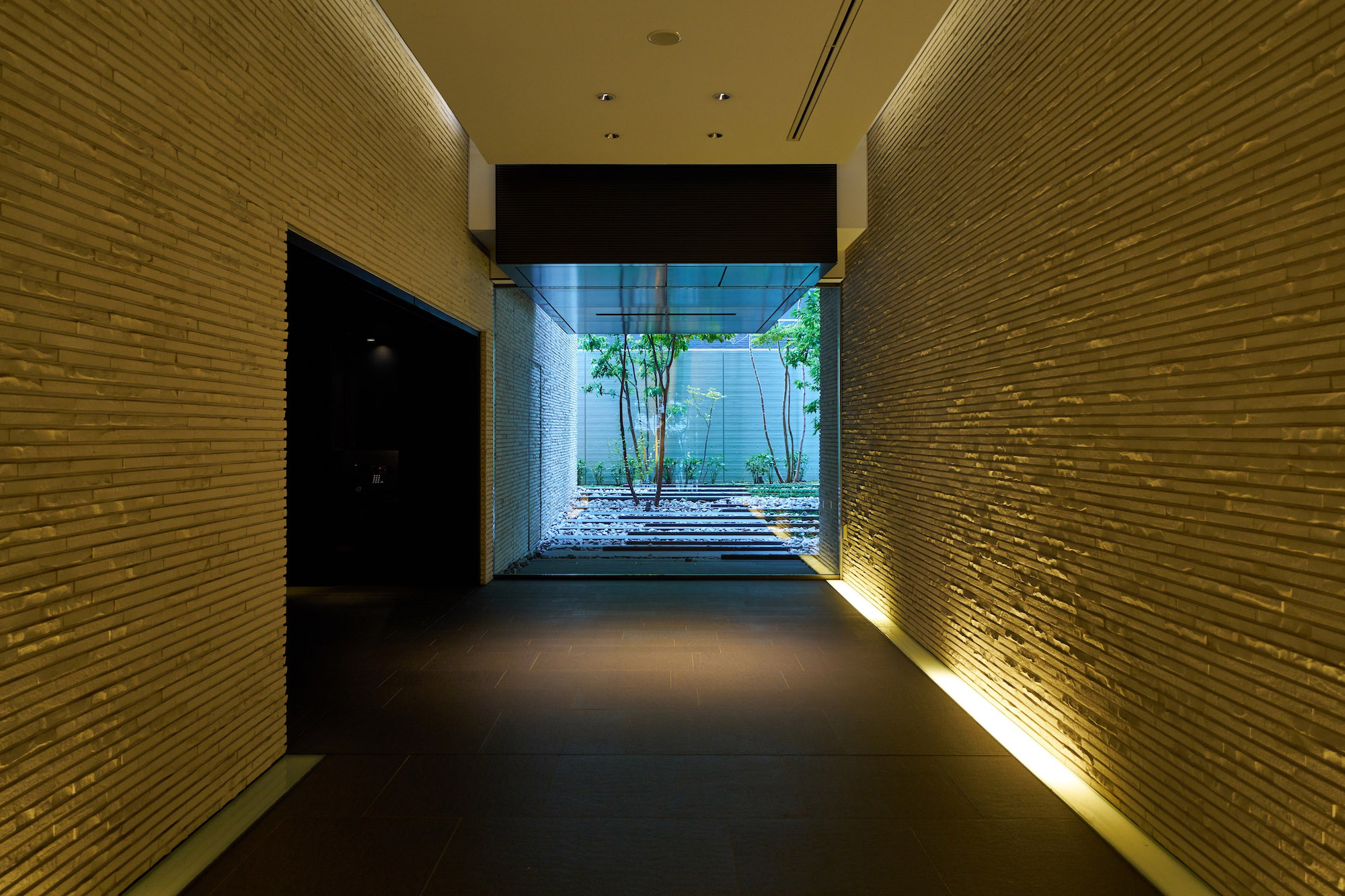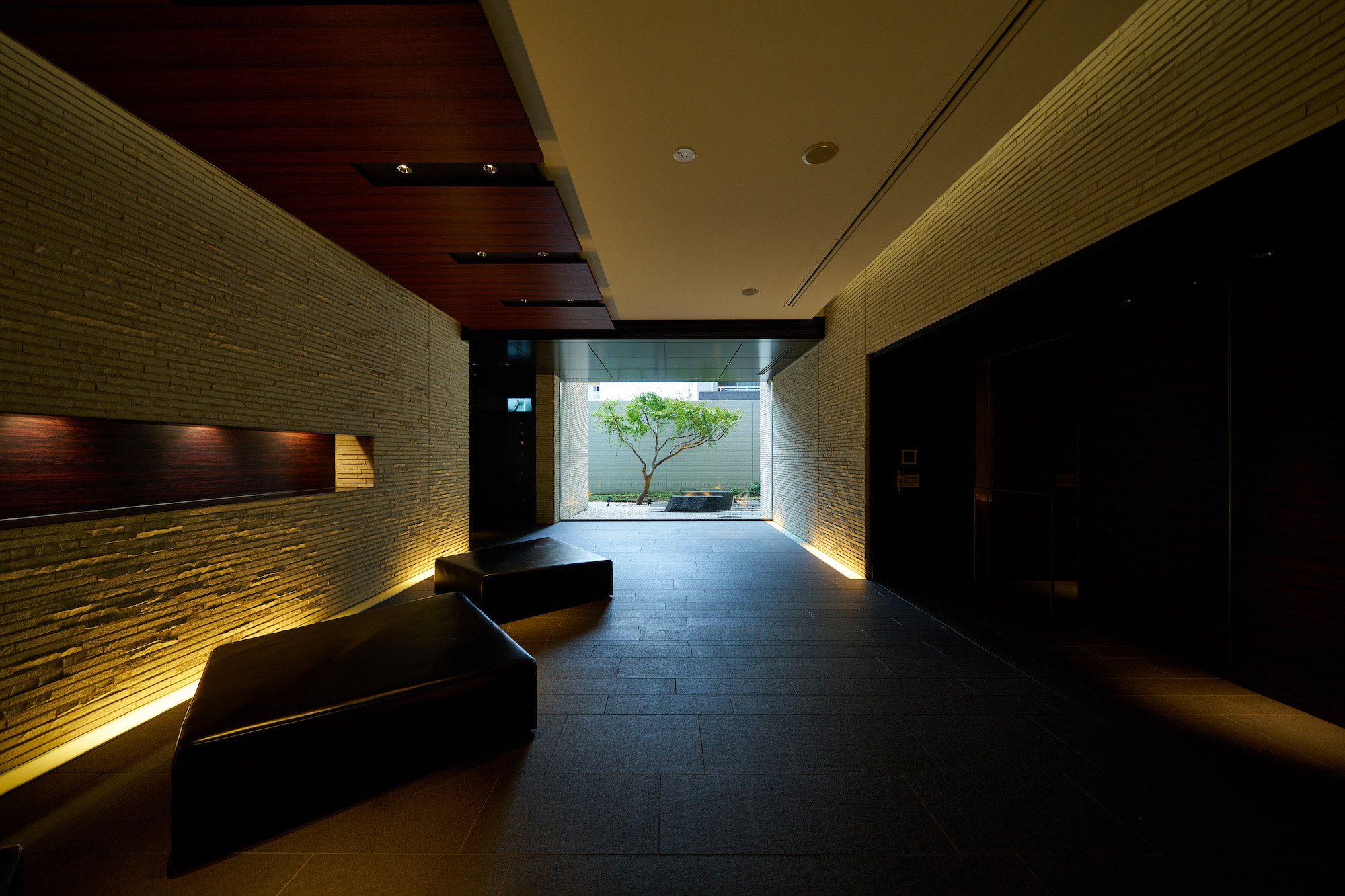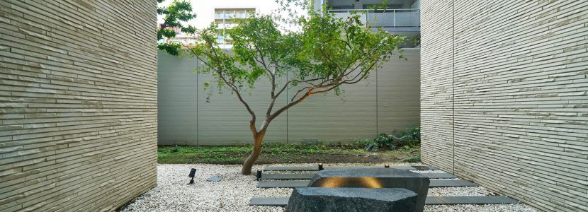 エントランス前のゆとりある空間には、コミュニティスペースとしてベンチをレイアウトし、人々が自然に挨拶を交わすシーンを演出。プライバシー性を高めるアイストップツリーを配し、スタイリッシュで上質な雰囲気に包み込まれたエントランスへと導きます。足を踏み入れるとまず出迎えるのは、街の躍動を忘れさせる静謐なエントランスホールと、「動」的なアンジュレーションが施された中庭。さらに内部へ進むと、上質な落ち着きが漂うラウンジと、一木一石の「静」を表現した絵画的な中庭が配されています。エントランスやラウンジの床には、五感に心地よいとされる「1/fゆらぎ」というリズムを応用したデザインが施されており、重厚感や温かみを生み出す壁の割肌タイルとともに、安らぎの空間を創り上げています。