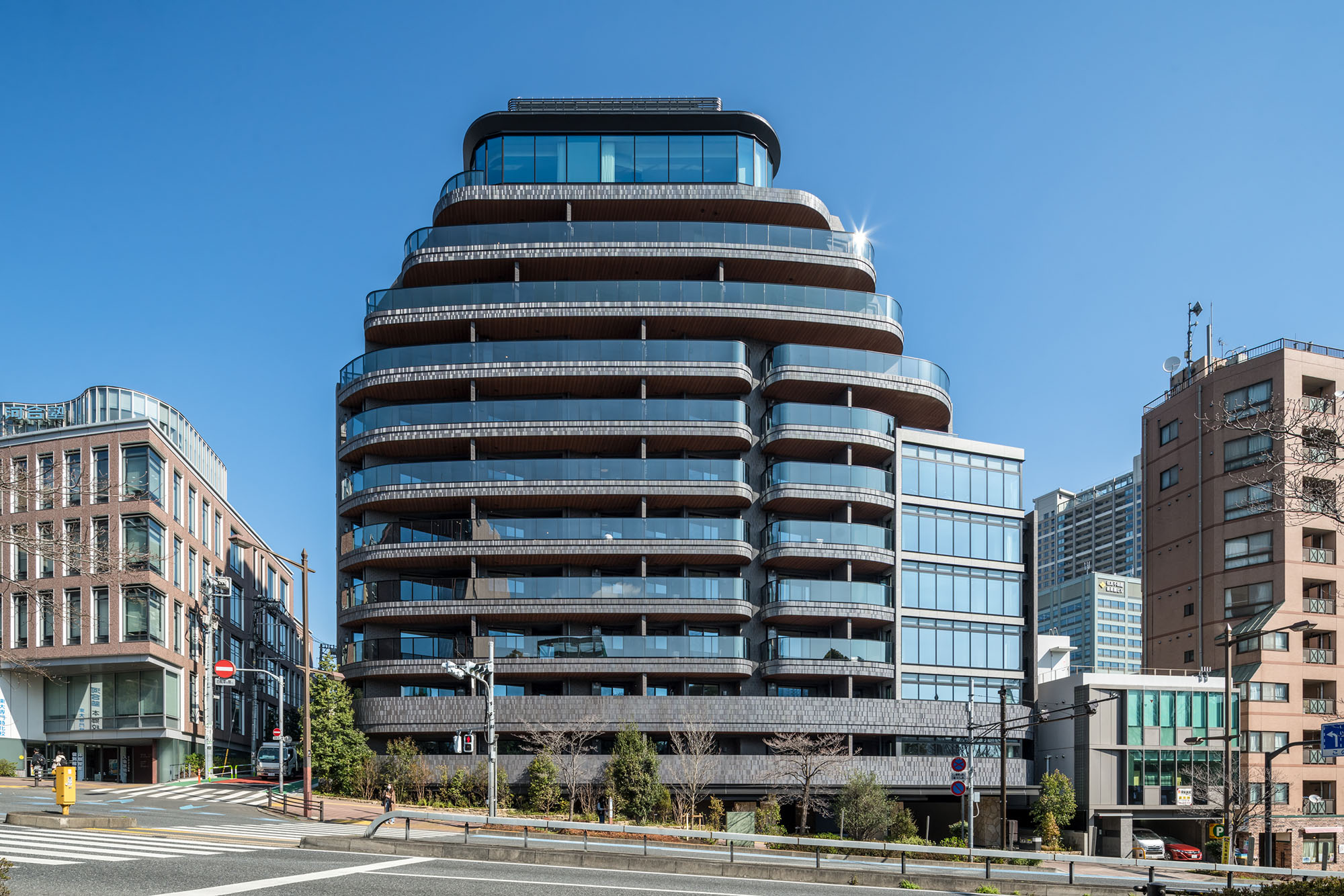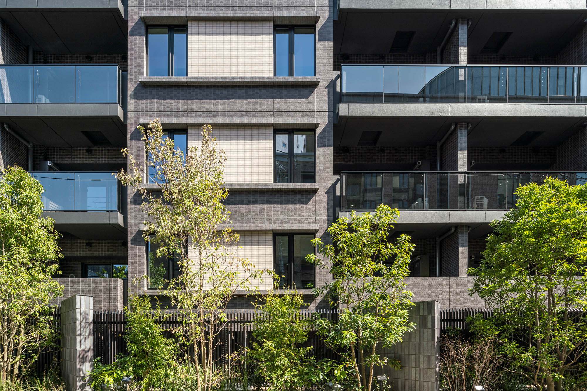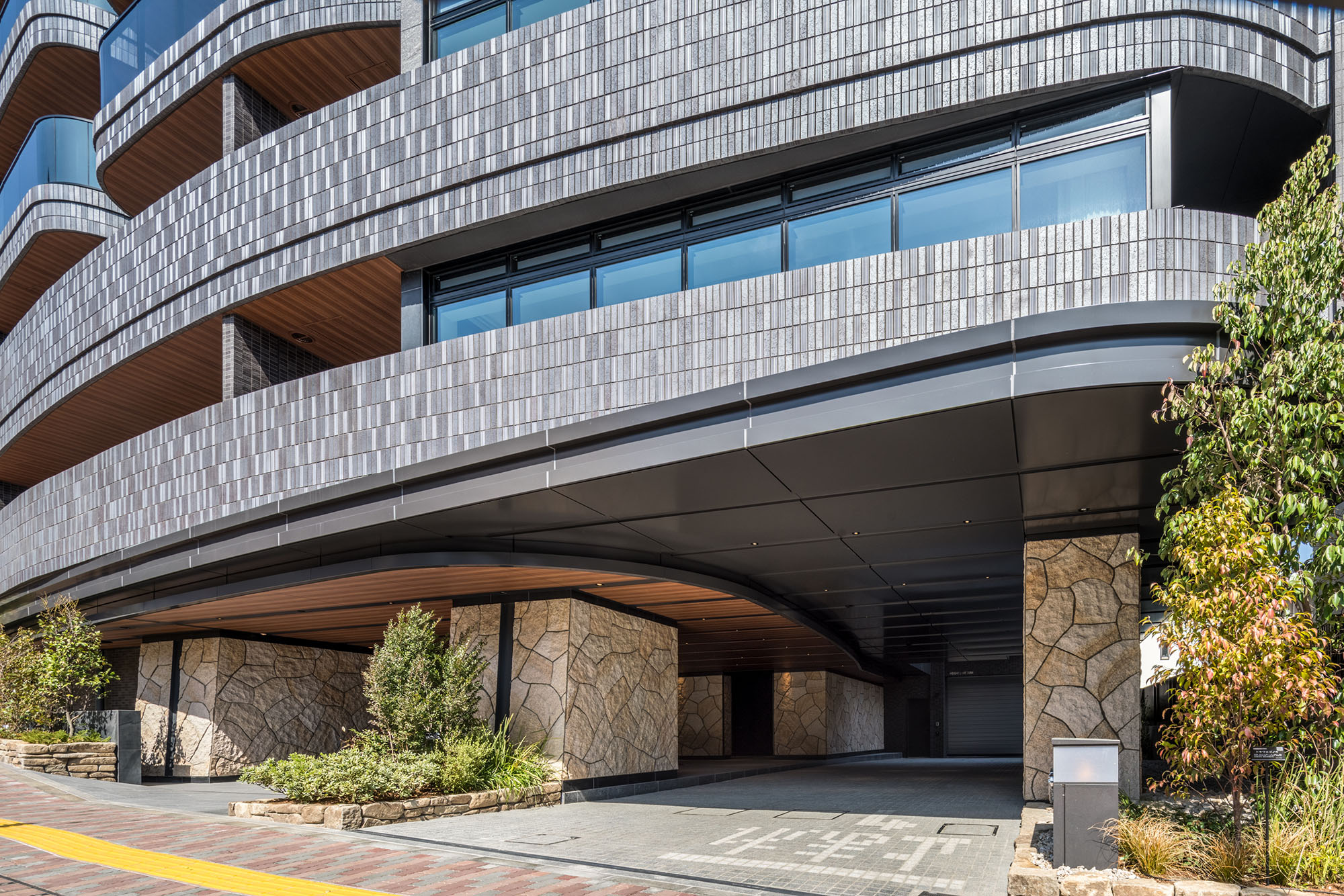 新しい文京邸宅を演出するのは、こだわりを尽くした、フォルムとマテリアル。ファサードを構成するのは、曲線と直線。優美な印象と先進の表情を調和させています。マテリアルにおいても、味わいのあるせっ器質のタイルとシャープな反射ガラスを使用。異なる主張をひとつのカタチとして定着させることで、単調な構成では描くことのできない、奥深さを醸成しています。時間の経過とともに、風合いが増し、愛着が深まっていく一方、エッジィなイメージを保ち続け、日々新しさを感じられる邸宅が表現されています。